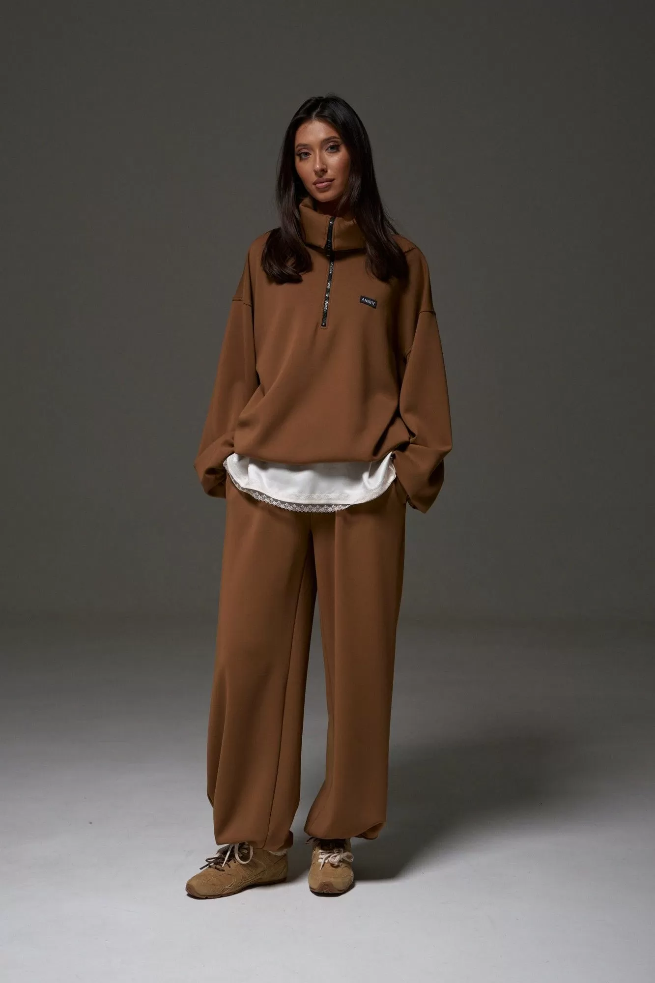 Брюки выполнены из трикотажного полотна кофейного цвета. Характеристики: прямой крой, пояс на резинке с кулиской, в боковых швах карманы, накладные карманы на задней части брюк, штанина внизу на резинке с фиксатором. Длина по боковому шву 104 см.
