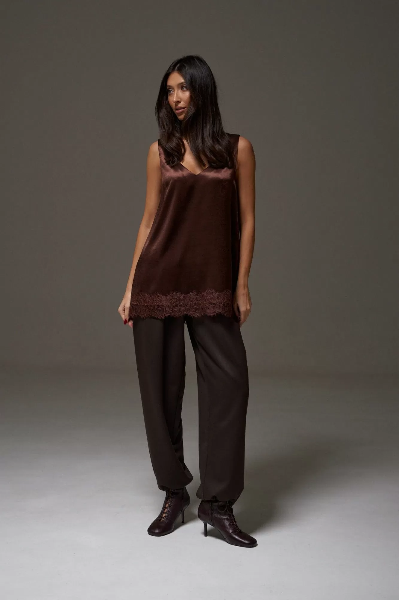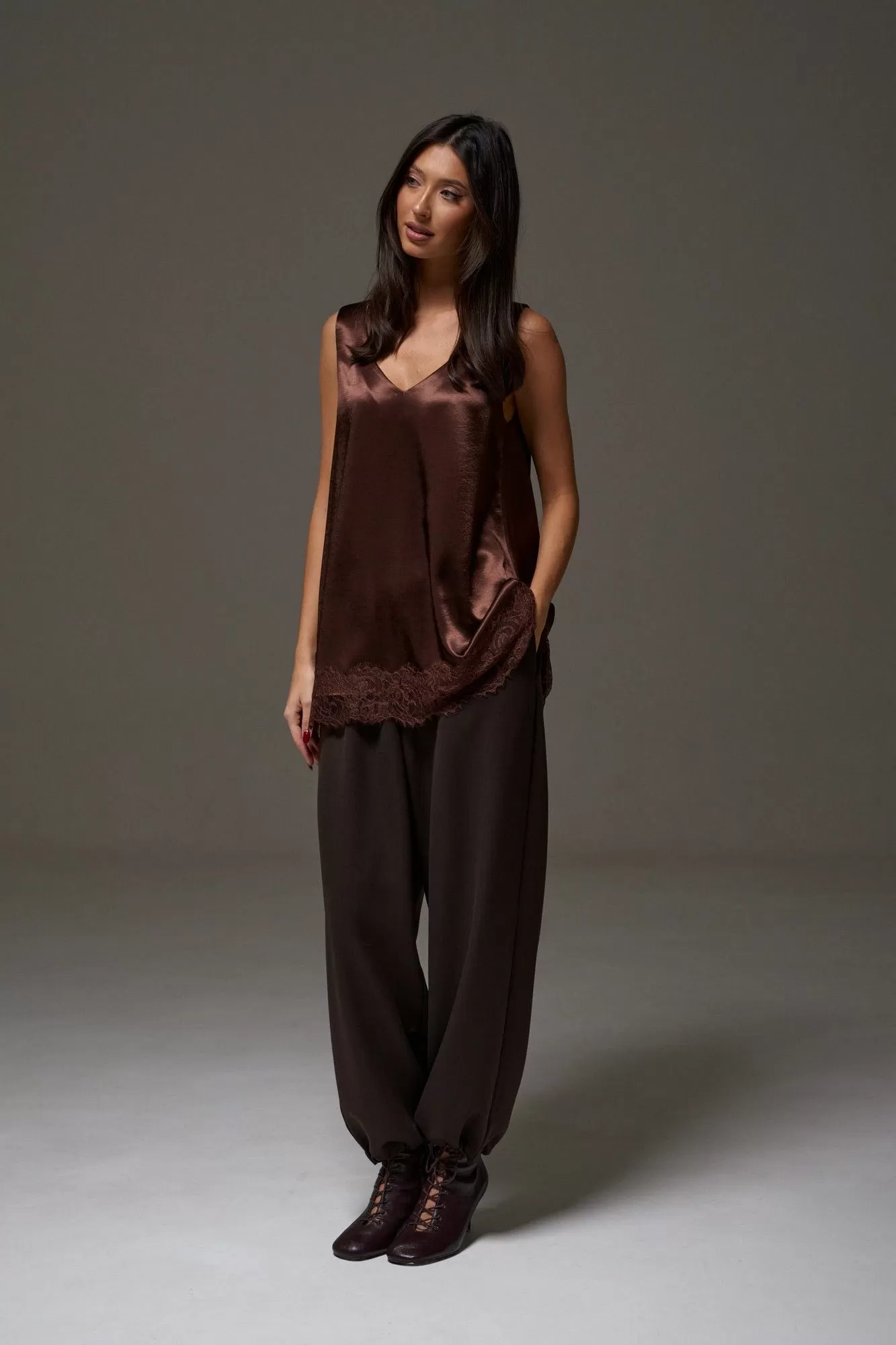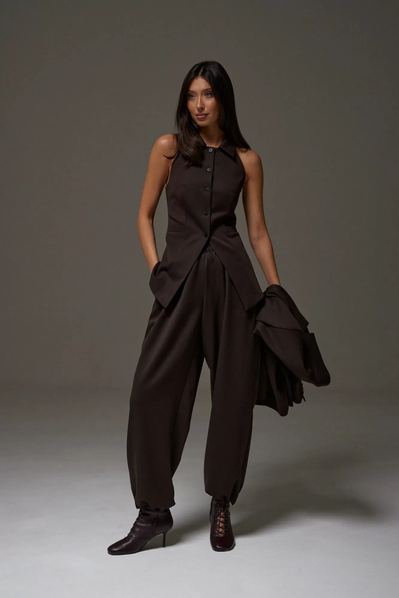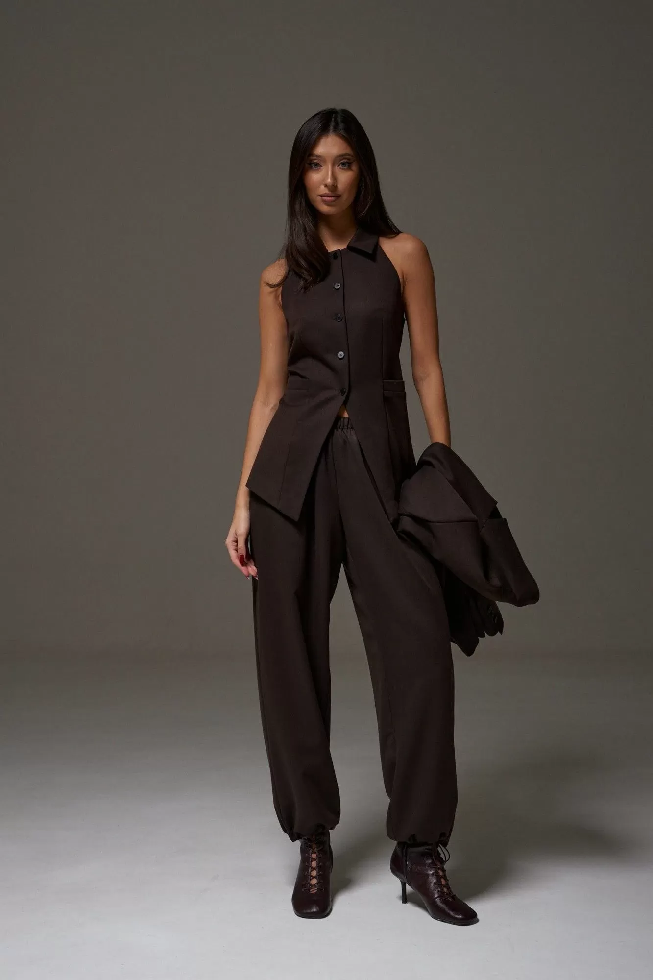Брюки свободного кроя. Выполнены из плотной текстильной ткани шоколадного цвета. Пояс на резинке. Застёжки нет. В боковых швах карманы. Низ брючины на резинке с фиксатором (регулируется). Длина брюк 100 см