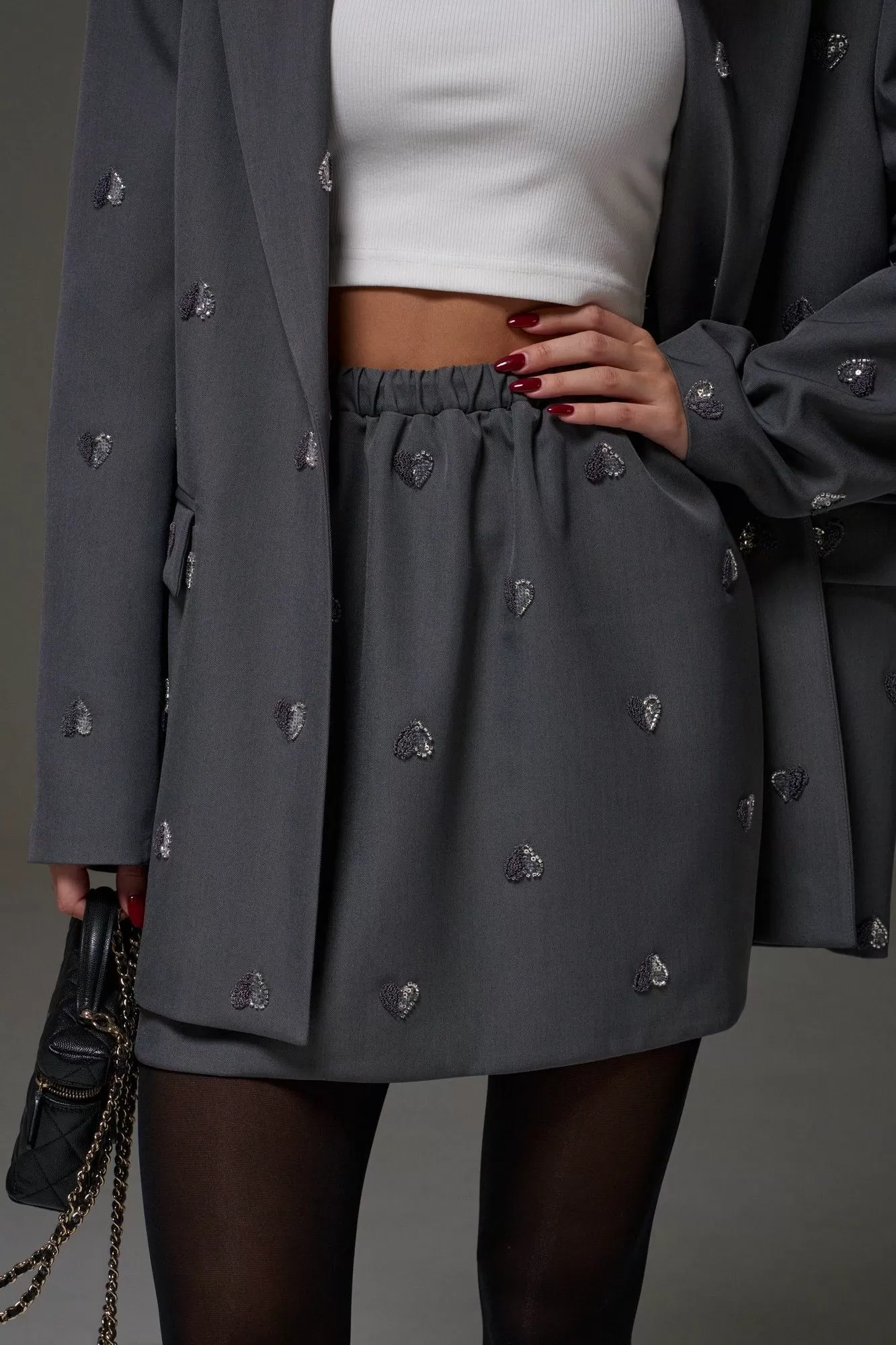 Юбка прямого кроя, выполнена из костюмной ткани серого цвета, с декоративной вышивкой в виде сердечек. Характеристики: прямой крой, на брендированной подкладке, пояс на резинке. Длина по боковому шву 44 см.