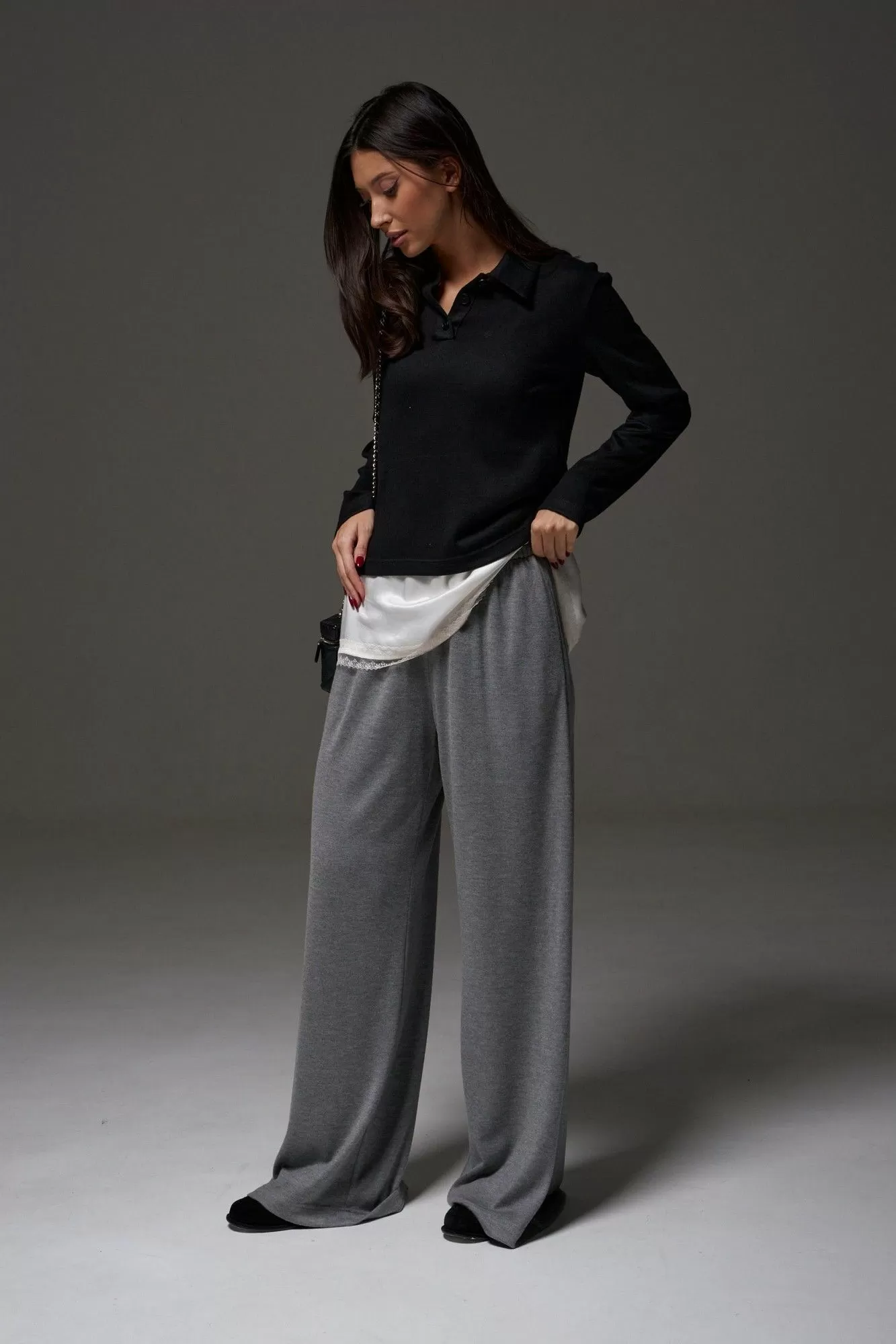 Джемпер прямого кроя. Выполнен из мягкого трикотажного полотна. Отложной воротник. В области горловины застежка на планке на петли пуговички. Рукав втачной. Длина рукава от края горловины 73 см. Длина спинки 56 см