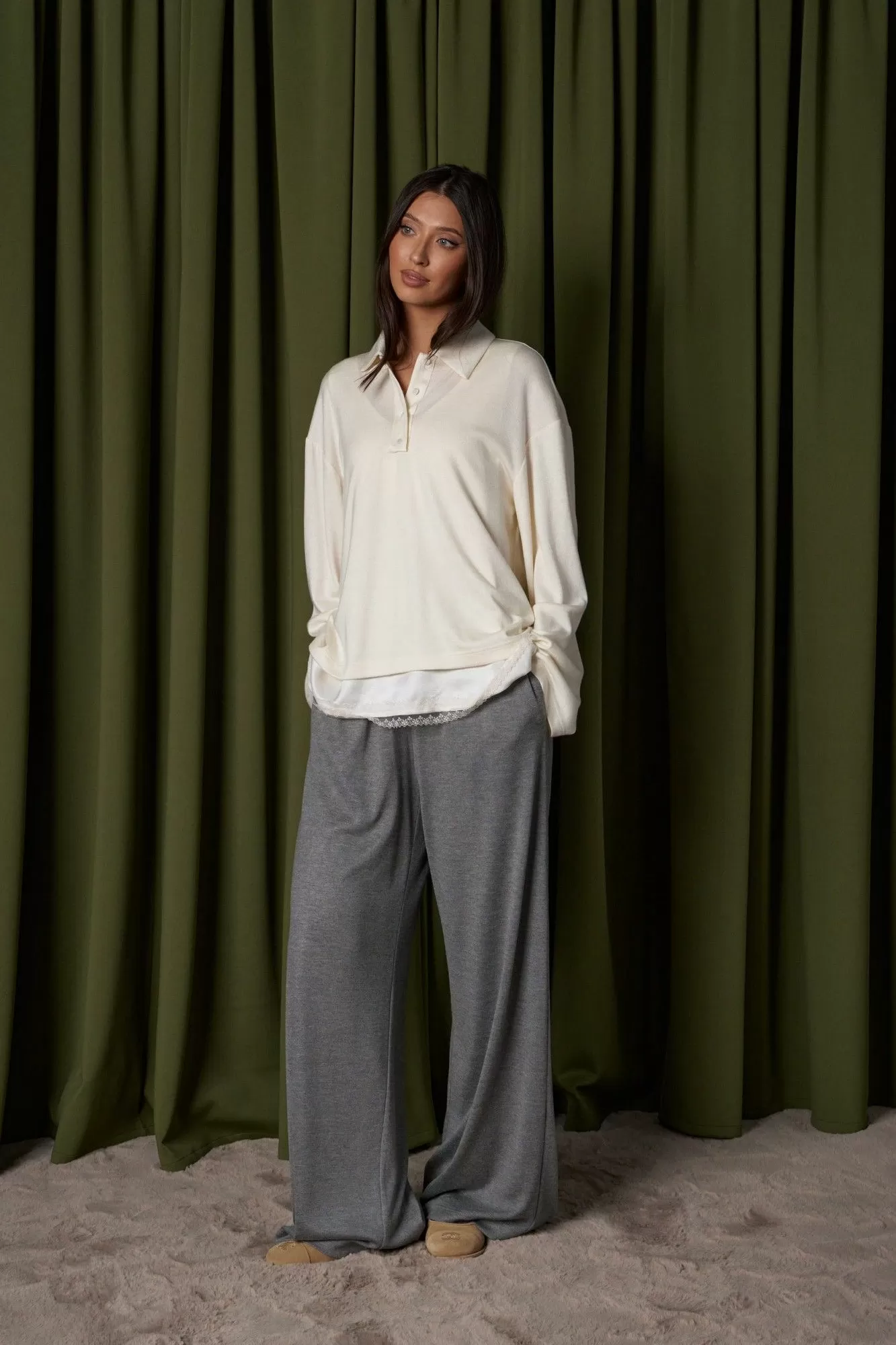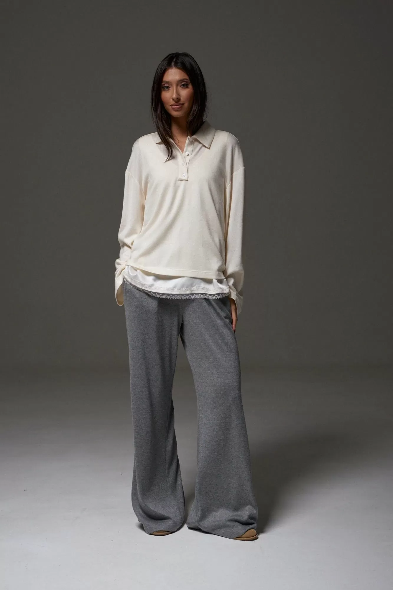 Джемпер-поло. Выполнен из трикотажного полотна в нежно-сливочном оттенке. Характеристика: прямой крой, отложной воротник, центральная застёжка на пуговички, рукав втачной и немного спущен. Длина рукава от края горловины 78 см. Длина спинки от края горловины 60 см.