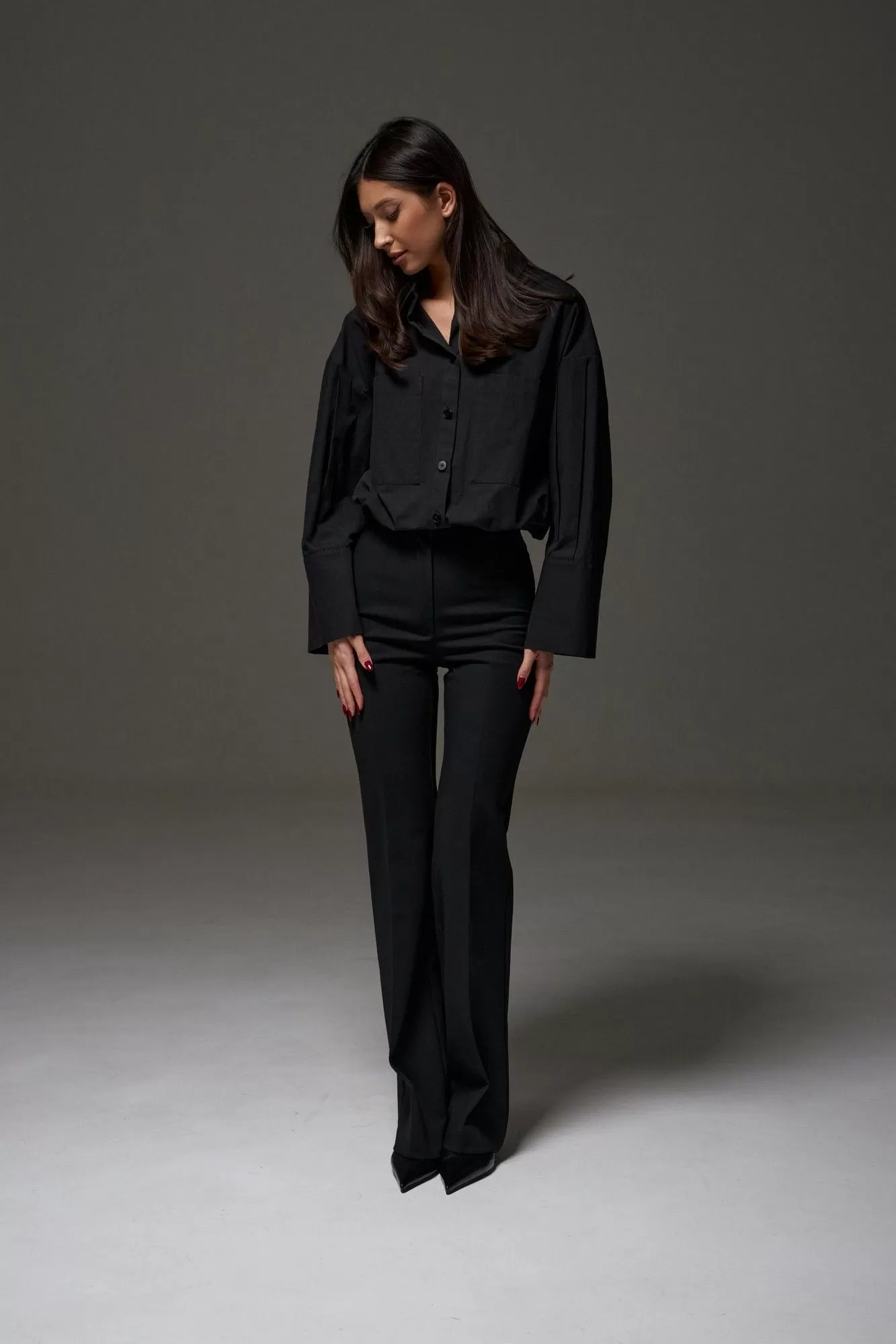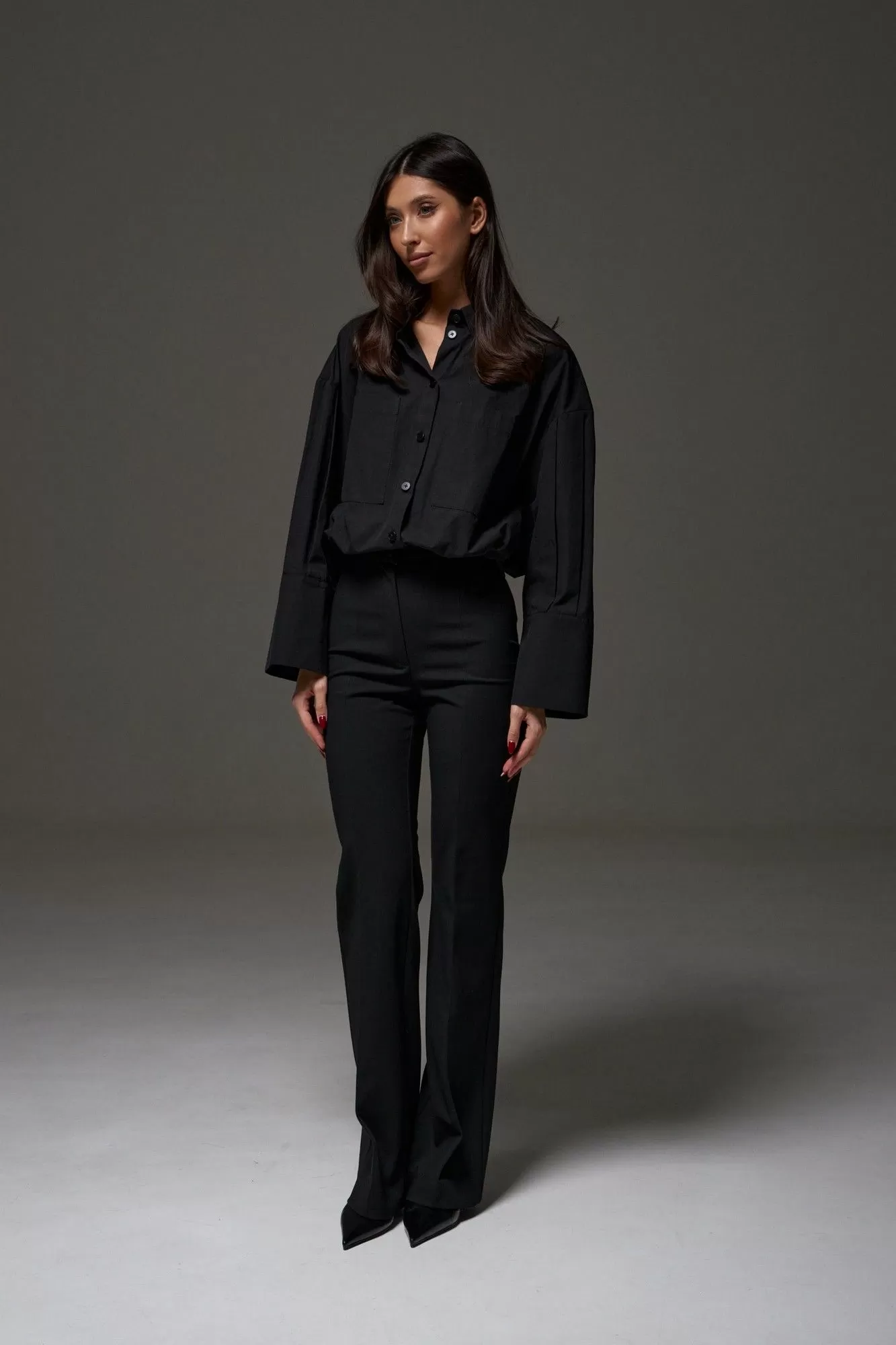 Рубашка прямого свободного кроя выполнена из хлопкового полотная черного цвета. Характеристики: прямой крой, отложной воротник на стойке, застежка центральная на петли пуговицы, по переду крупные карманы, рукав спущен, по рукаву декоративные складки, по низу рукава широкая манжета, спинка отрезная, низ изделия на резинке с фиксатором. Длина по спинке 55 см, длина рукава от края горловины 71 см.