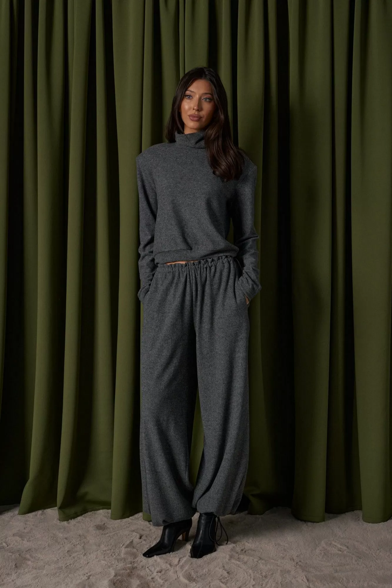 Джемпер укороченный прямого свободного кроя. Выполнен из мягкого трикотажа светло-серого цвета. Горловина-стойка, в естественную складку. Есть подплечники (съёмные). Длина рукава от линии втачивания 61 см. Длина спинки 50 см