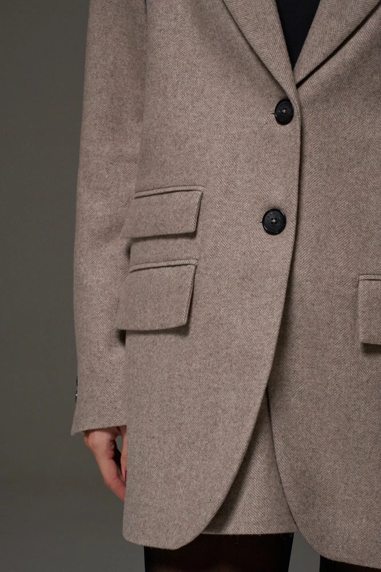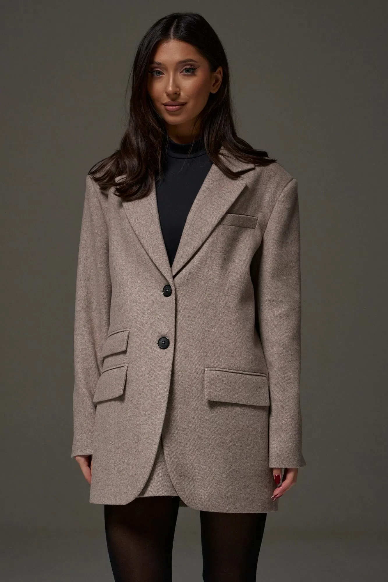 Жакет прямого свободного кроя выполнен из фактурного полотна. Характеристики: прямой свободный крой, подплечники, подкладка, отложной воротник с лацканом, застежка центральная на петли пуговицы, по переду прорезной кармашек «обманка», функциональный карман с клапаном, рукав втачной прямого кроя, по низу рукава нашиты пуговички. низ изделия с плавным срезом, в комплекте пояс из ткани основного изделия. Длина по спинке 80 см, длина рукава 61 см.