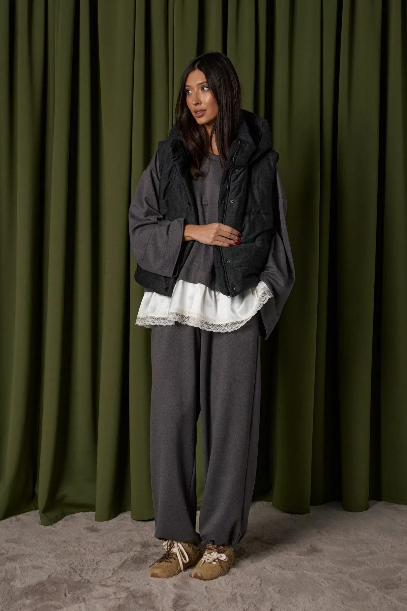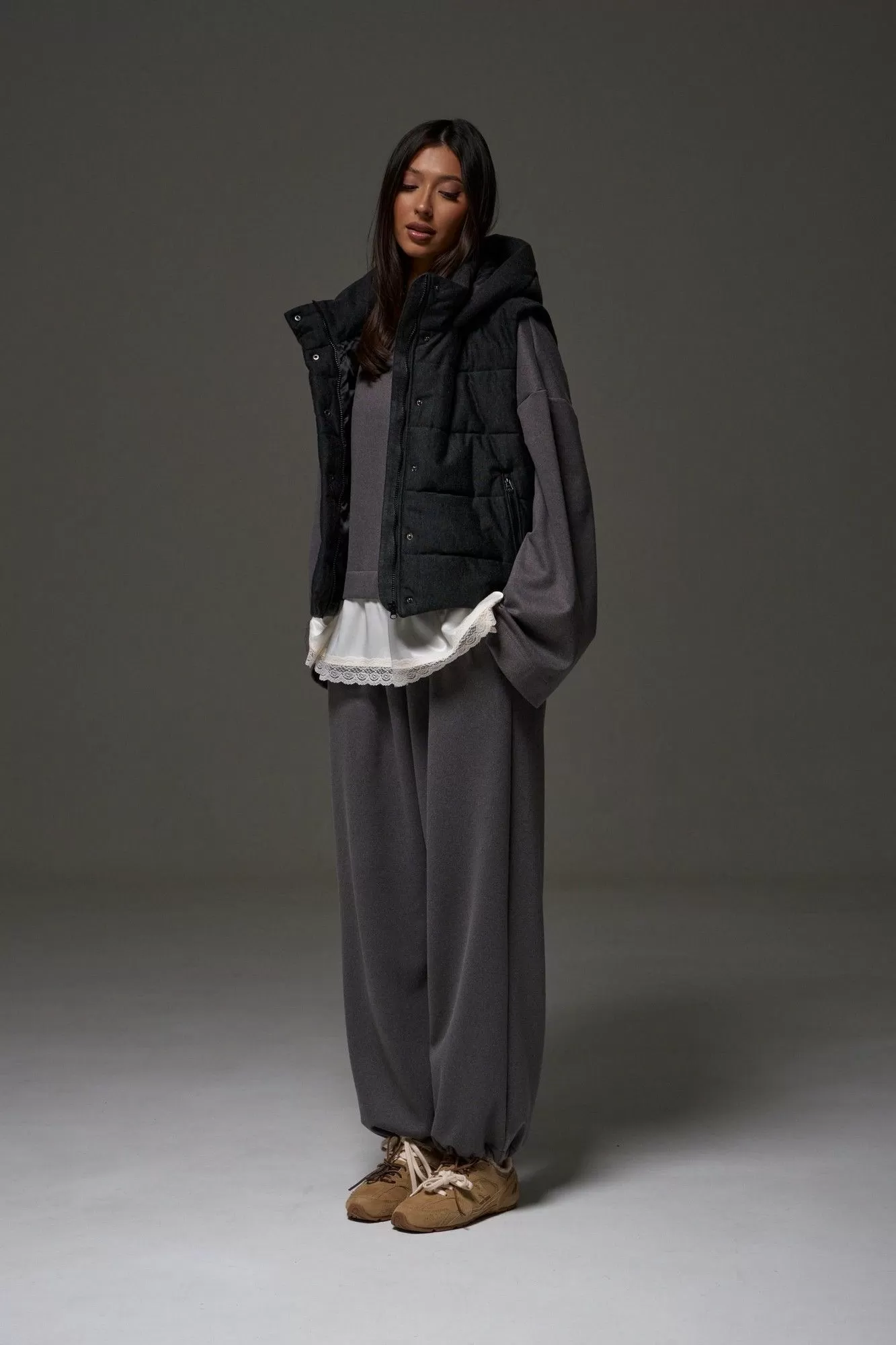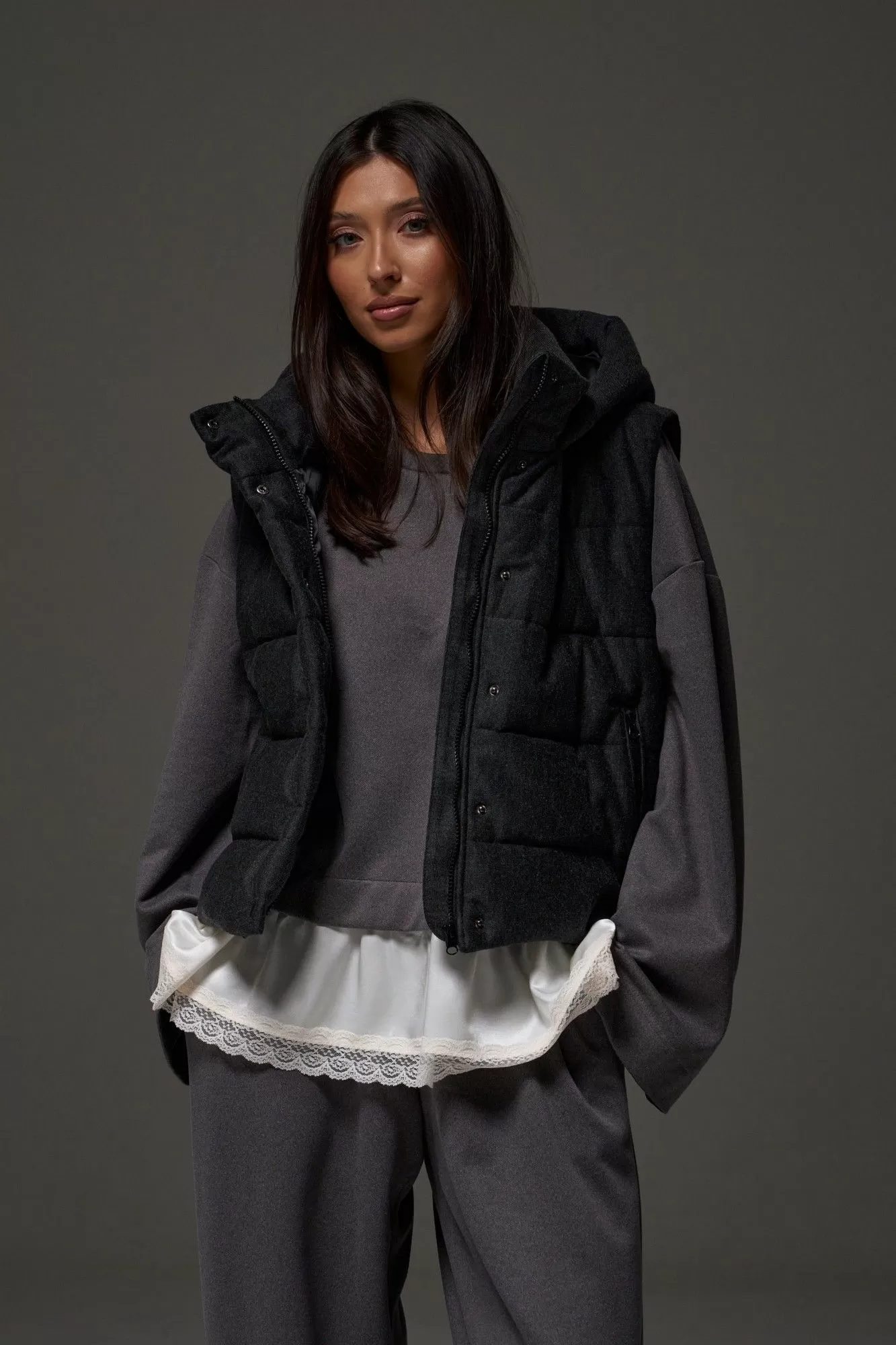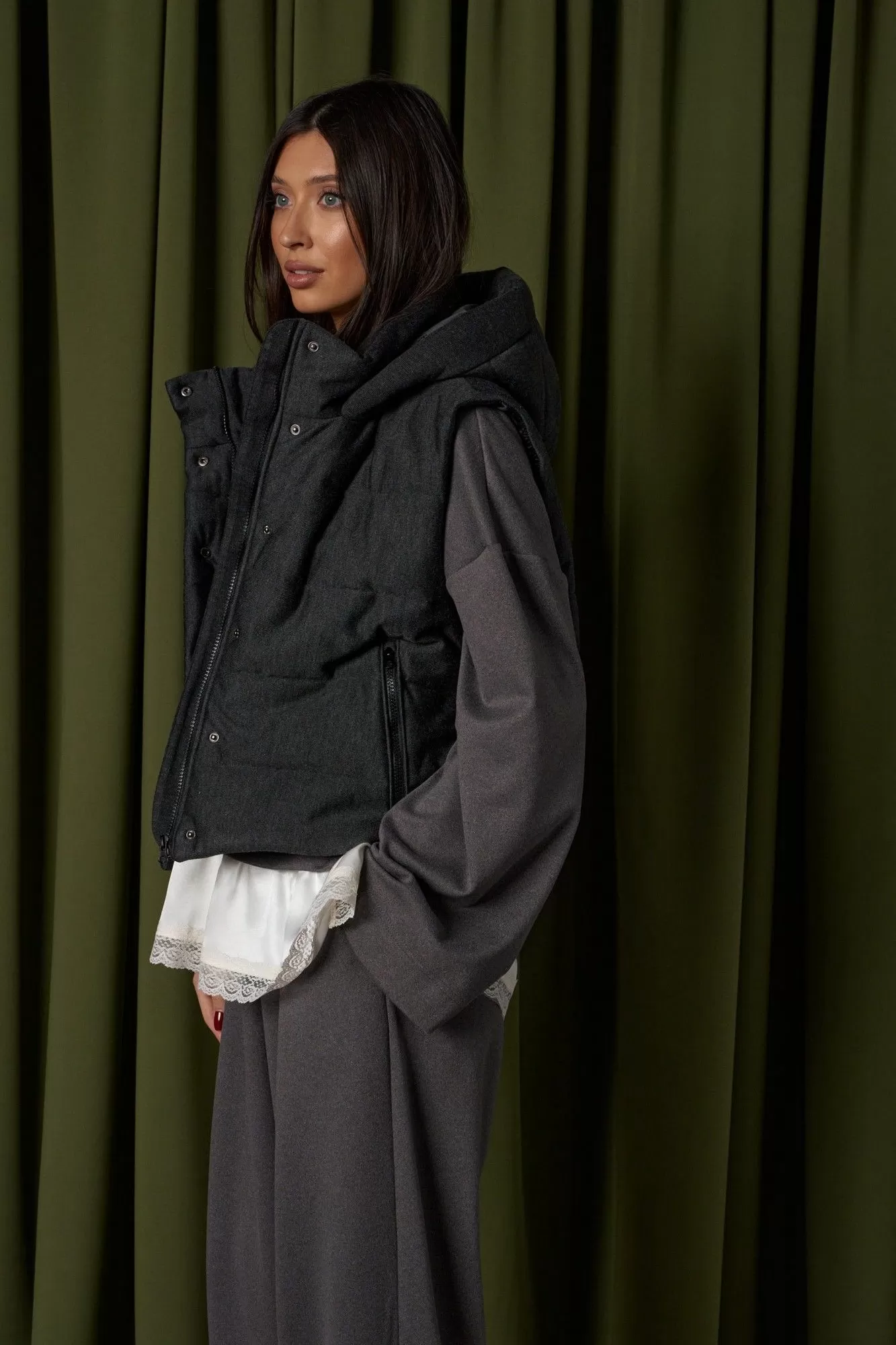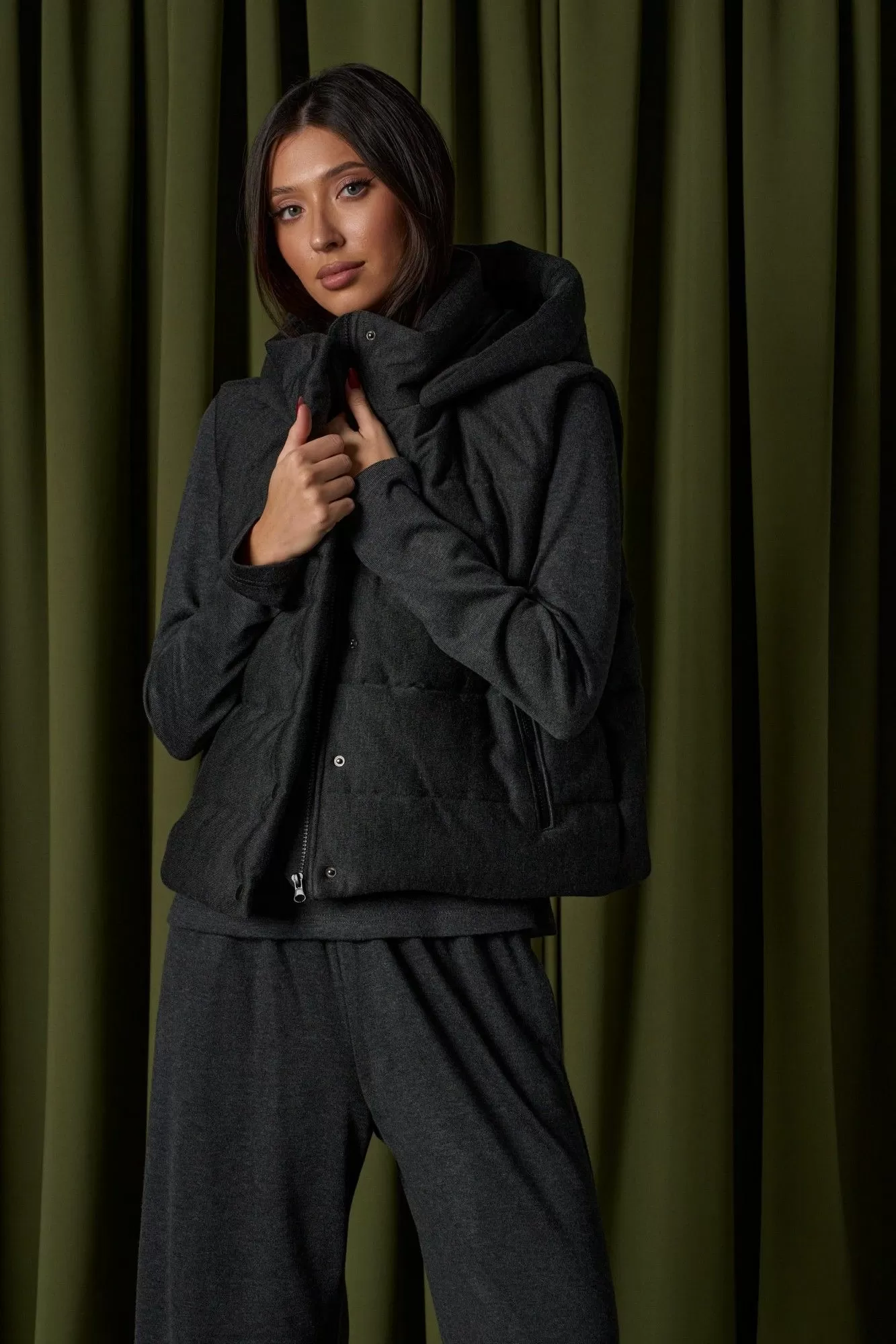 Жилет укороченный, выполнен из стеганной трикотажной ткани графитового цвета. Характеристика: жилет А-силуэта, вортник стойка, капюшон цельный с жилетом, центральная застежка на молнию, скрывается под планкой на кнопках, боковые карманы на молнии, по низу изделия резинка с фиксаторами, брендированный подклад, спинка цельнокройная. Длина изделия от края горловины по спинке 58см.