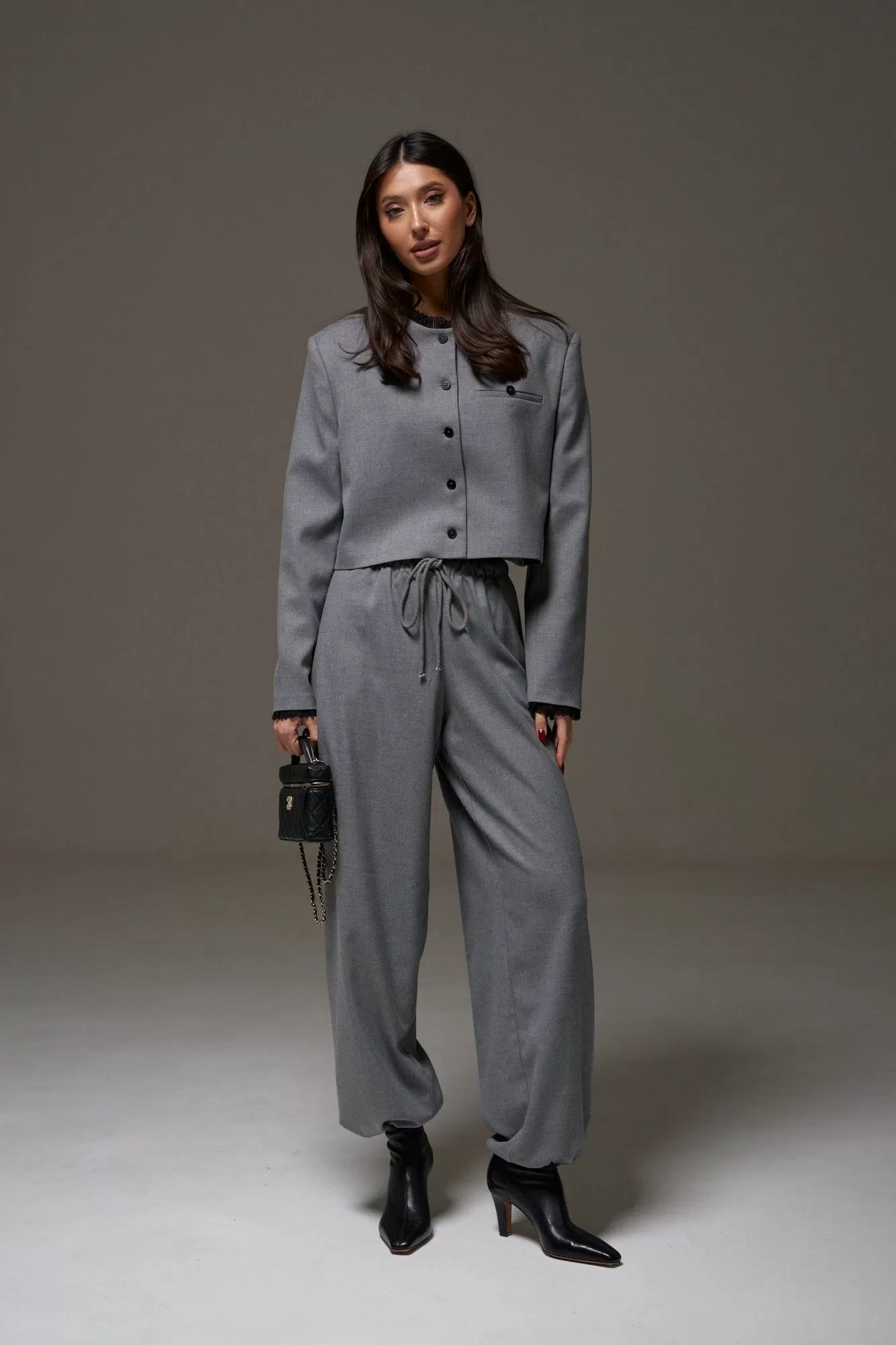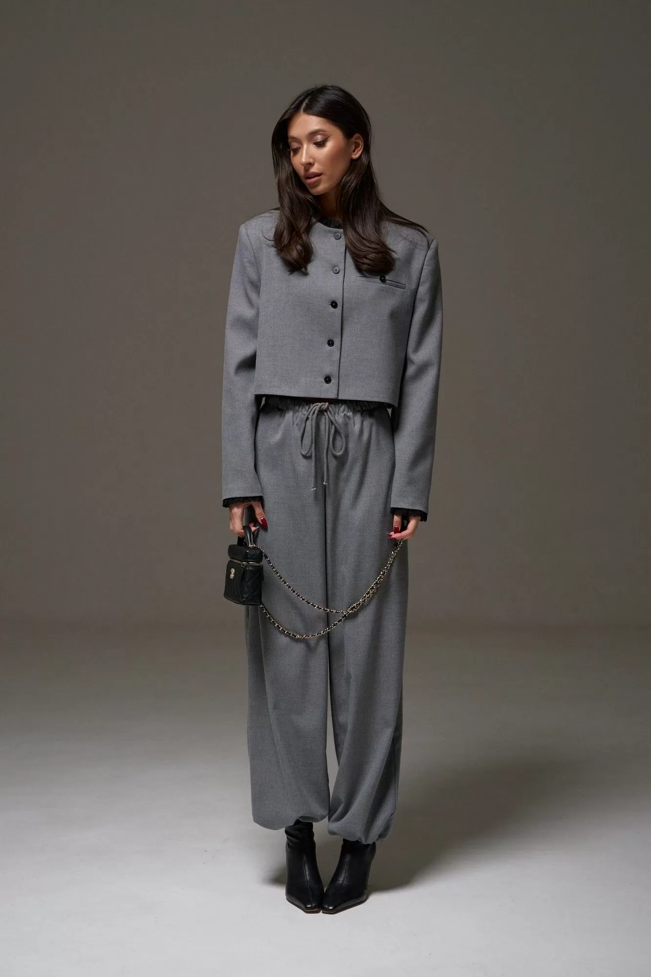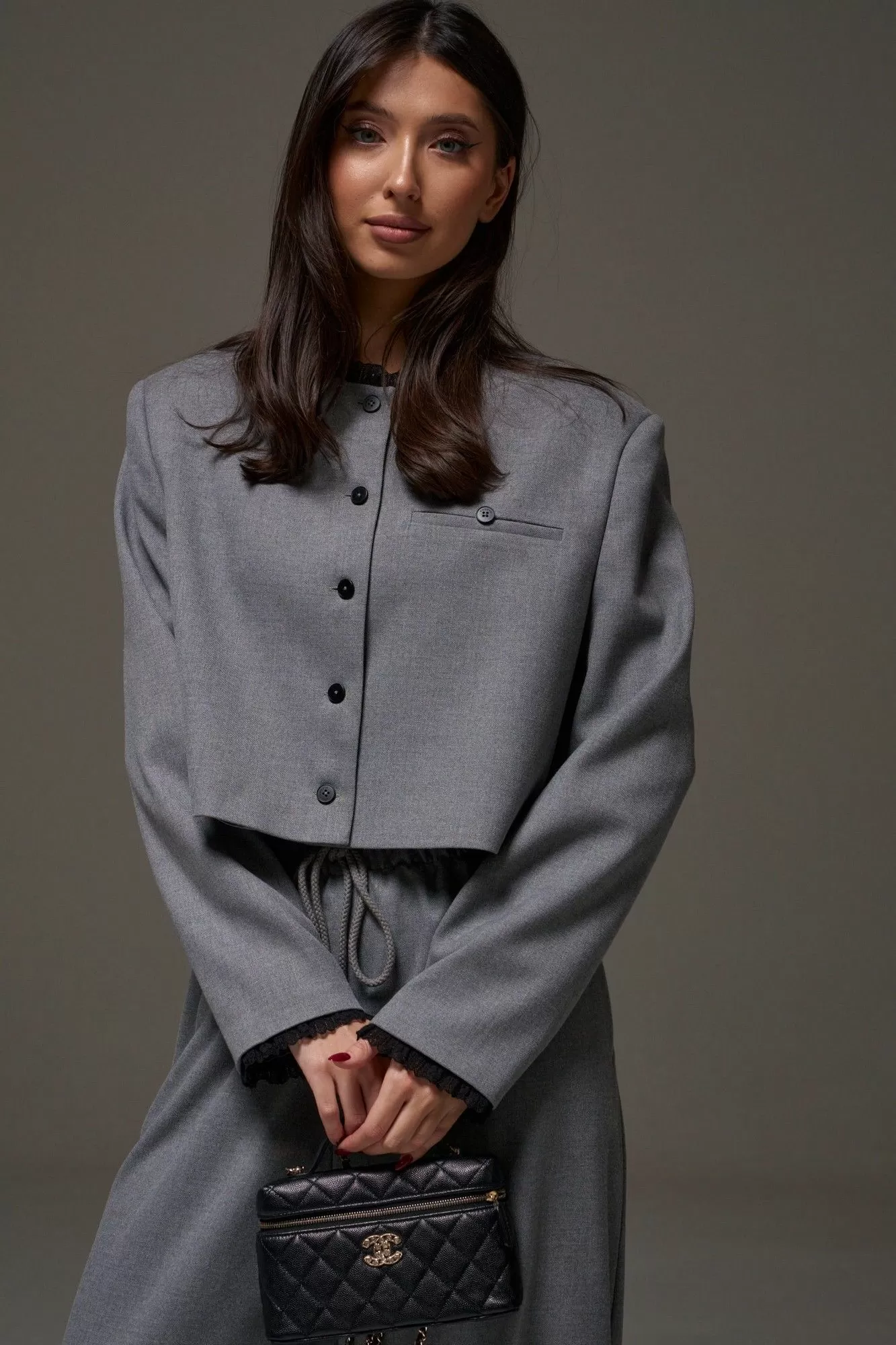Жакет укороченный прямого свободного кроя. Выполнен из текстильной ткани серого цвета. С подкладкой. Горловина круглая. По переду на уровне груди слева имитация кармана с листочкой с пуговицей. Застёжка центральная - пуговицы. Рукав втачной. Горловина и низ рукава декорированы кружевом. Длина рукава от линии втачивания 63 см. Длина спинки 43 см