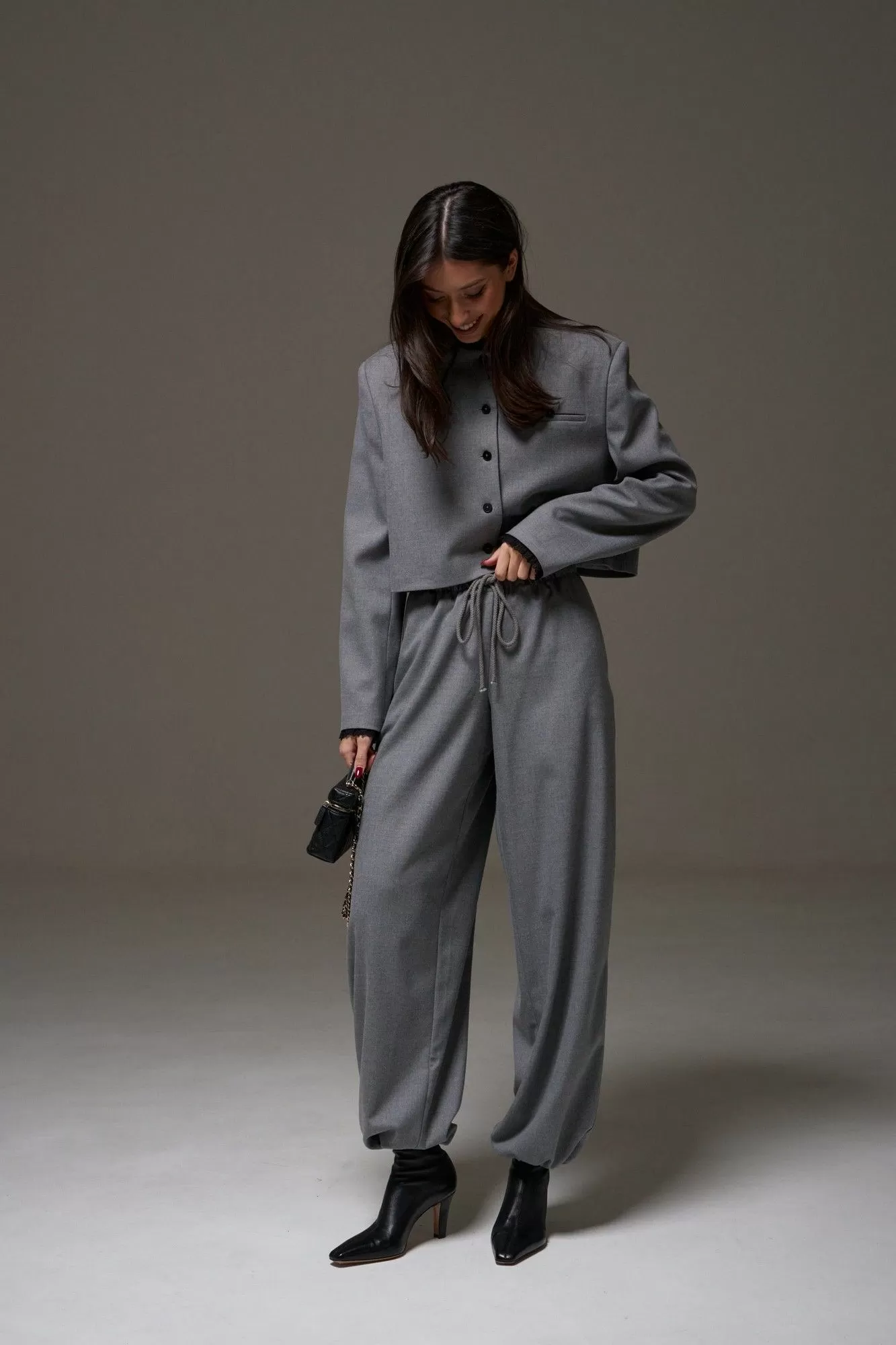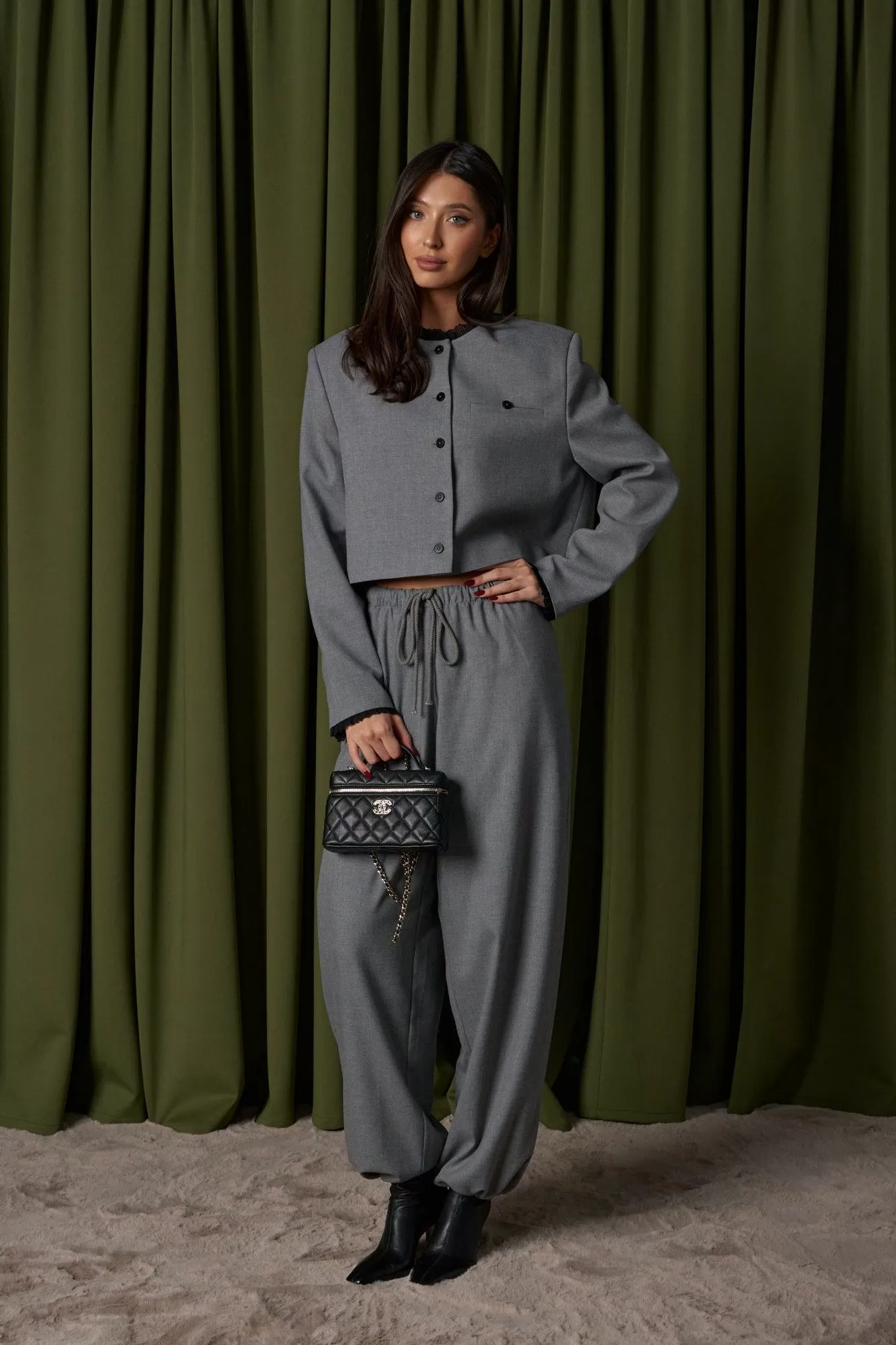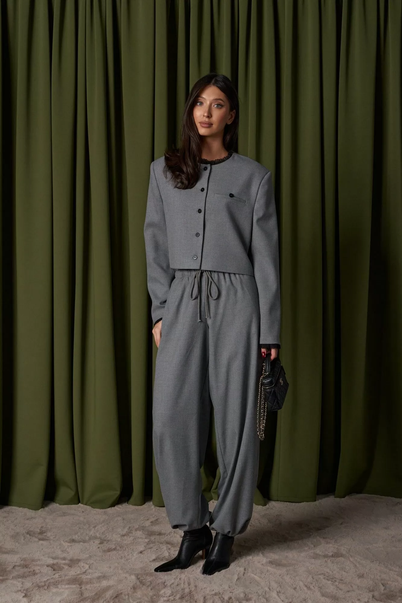 Жакет укороченный прямого свободного кроя. Выполнен из текстильной ткани серого цвета. С подкладкой. Горловина круглая. По переду на уровне груди слева имитация кармана с листочкой с пуговицей. Застёжка центральная - пуговицы. Рукав втачной. Горловина и низ рукава декорированы кружевом. Длина рукава от линии втачивания 63 см. Длина спинки 43 см