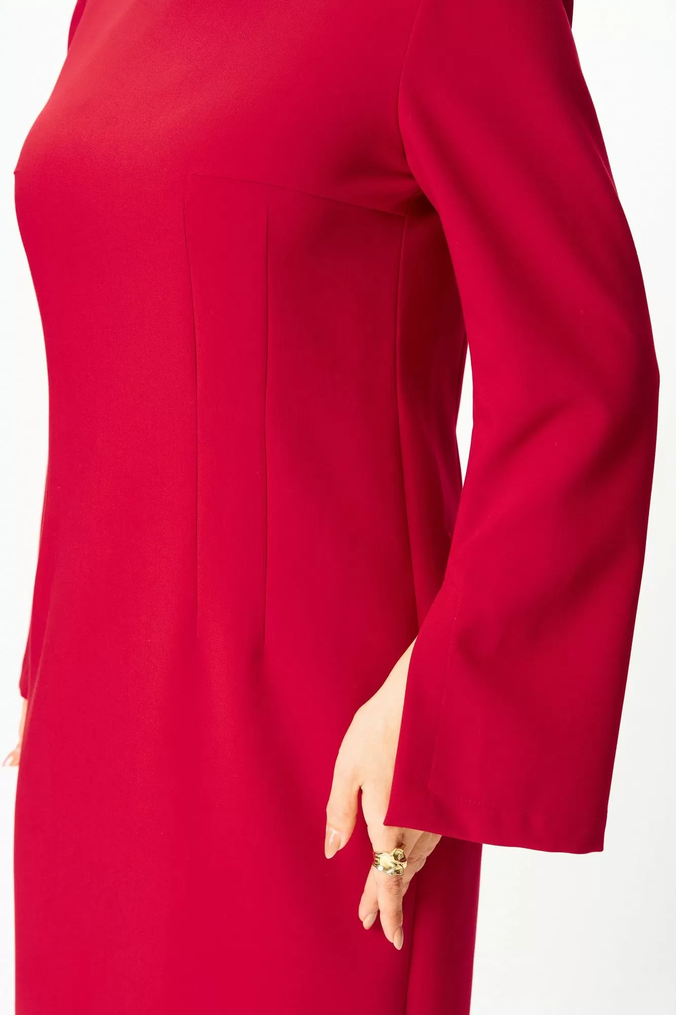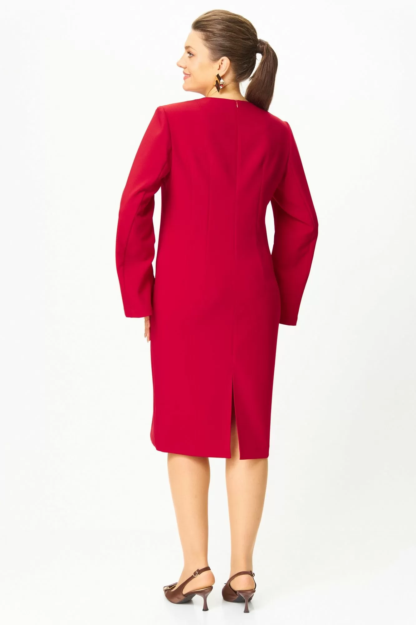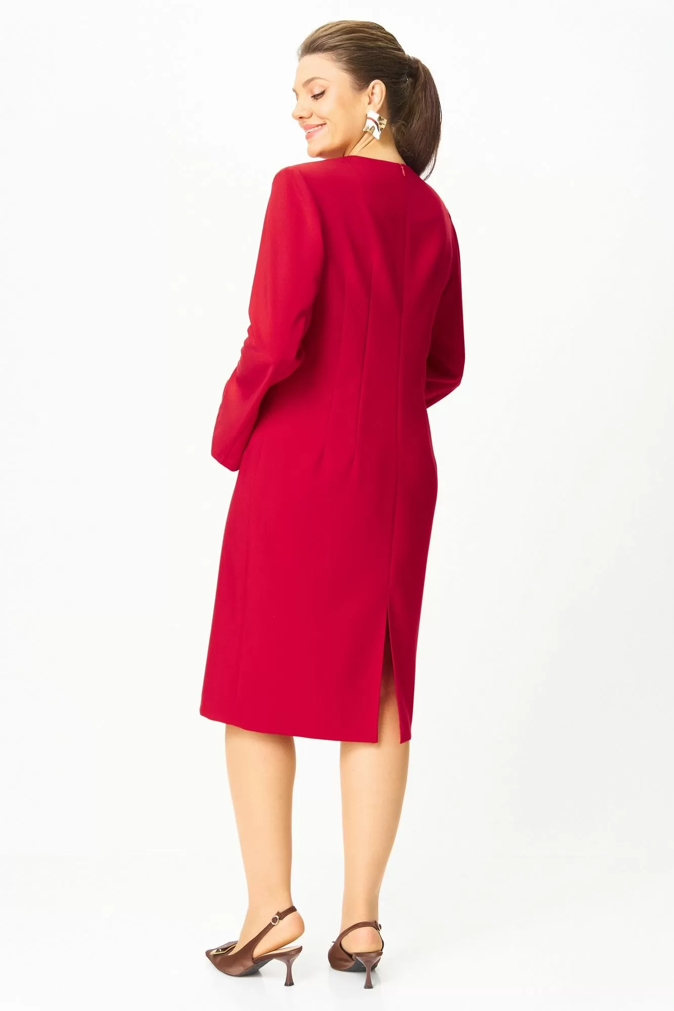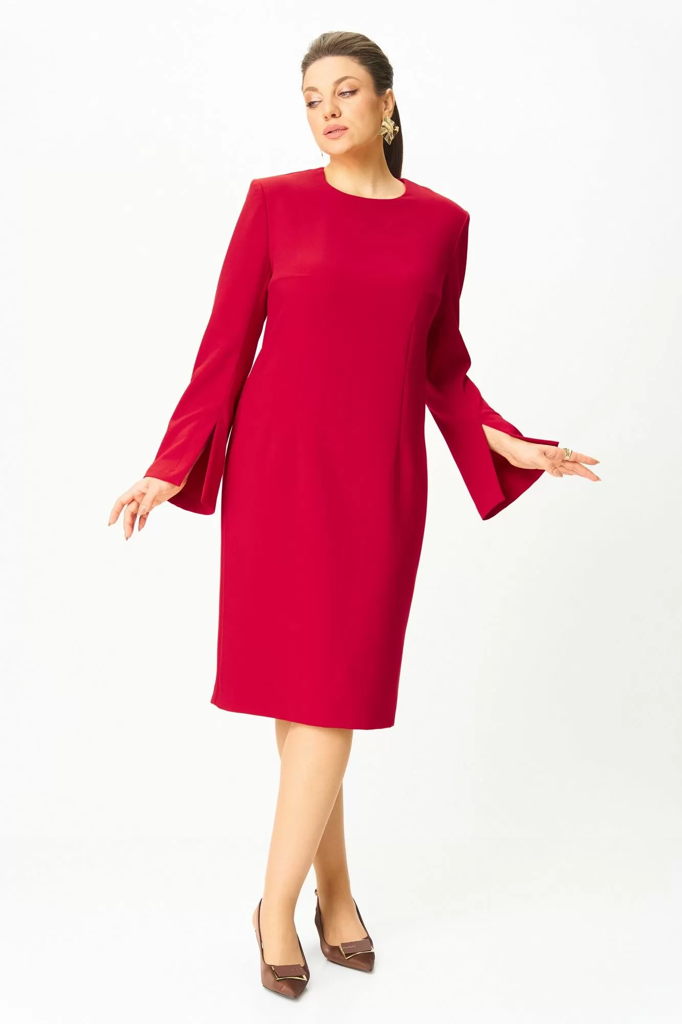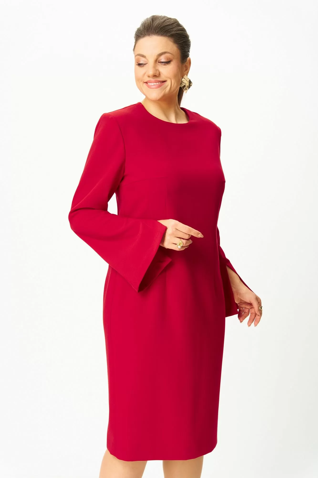 Элегантное женское платье, прилегающего силуэта: по переду и спинке вытачки по талии. Горловина круглая. Застежка на молнию в центральном шве спинки. Рукава втачные, двухшовные, расширенные к низу, в переднем шве, по низу, разрез.