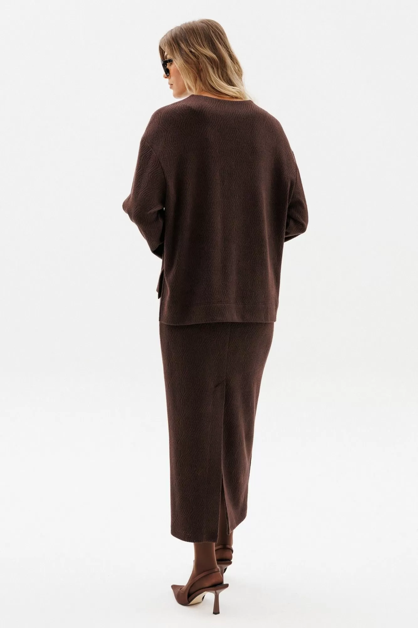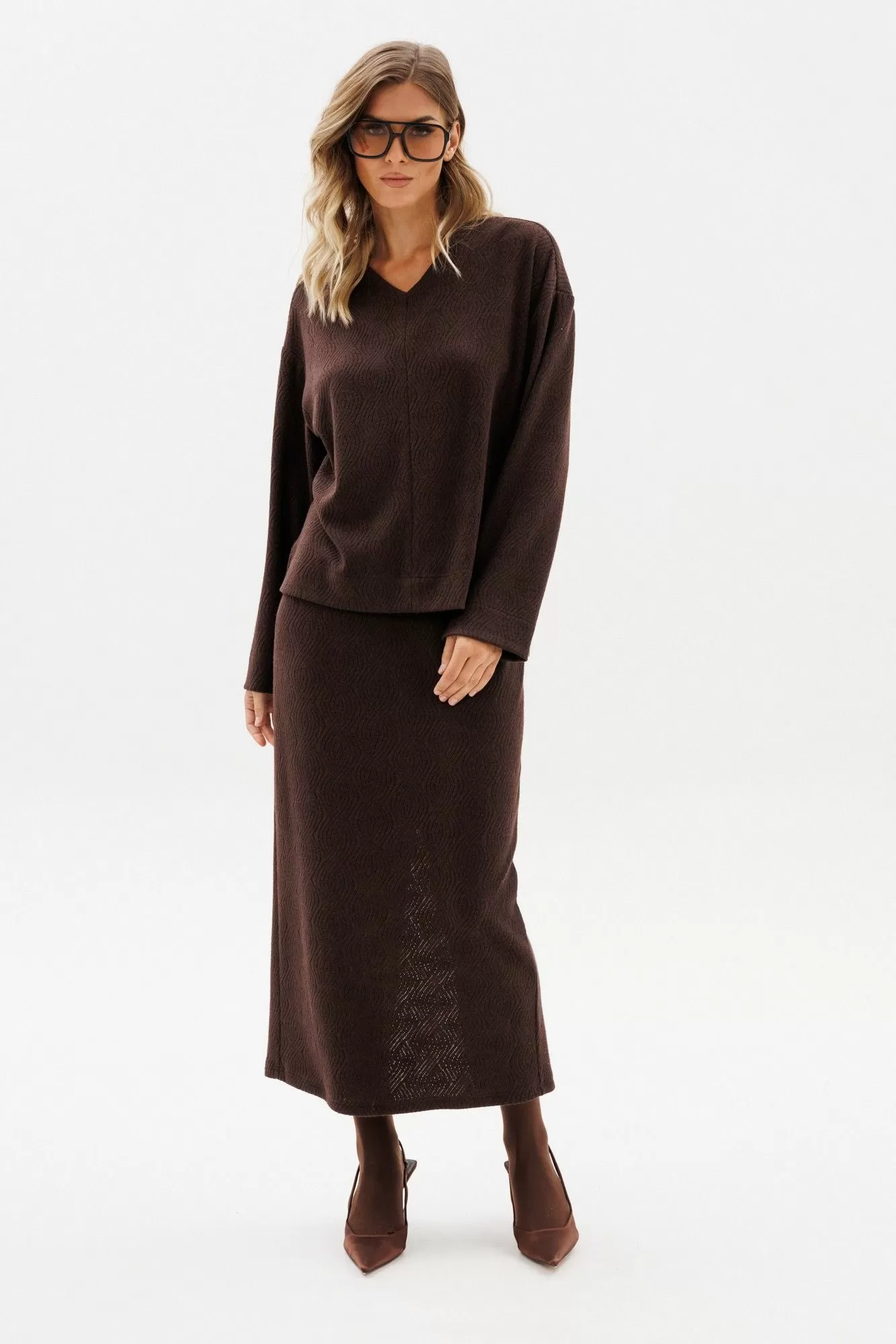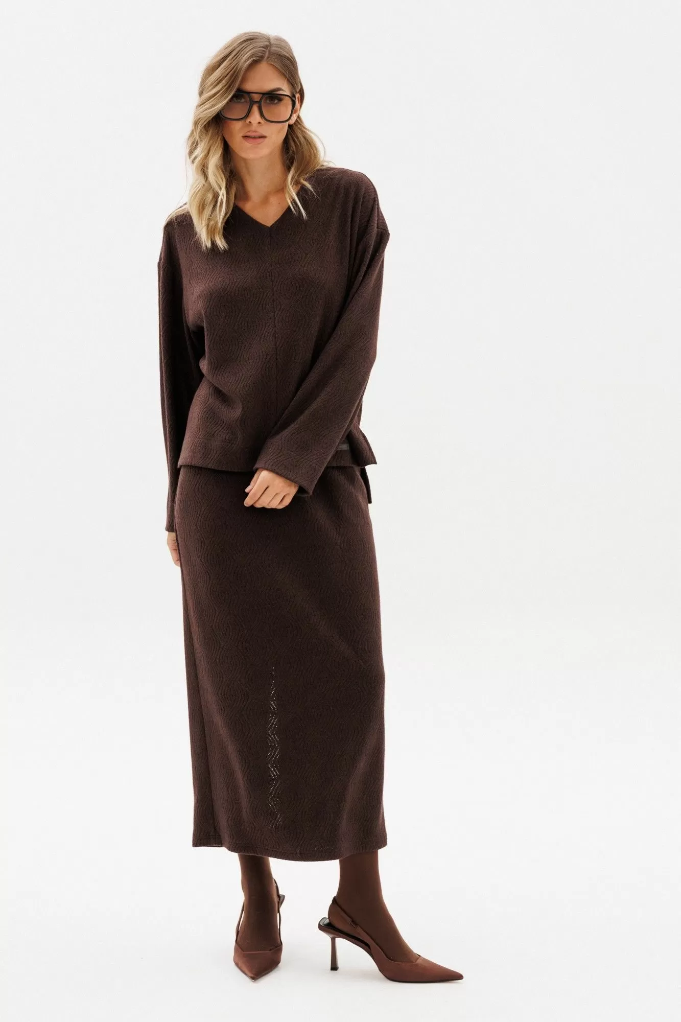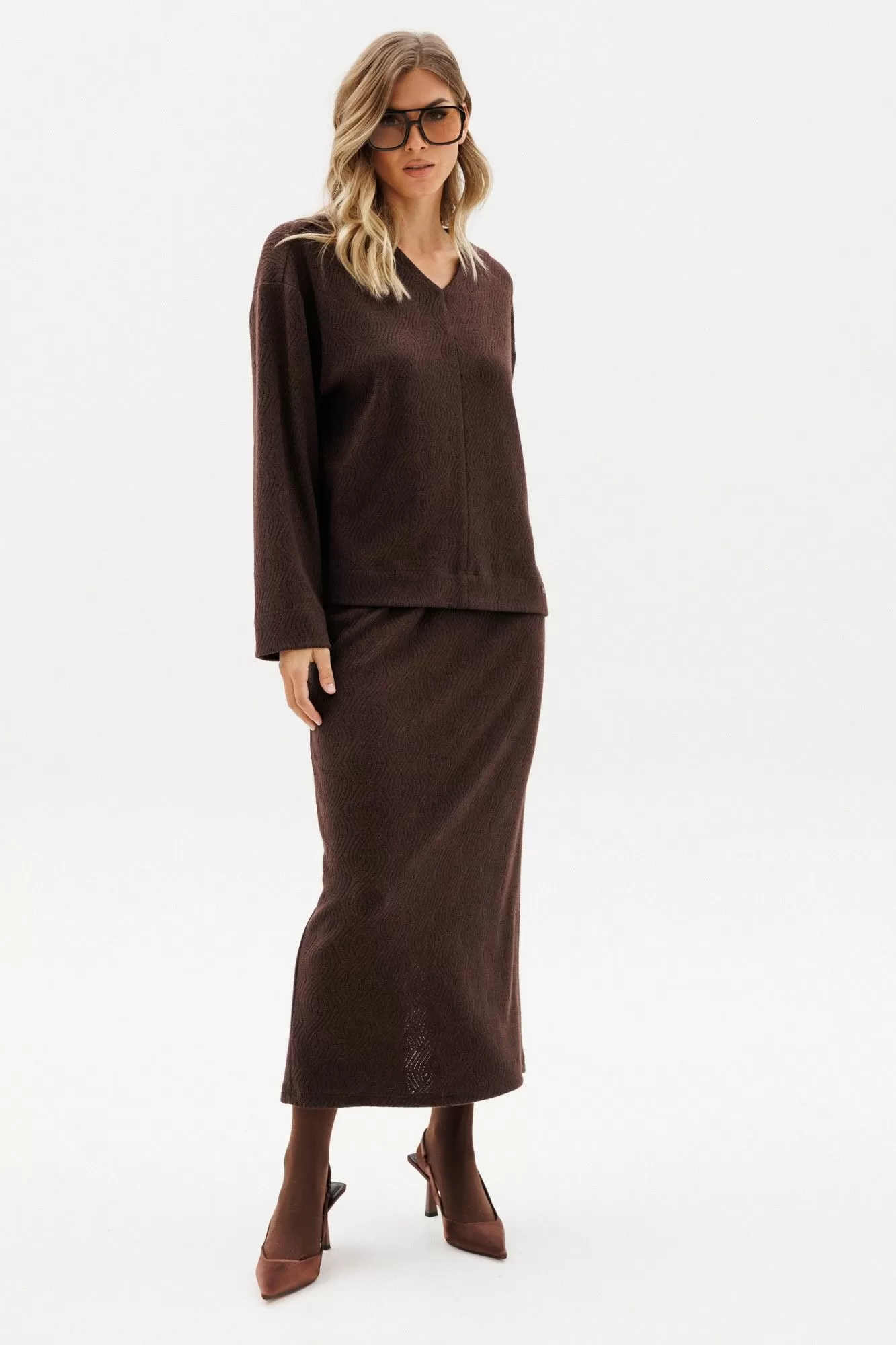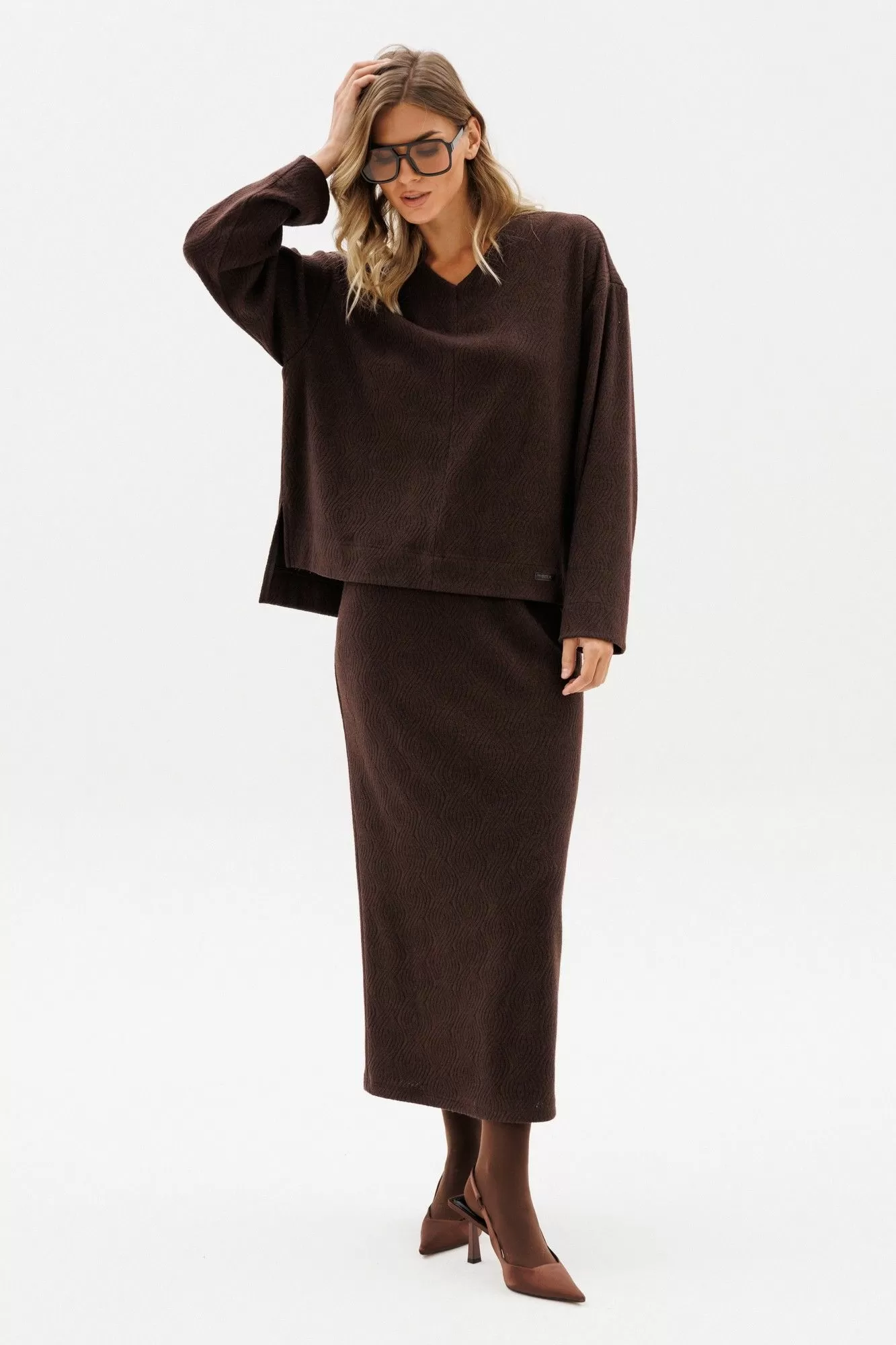 Комплект: джемпер + юбка. Комплект выполнен из трикотажного полотна с рисунком. Джемпер прямого силуэта, длиной до линии бедра. Перед со средним швом. Спинка цельная. Горловина V-образной формы. Плечевой шов спущен. Рукав рубашечного покроя, одношовный. В боковых швах разрезы. Спинка длиннее переда. Юбка слегка заужена к низу, на цельнокроенном поясе с эластичной тесьмой, длиной миди. Юбка без подкладки, сзади шлица в среднем шве.