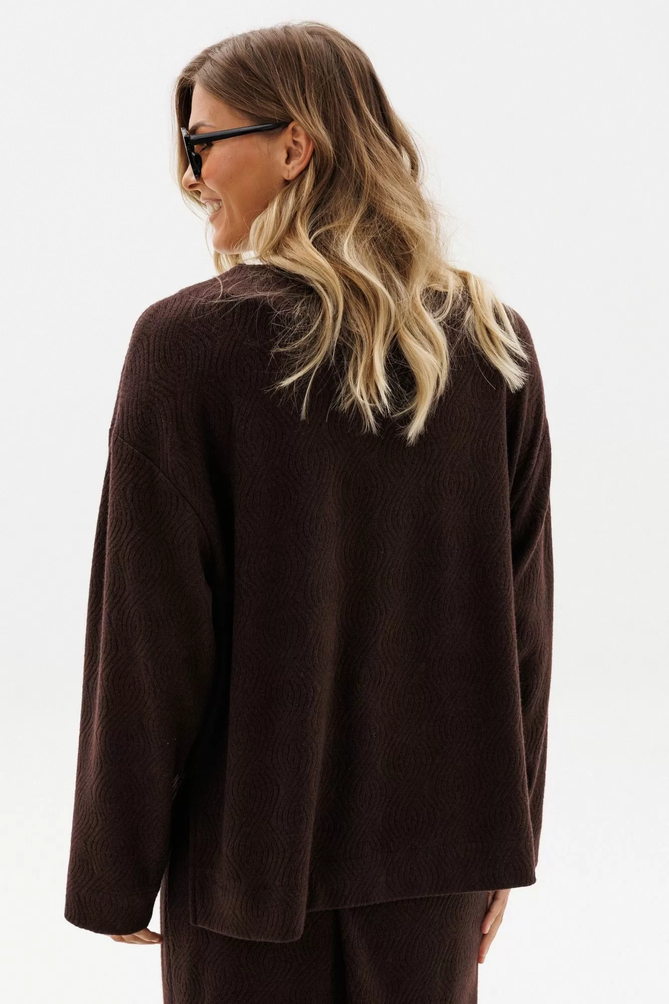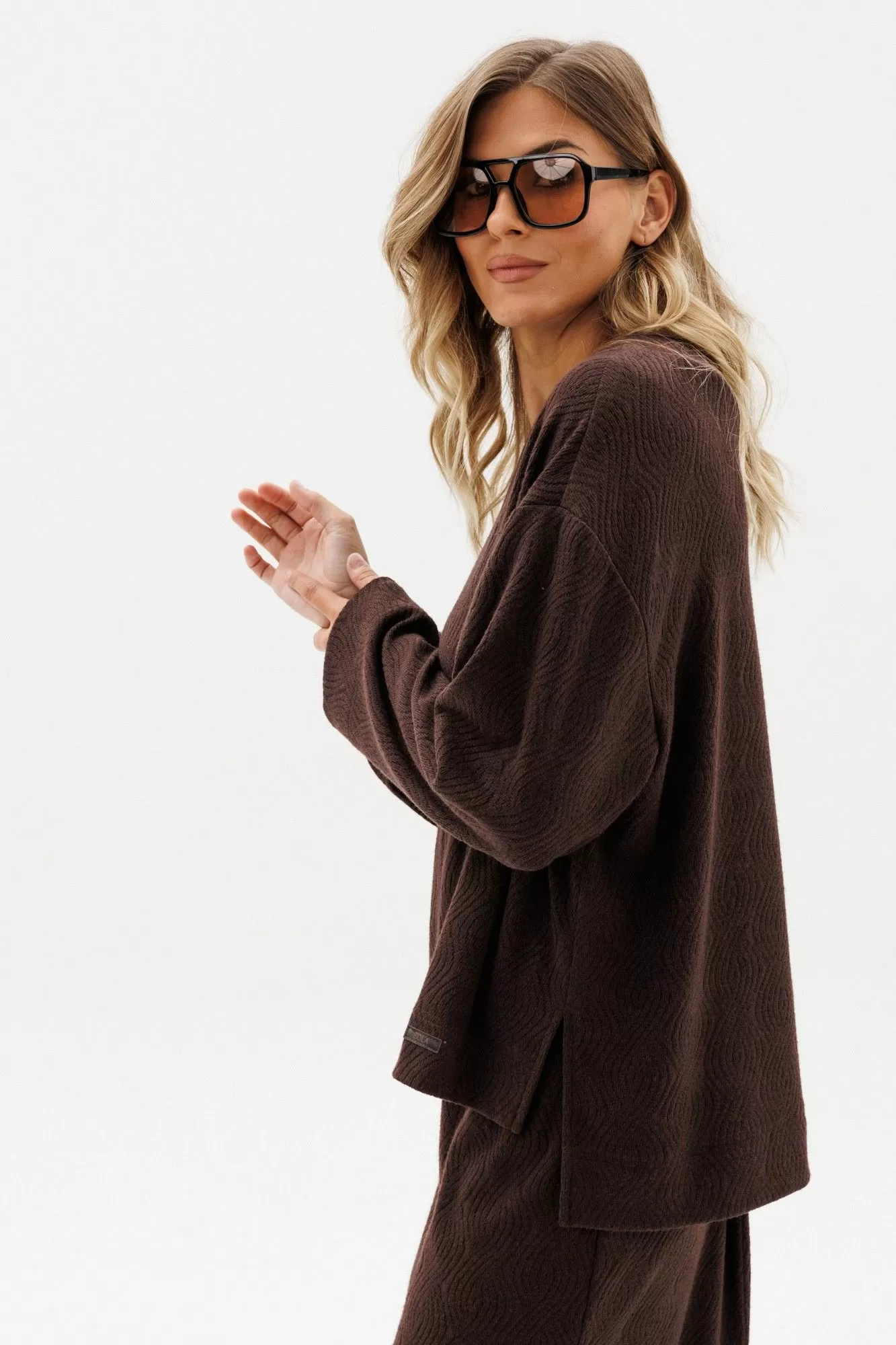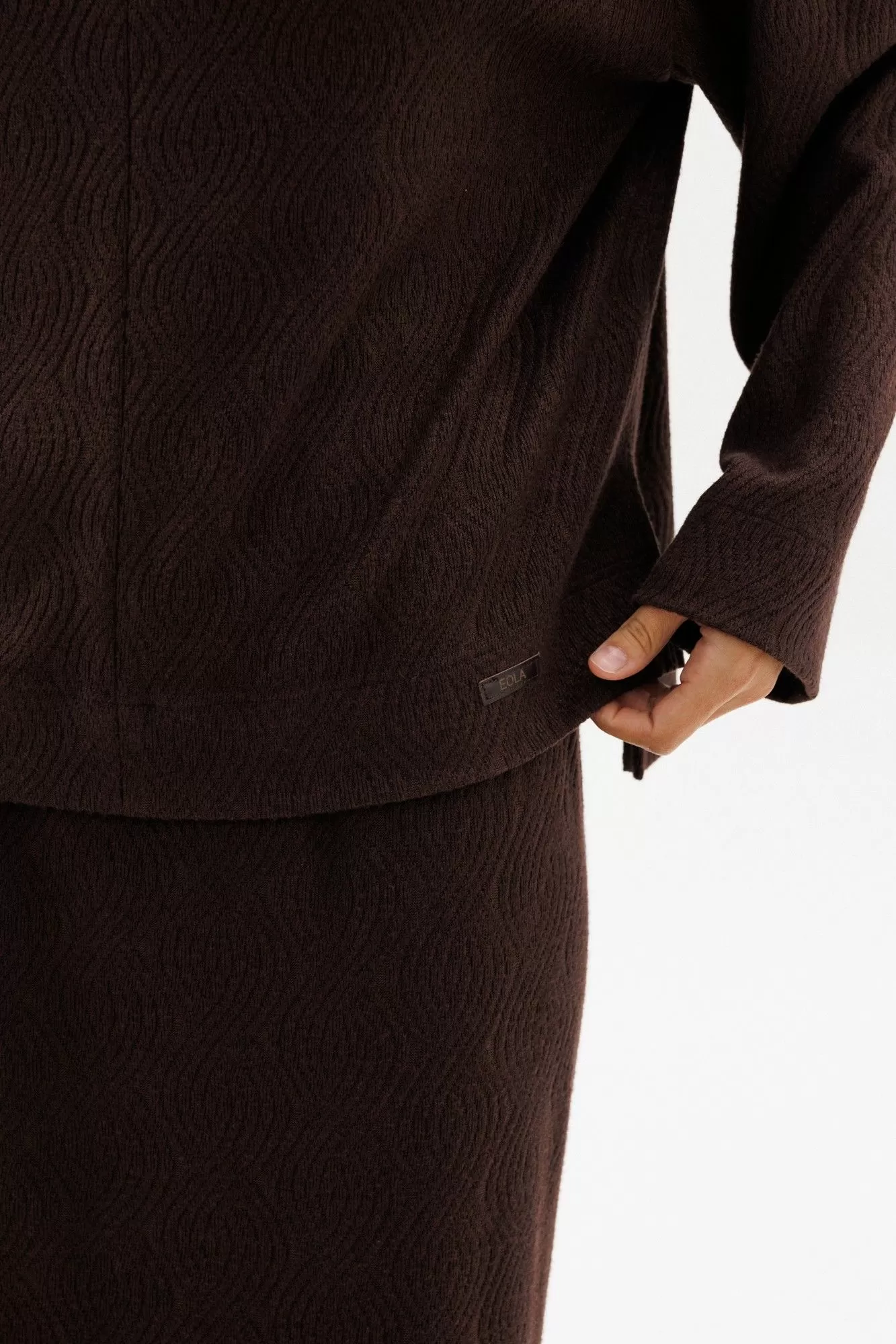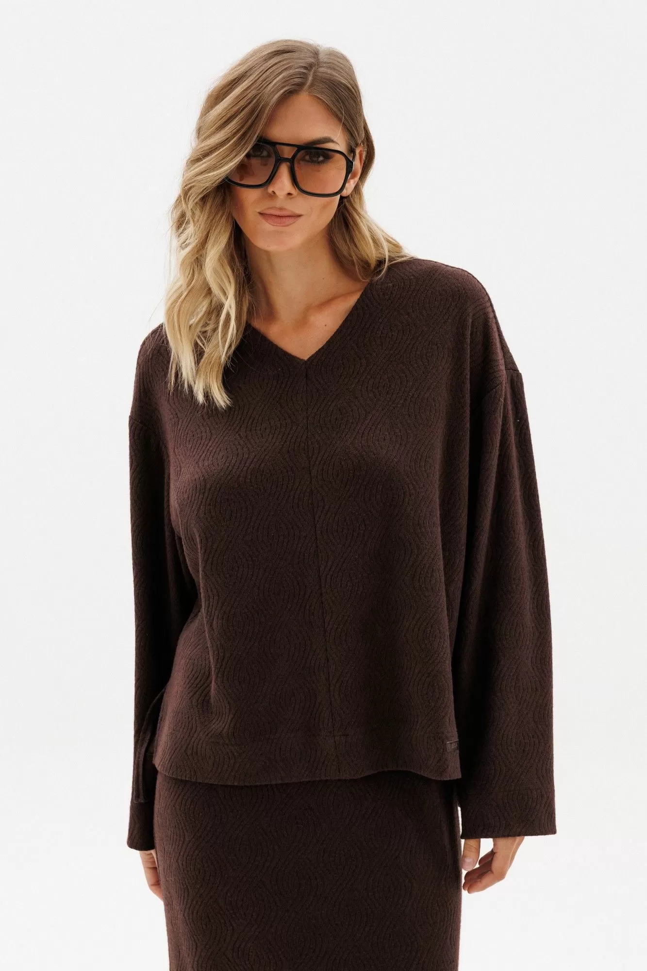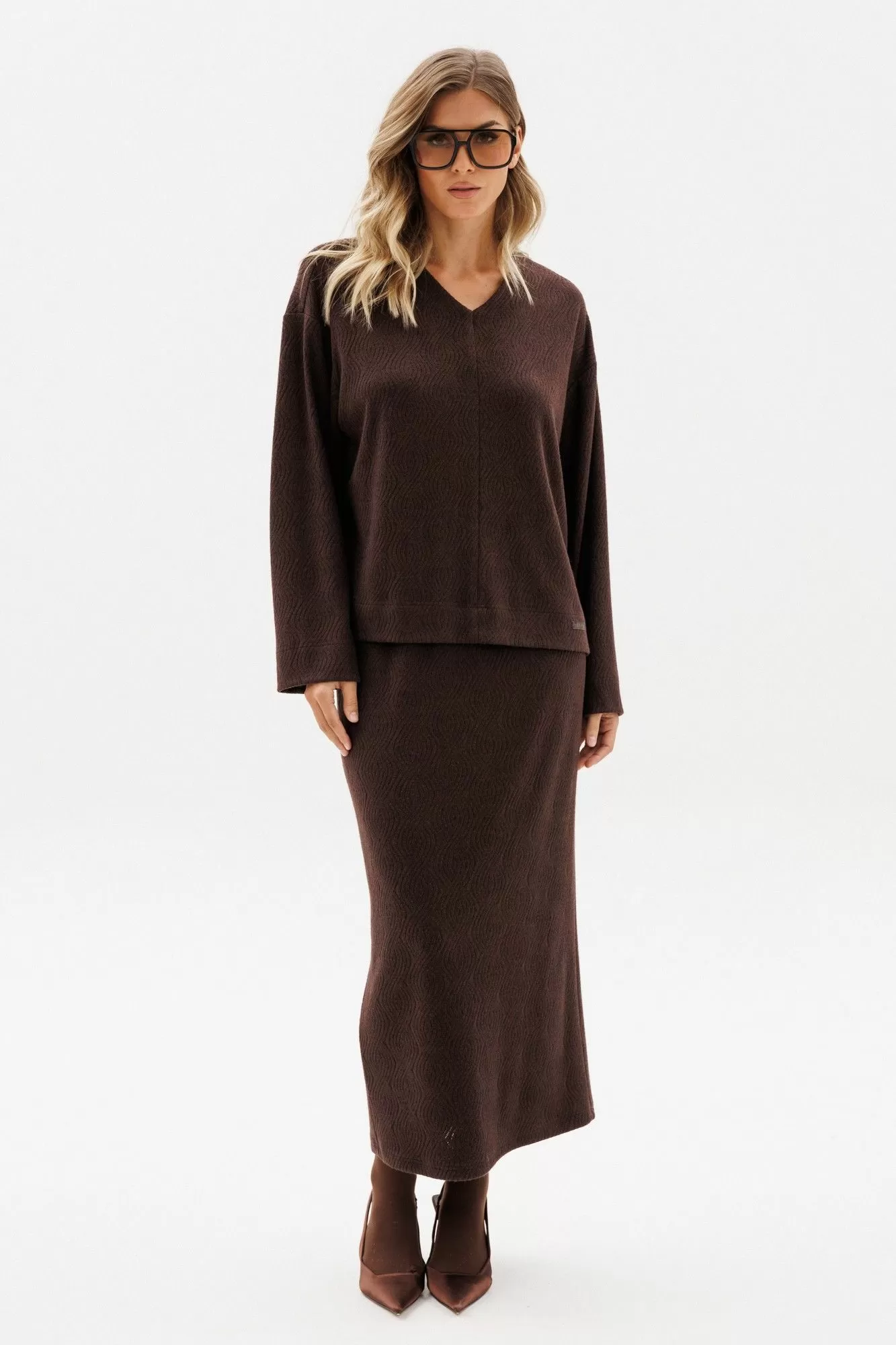 Комплект: джемпер + юбка. Комплект выполнен из трикотажного полотна с рисунком. Джемпер прямого силуэта, длиной до линии бедра. Перед со средним швом. Спинка цельная. Горловина V-образной формы. Плечевой шов спущен. Рукав рубашечного покроя, одношовный. В боковых швах разрезы. Спинка длиннее переда. Юбка слегка заужена к низу, на цельнокроенном поясе с эластичной тесьмой, длиной миди. Юбка без подкладки, сзади шлица в среднем шве.