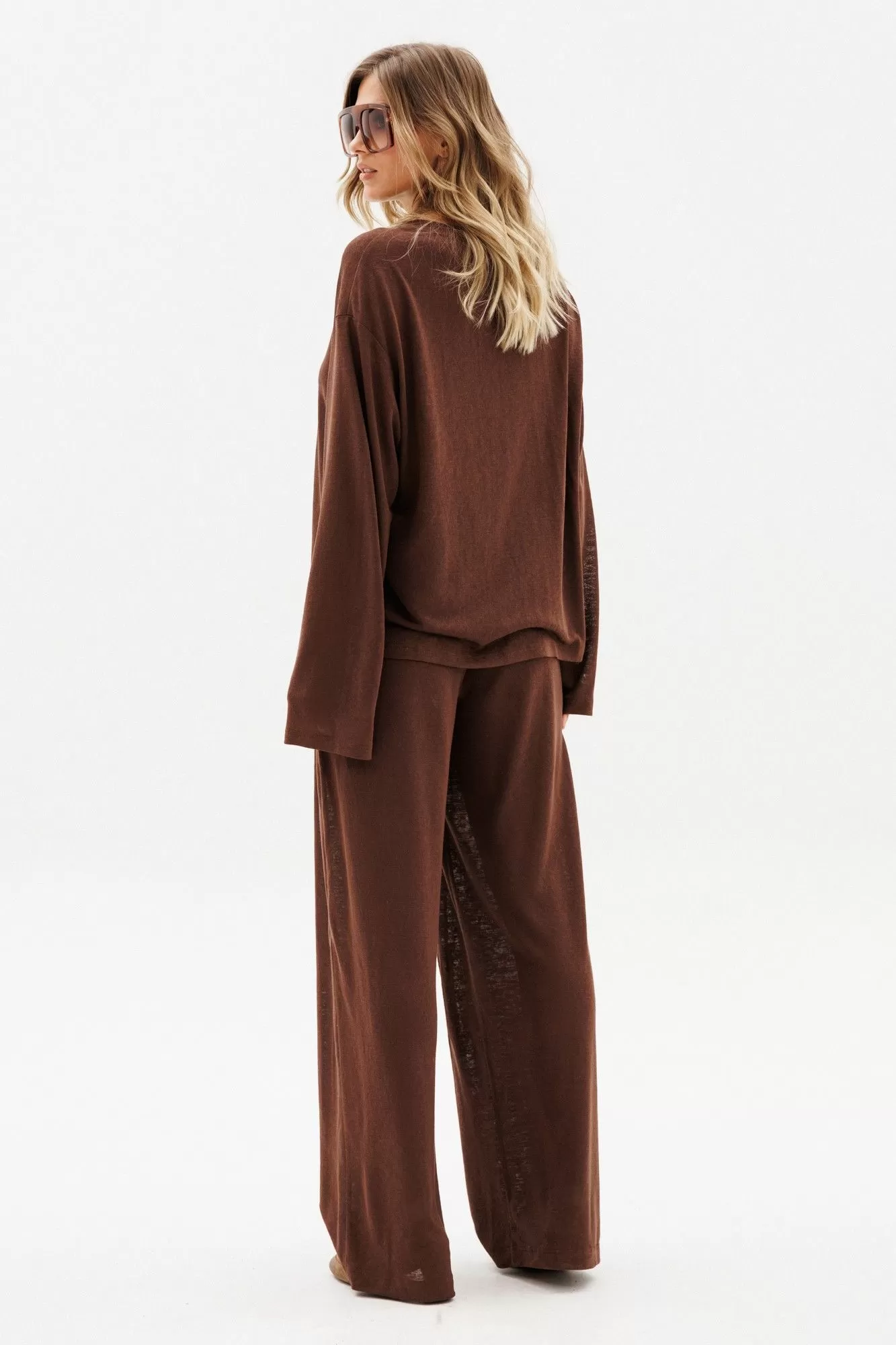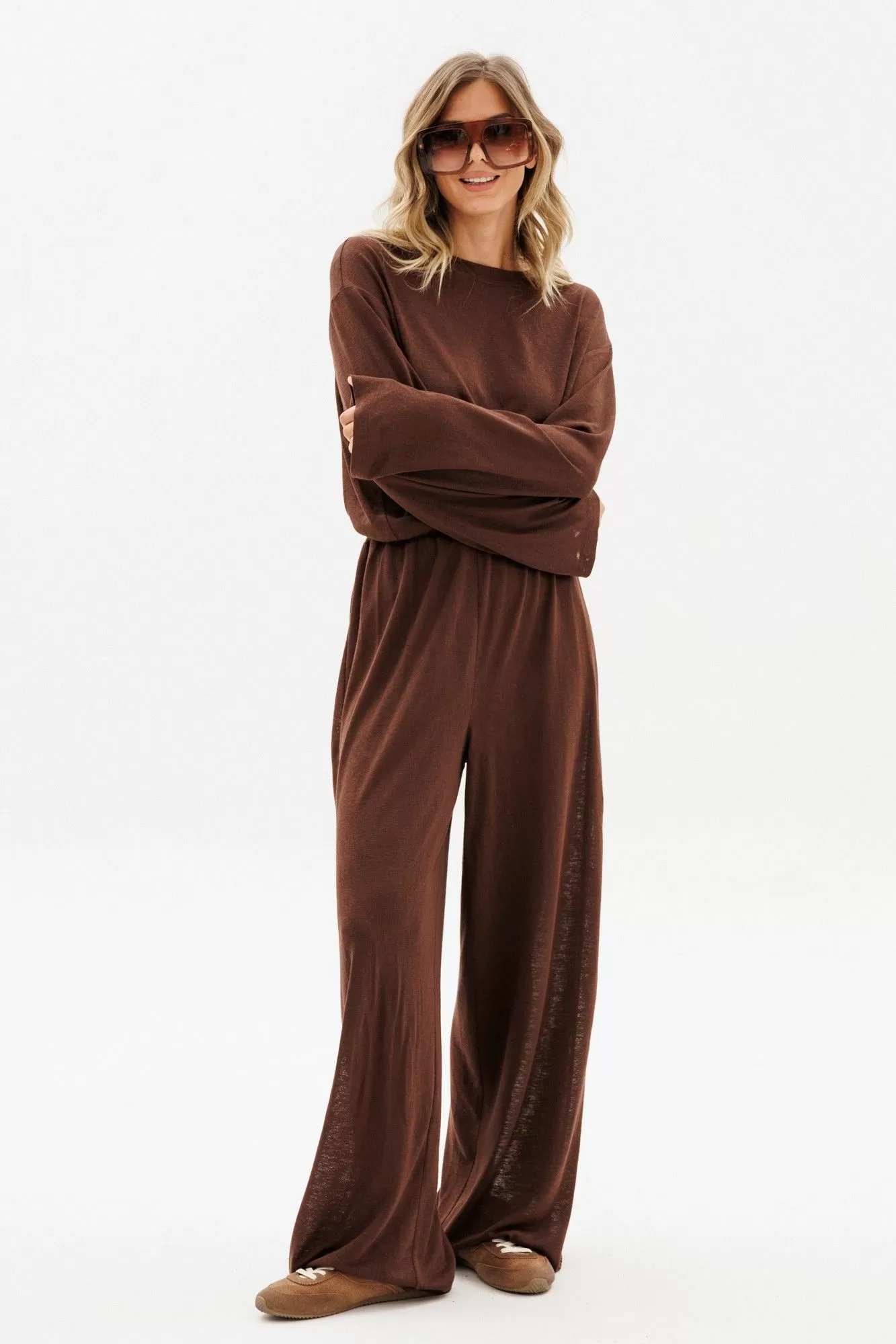 Комплект: джемпер + брюки. Комплект выполнен из трикотажного полотна. Джемпер прямого силуэта, длиной до линии бедра. Перед и спинка цельные. Горловина округлой формы, обработана широкой бейкой. Плечевой шов удлинен. Рукав рубашечного покроя, одношовный. Брюки прямого покроя, длиной в пол, на притачном поясе с эластиной тесьмой.