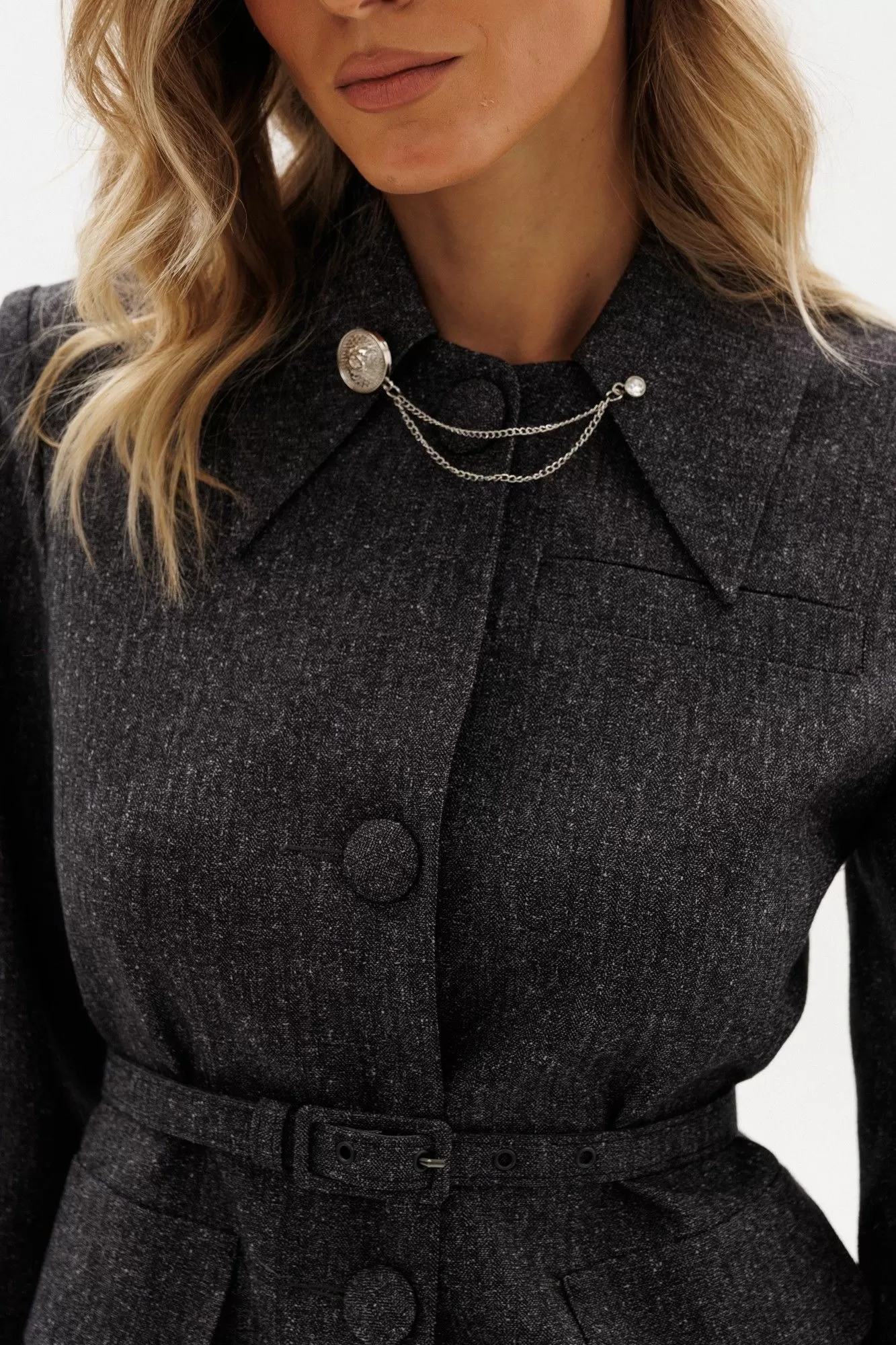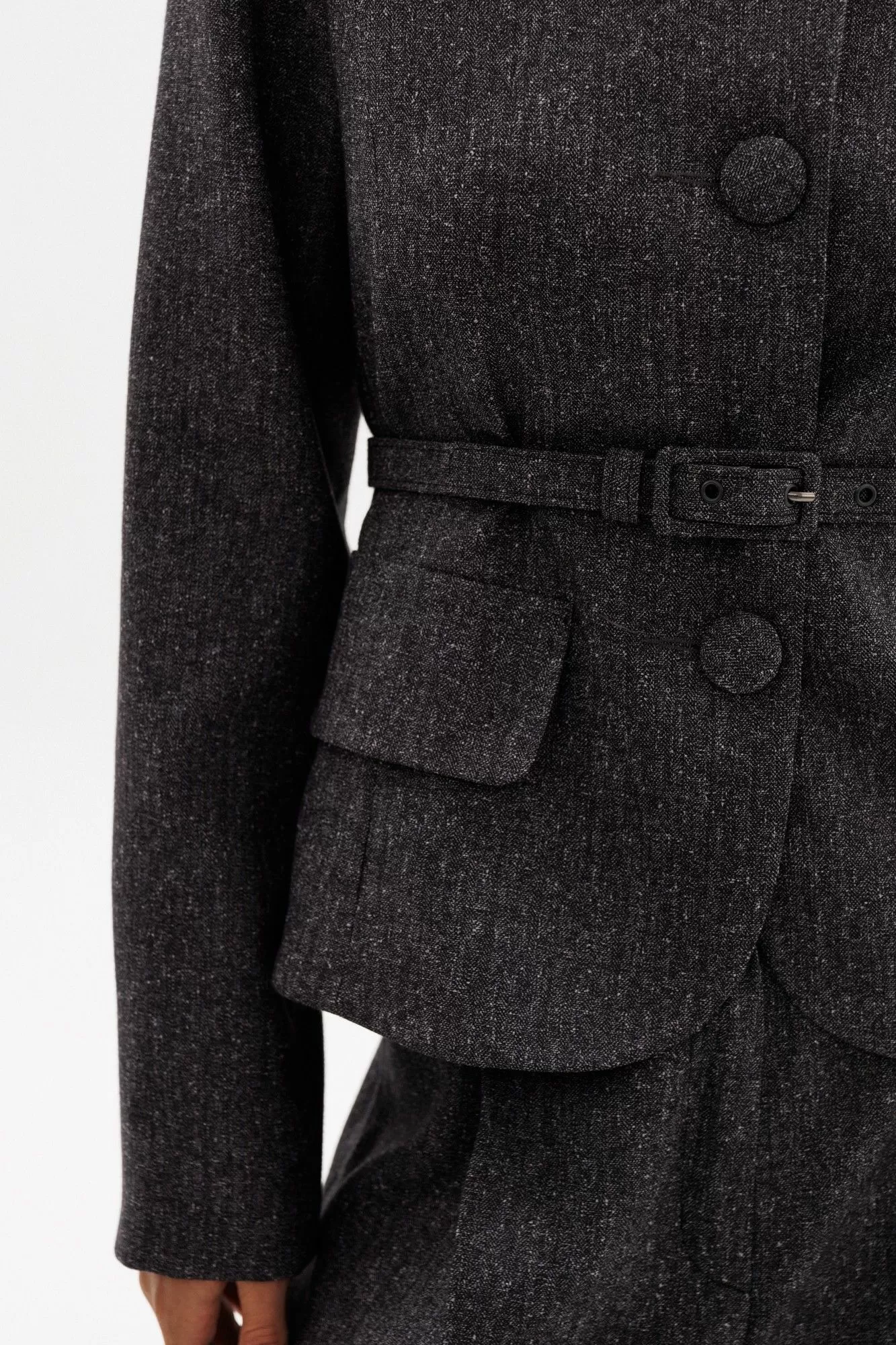 Жакет выполнен из костюмной ткани меланж. Жакет полуприлегающего силуэта длиной выше линии бедер. Спереди центральная застежка на пуговицы и декоративные клапаны. Воротник стояче-отложной. Спинка со средним швом. Рукав втачного покроя двухшовный. Жакет на притачной по низу подкладке. В комплект входит ремень из основной ткани с обтяжной пряжкой.