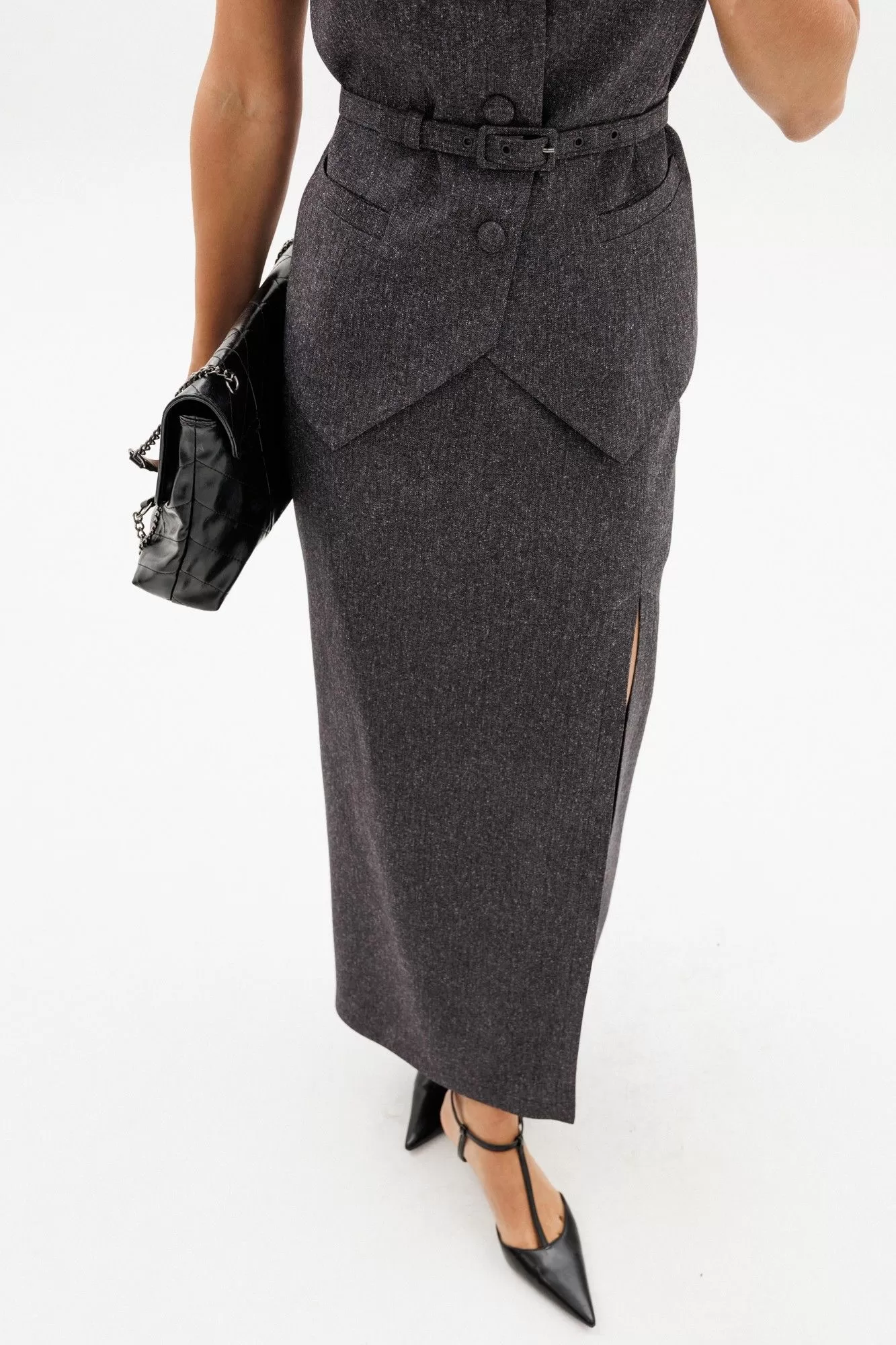 Юбка выполнена из костюмной ткани меланж. Юбка на притачном поясе, длиной выше линии щиколотки, зауженная к низу. Застежка сбоку на потайную молнию. Спереди слева разрез. Юбка на обтачной по низу подкладке.