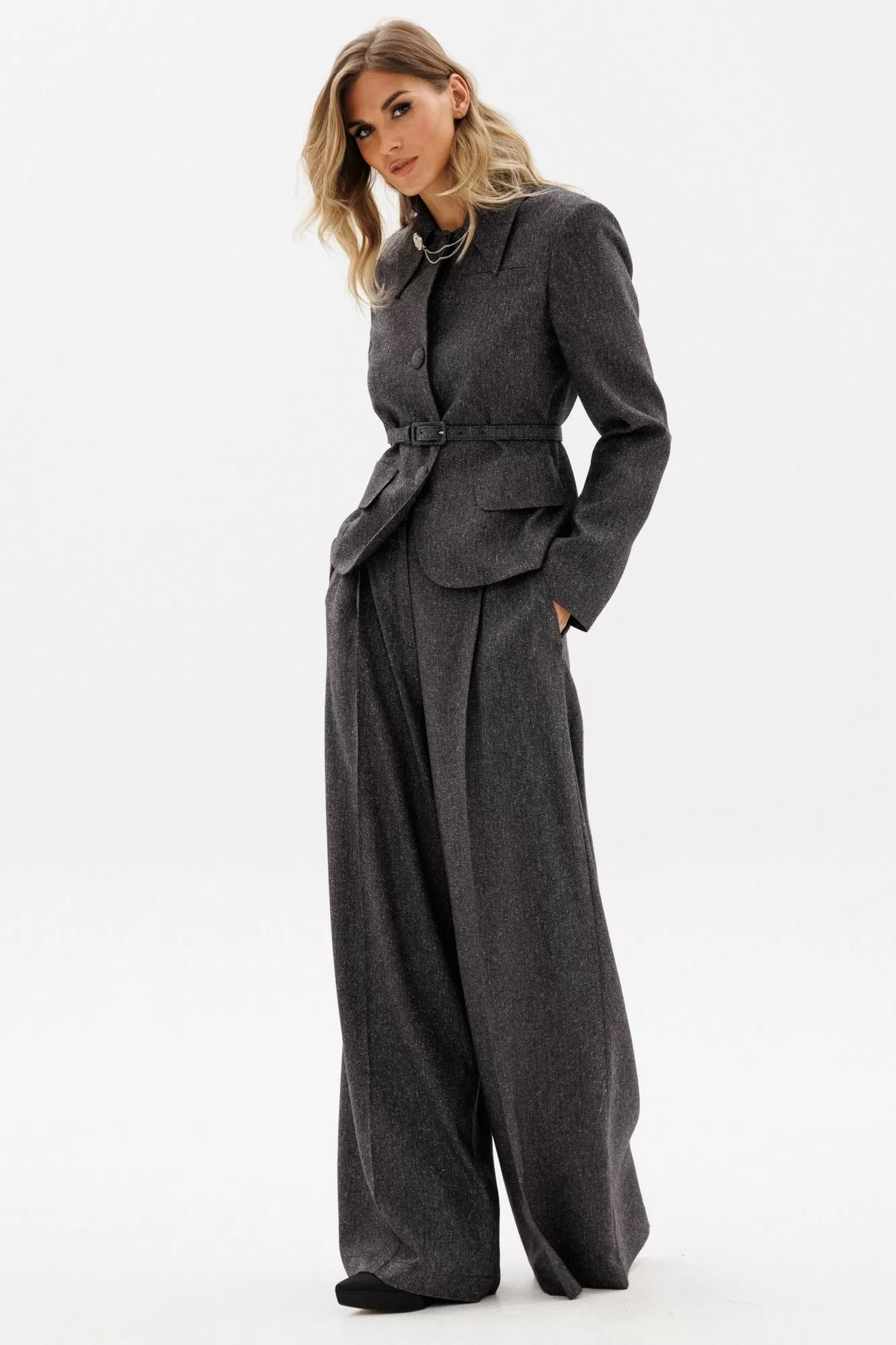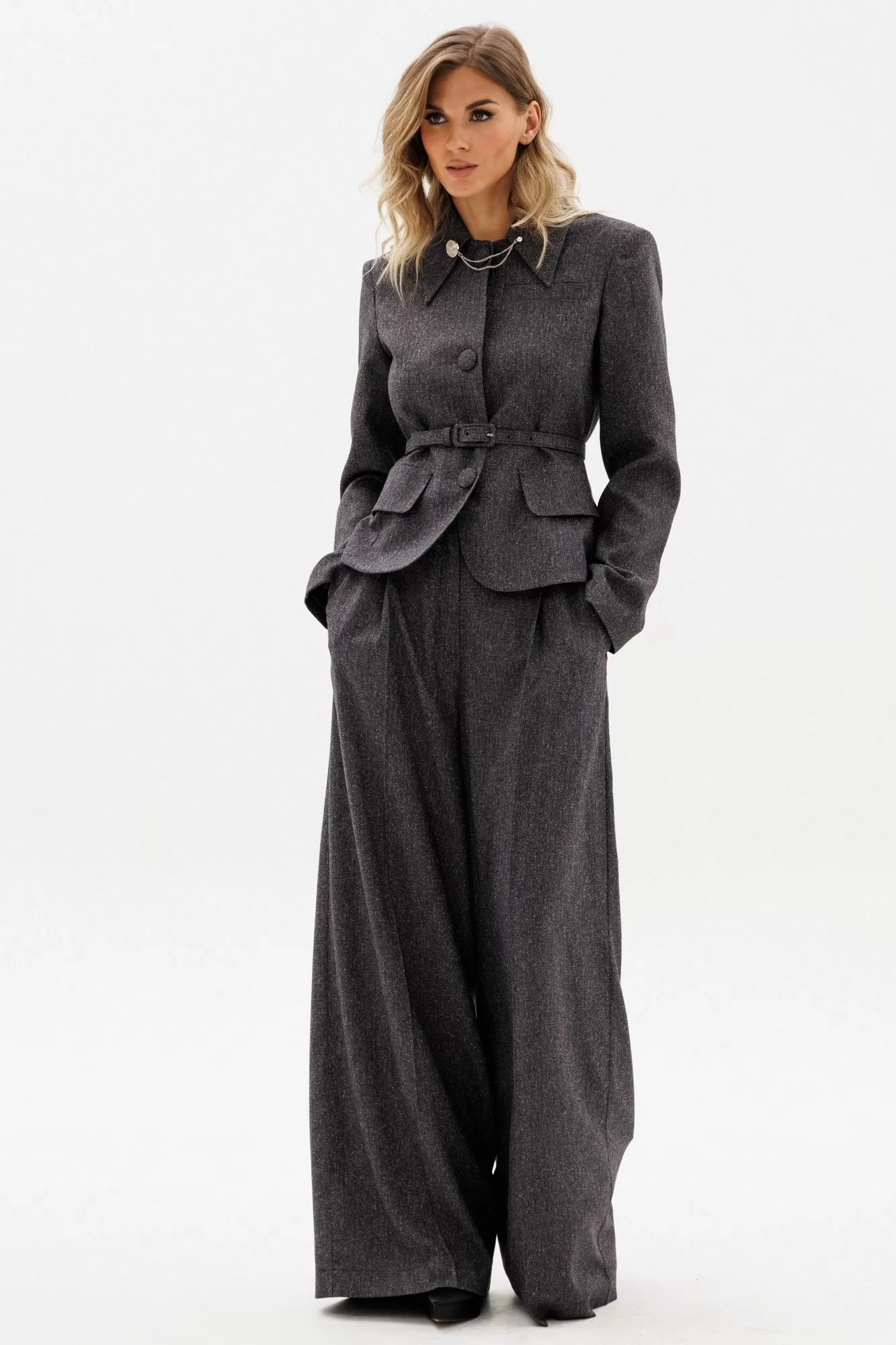 Брюки-палаццо выполнены из костюмной ткани меланж. Брюки на притачном поясе, длиной в пол, расширенные к низу. Спереди складки и боковые карманы с наклонным входом. Застежка спереди на молнию с гульфиком и пуговицу. На задних частях обработаны талиевые вытачки.