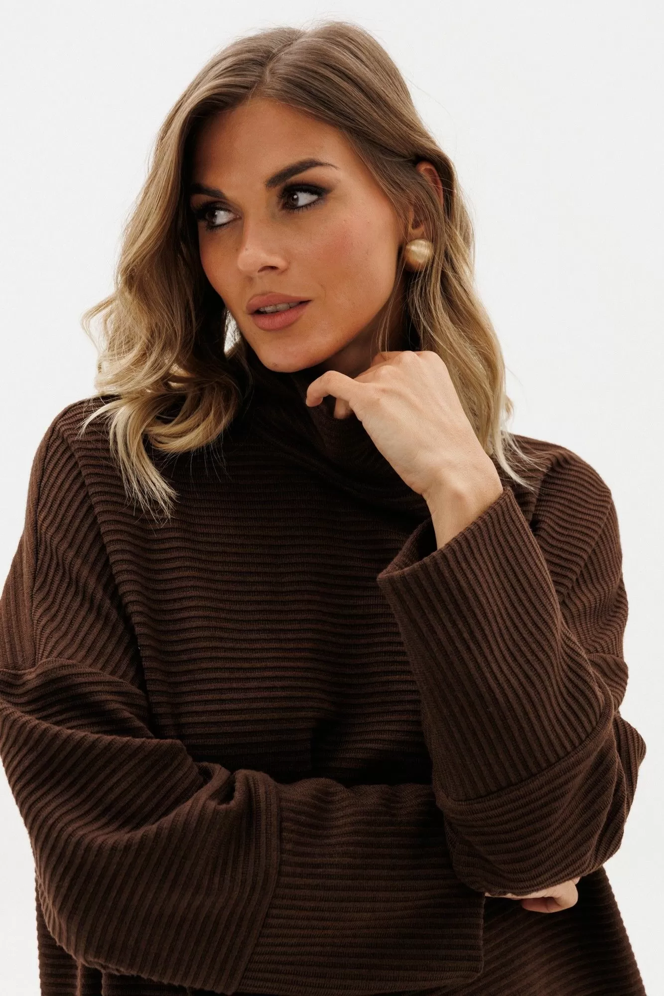 Джемпер выполнен из трикотажного полотна в рубчик. Джемпер прямого силуэта, покроя "oversize", длиной до линии бедер. Спереди и на спинке отрезные части. Воротник-стойка. Плечевой шов удлинен. Рукав рубашечного покроя, одношовный, с широкой манжетой по низу. В боковых швах разрезы.