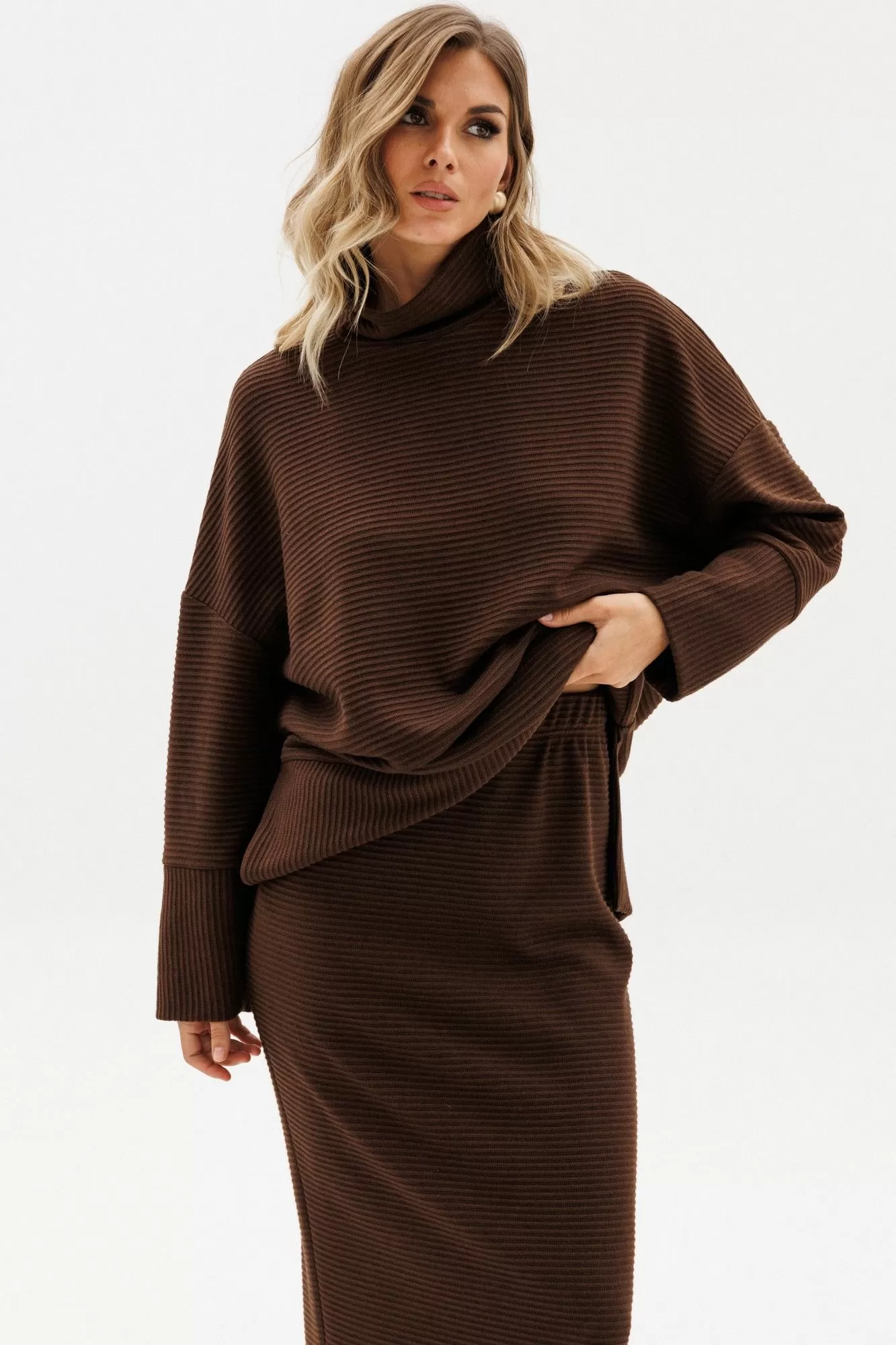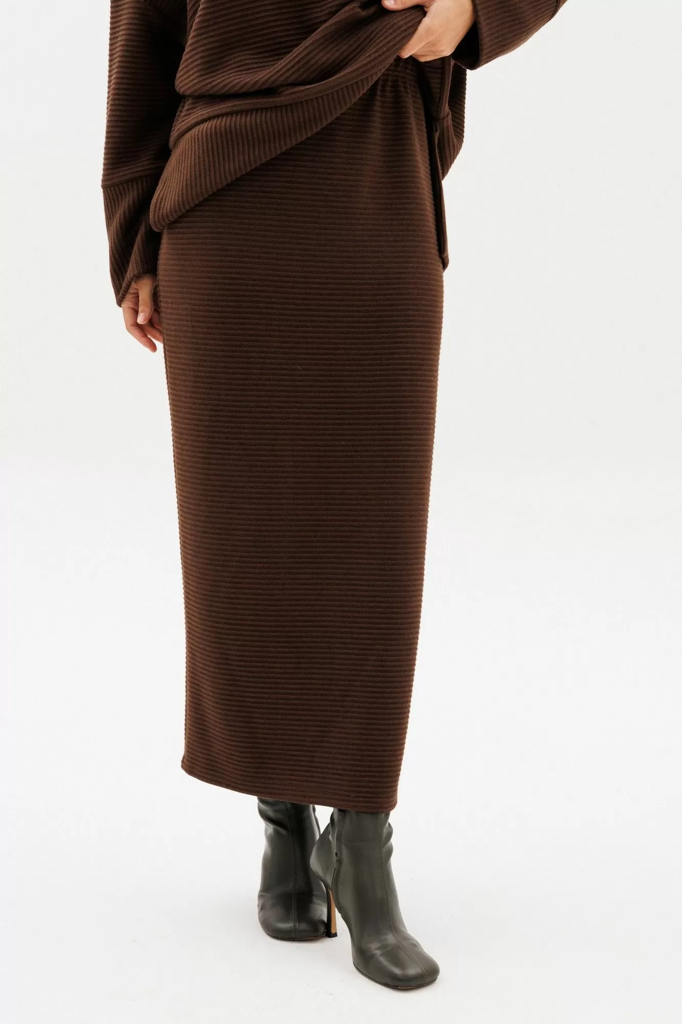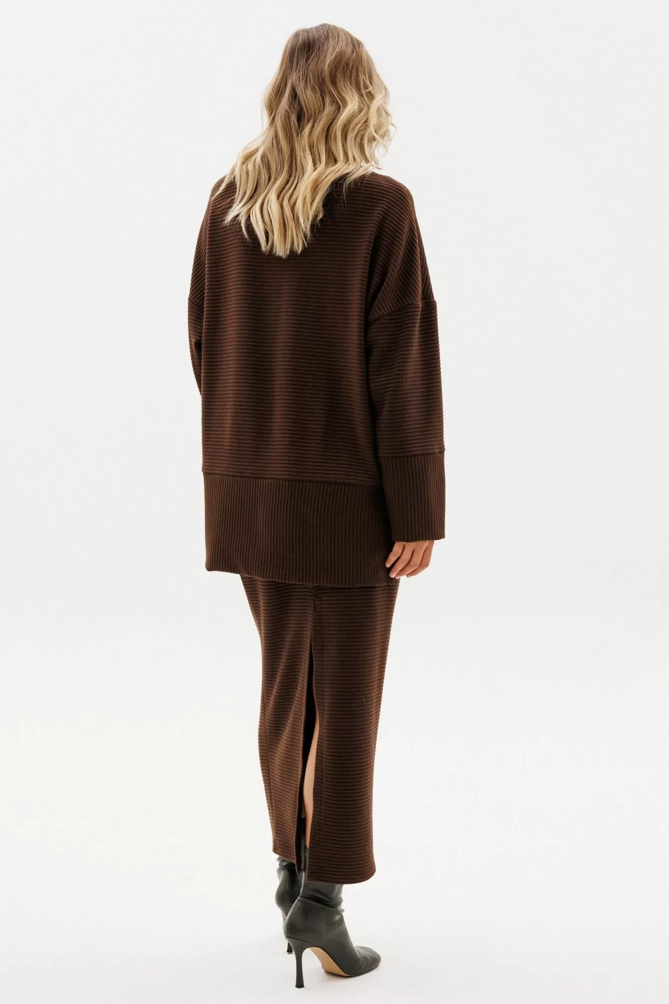 Юбка выполнена из трикотажного полотна в рубчик. Юбка прямого силуэта, длиной миди, на цельнокроеном поясе с эластичной тесьмой. Сзади разрез в среднем шве.