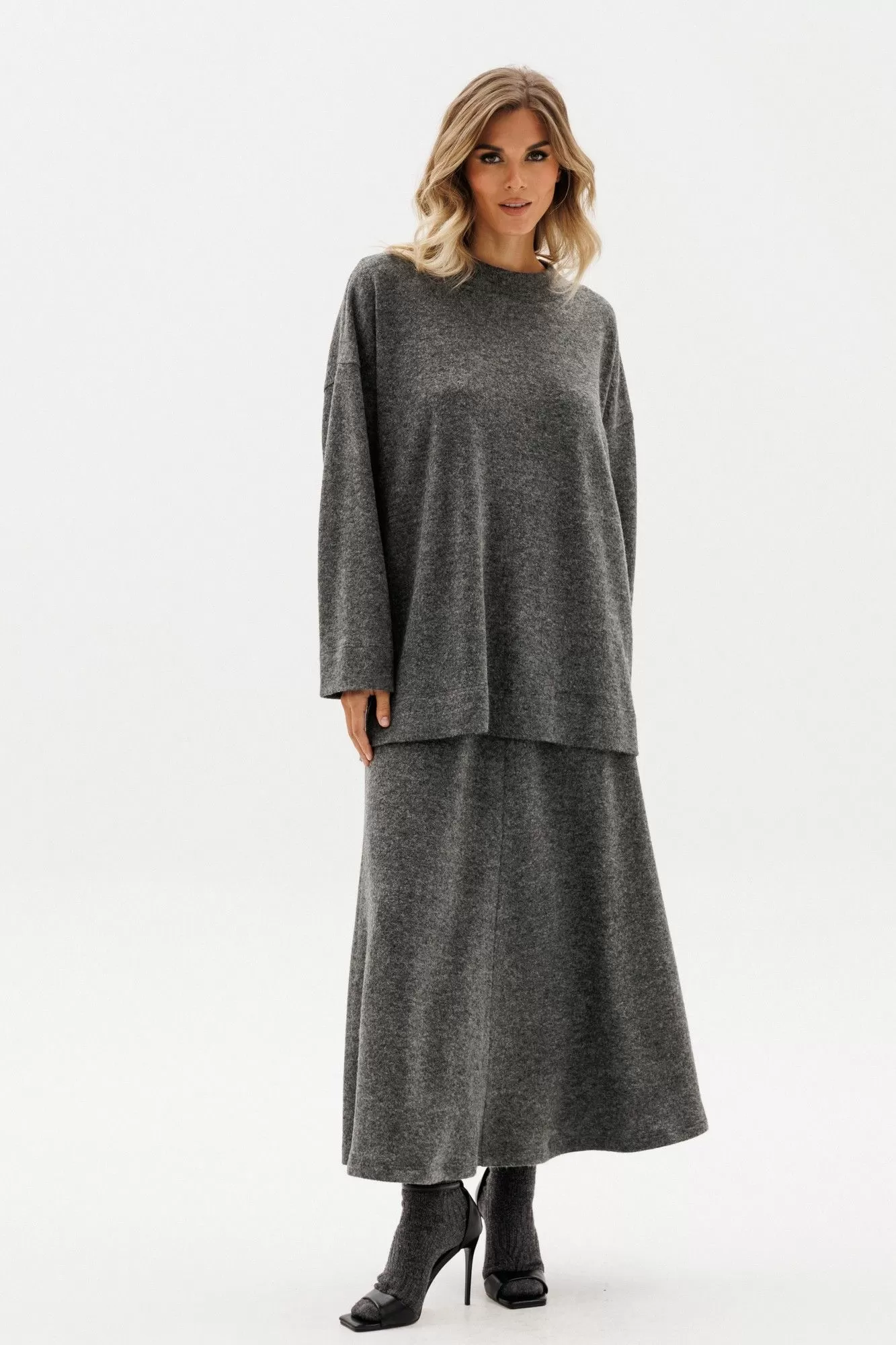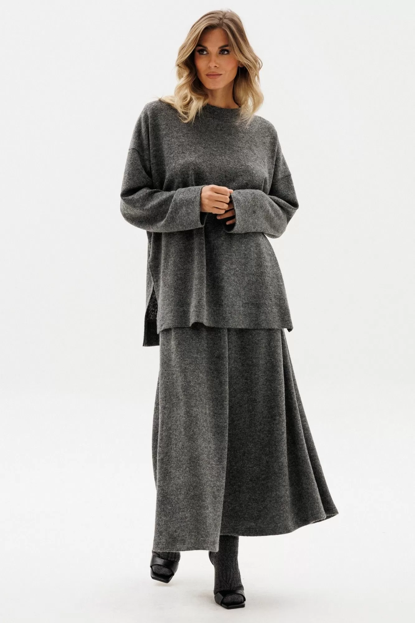 Джемпер выполнен из трикотажного полотна. Джемпер прямого силуэта, длиной ниже линии бедер. Перед и спинка цельные. Горловина округлой формы, обработана широкой бейкой. Плечевой шов удлинен. Рукав рубашечного покроя, одношовный. В боковых швах разрезы.