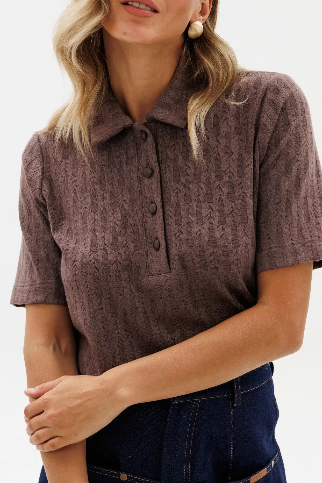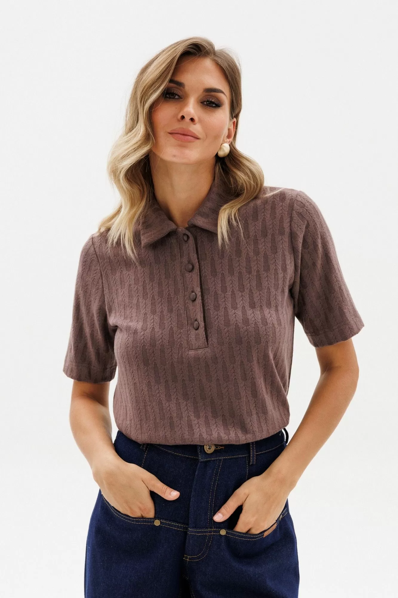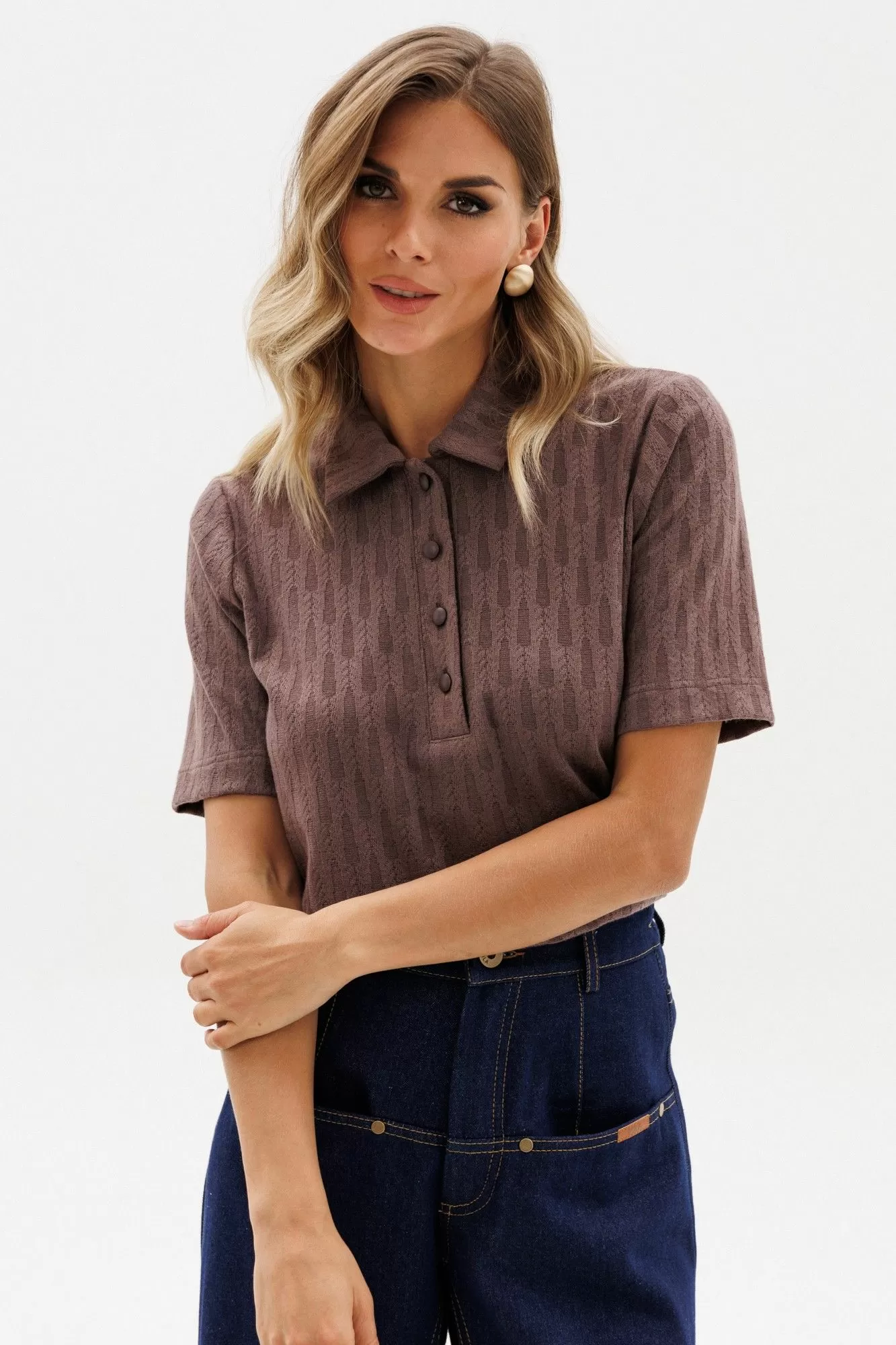 Джемпер выполнен из трикотажного полотна с рисунком. Джемпер полуприлегающего силуэта, длиной выше линии бедер. Спереди застежка на пуговицы. Воротник стояче-отложной. Плечевой шов удлинен. Рукав втачного покроя, одношовный, выше линии локтя.