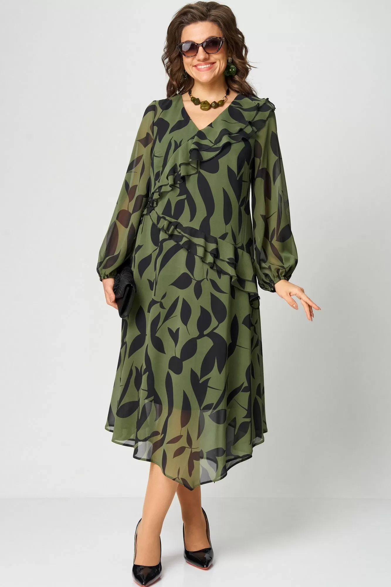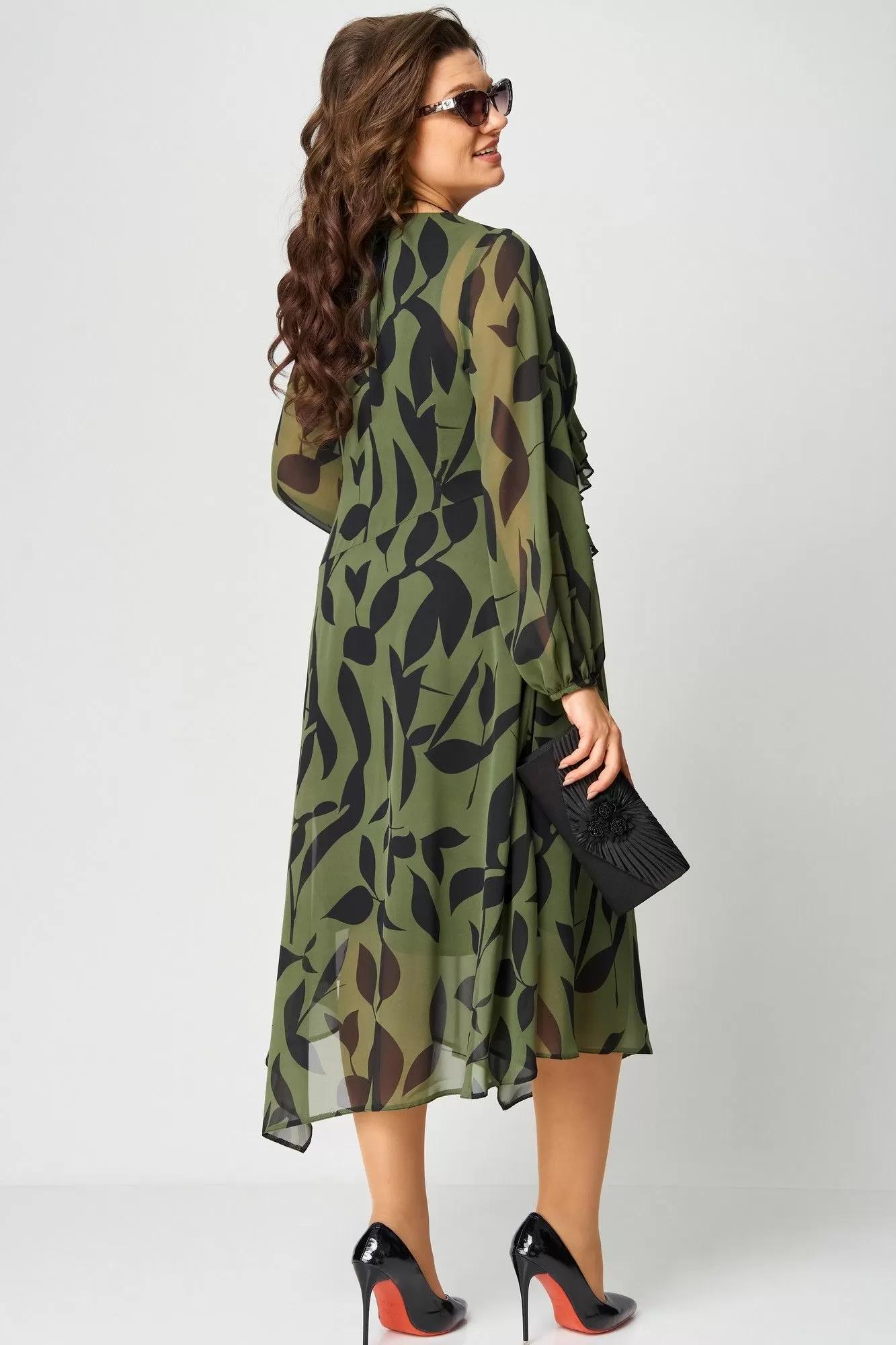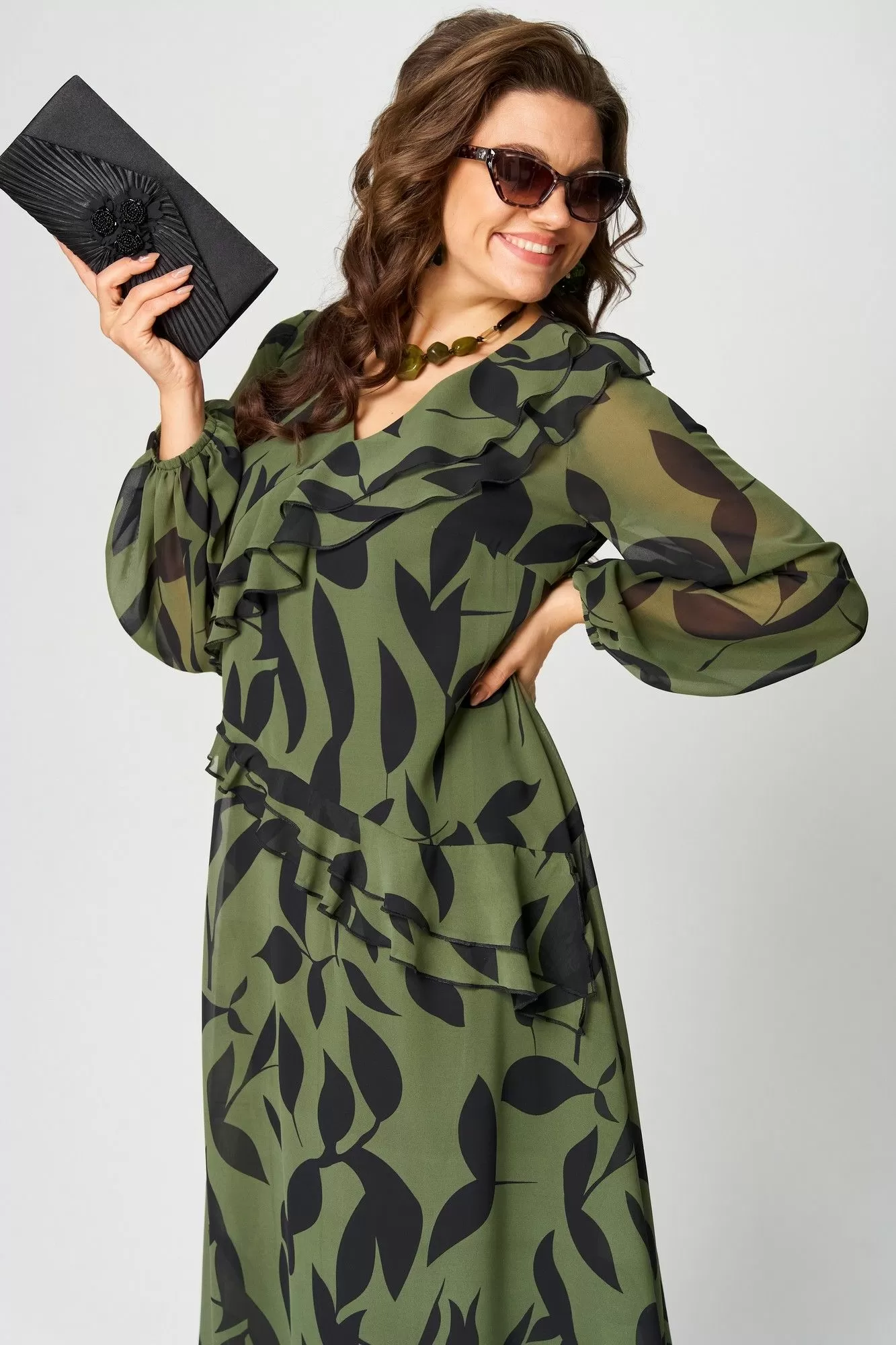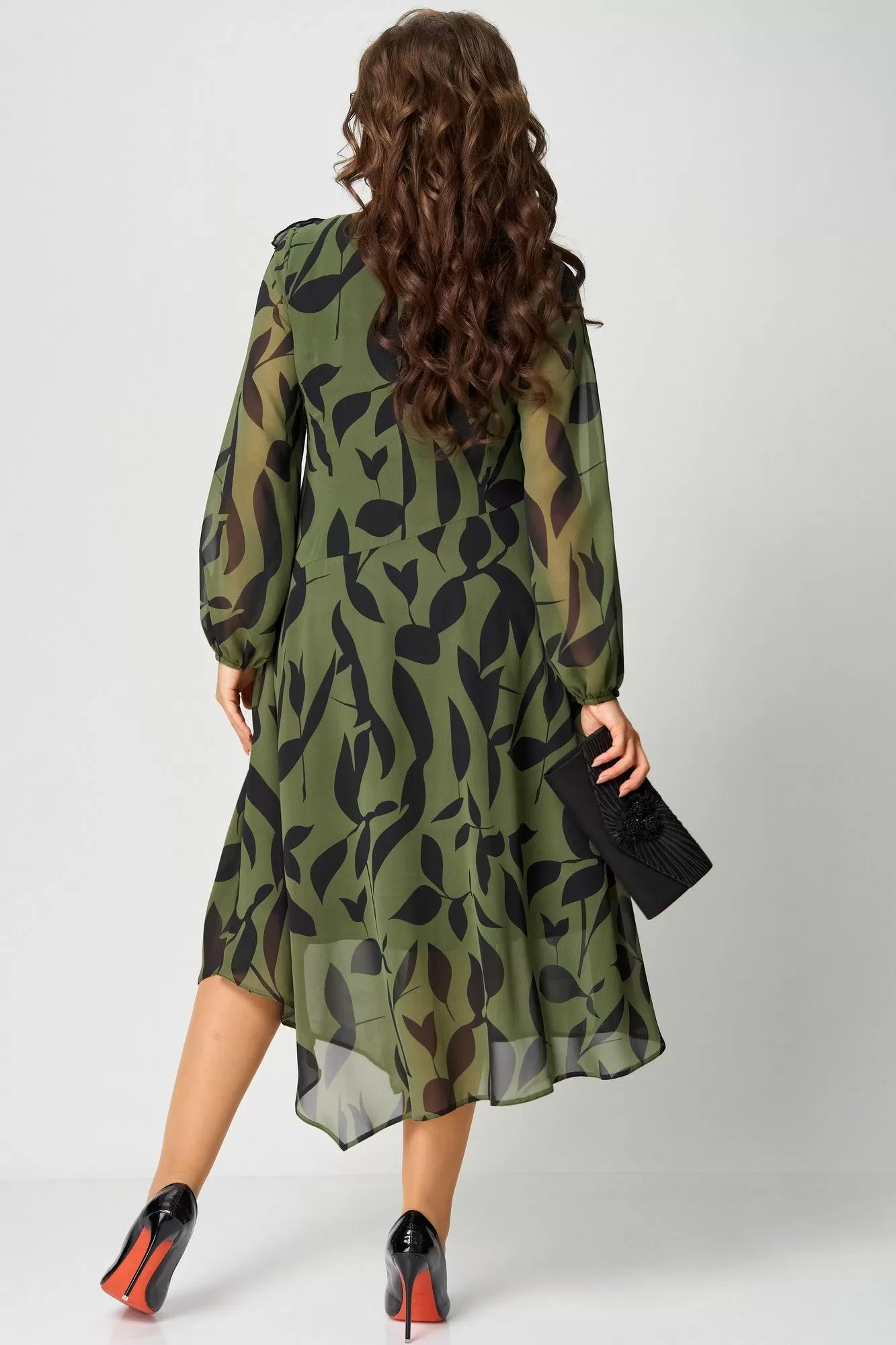 Платье женское нарядное свободного силуэта на подкладке, выполнено из шифона с принтом. Застежка доверху на петли и пуговицы, воротник на стойке рубашечного типа, рукав втачной с приточными воланами со сборкой. По спинке двойная кокетка и встречная складка по центру. Низ фигурный, в боковых швах обработаны небольшие разрезы.