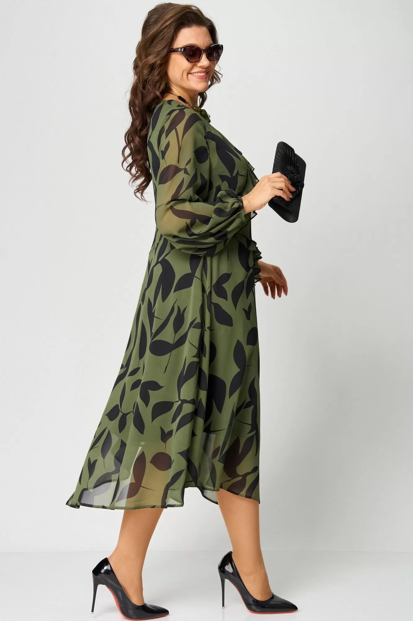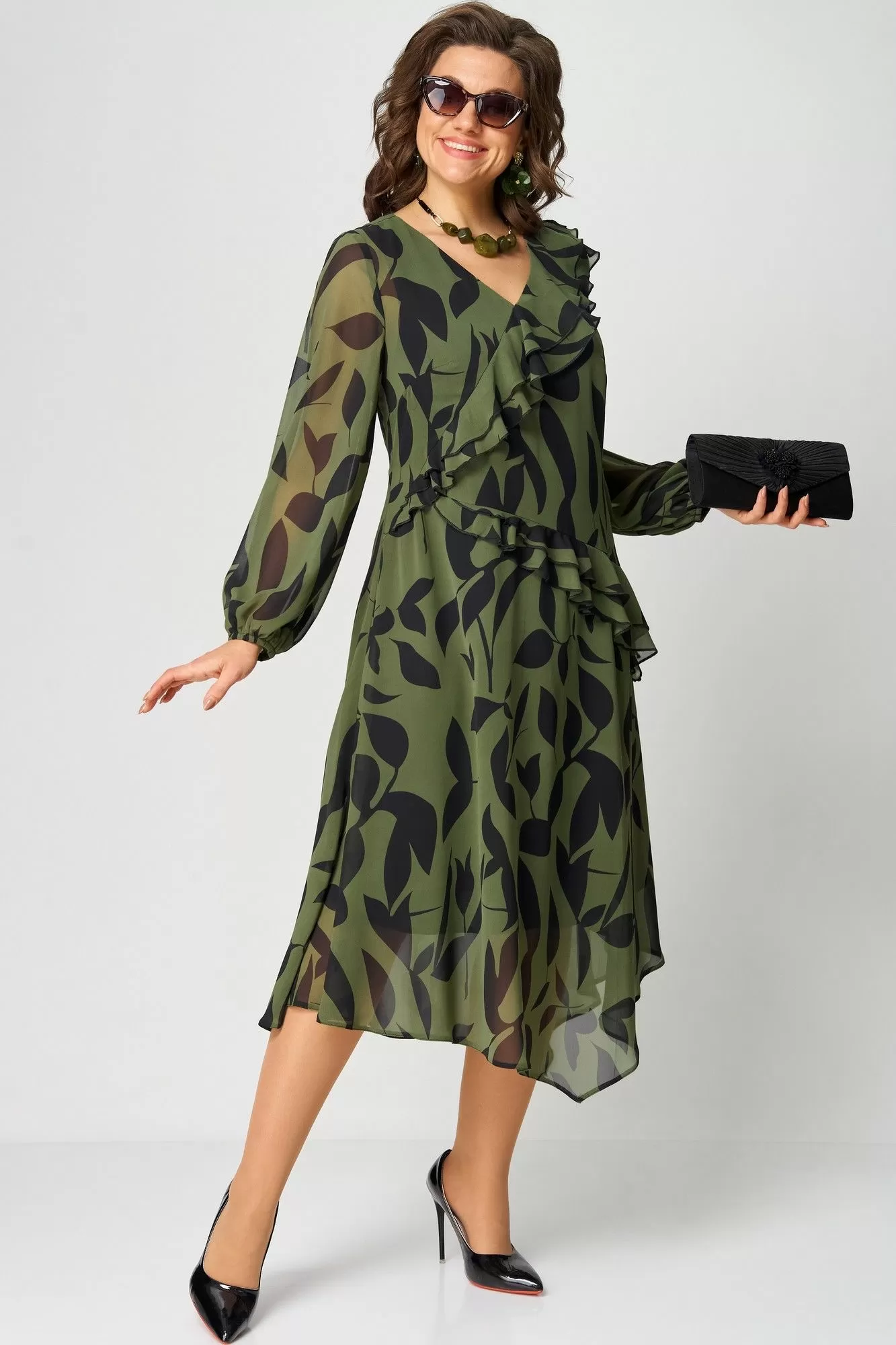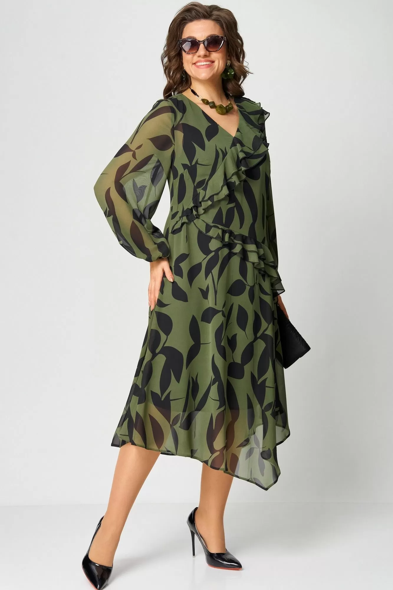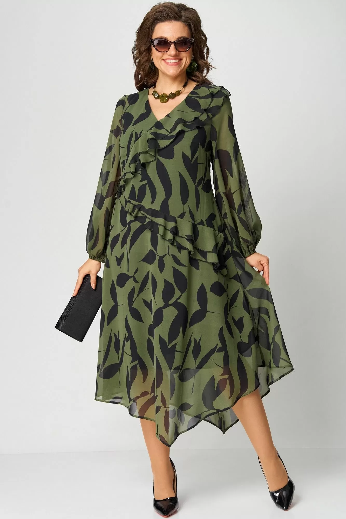 Платье женское нарядное свободного силуэта на подкладке, выполнено из шифона с принтом. Застежка доверху на петли и пуговицы, воротник на стойке рубашечного типа, рукав втачной с приточными воланами со сборкой. По спинке двойная кокетка и встречная складка по центру. Низ фигурный, в боковых швах обработаны небольшие разрезы.