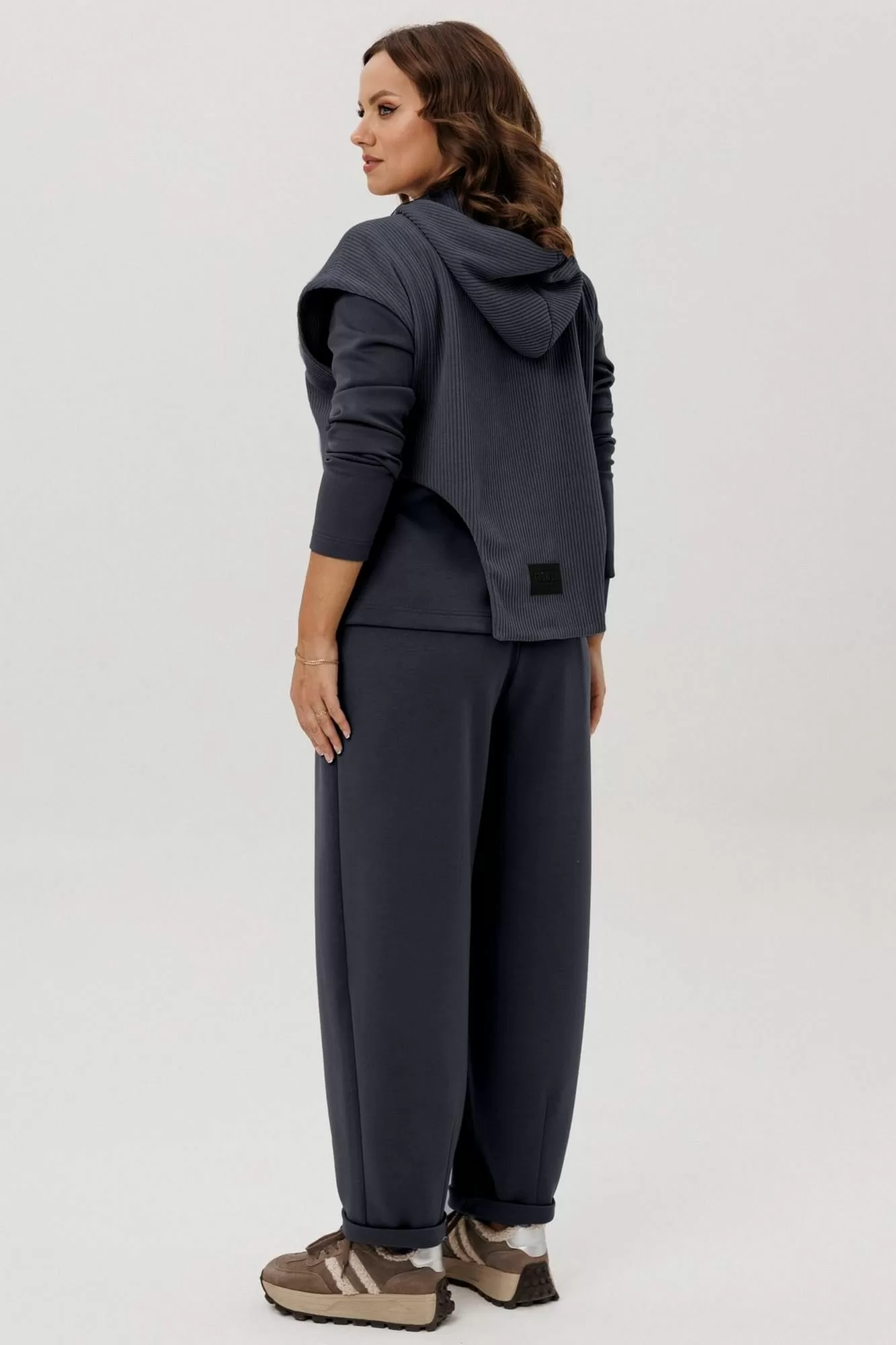 Жилет свободного силуэта с ассиметричным кроем по низу. Изделие без рукавов, с капюшоном. Застежка на тесьму-молнию по переду.