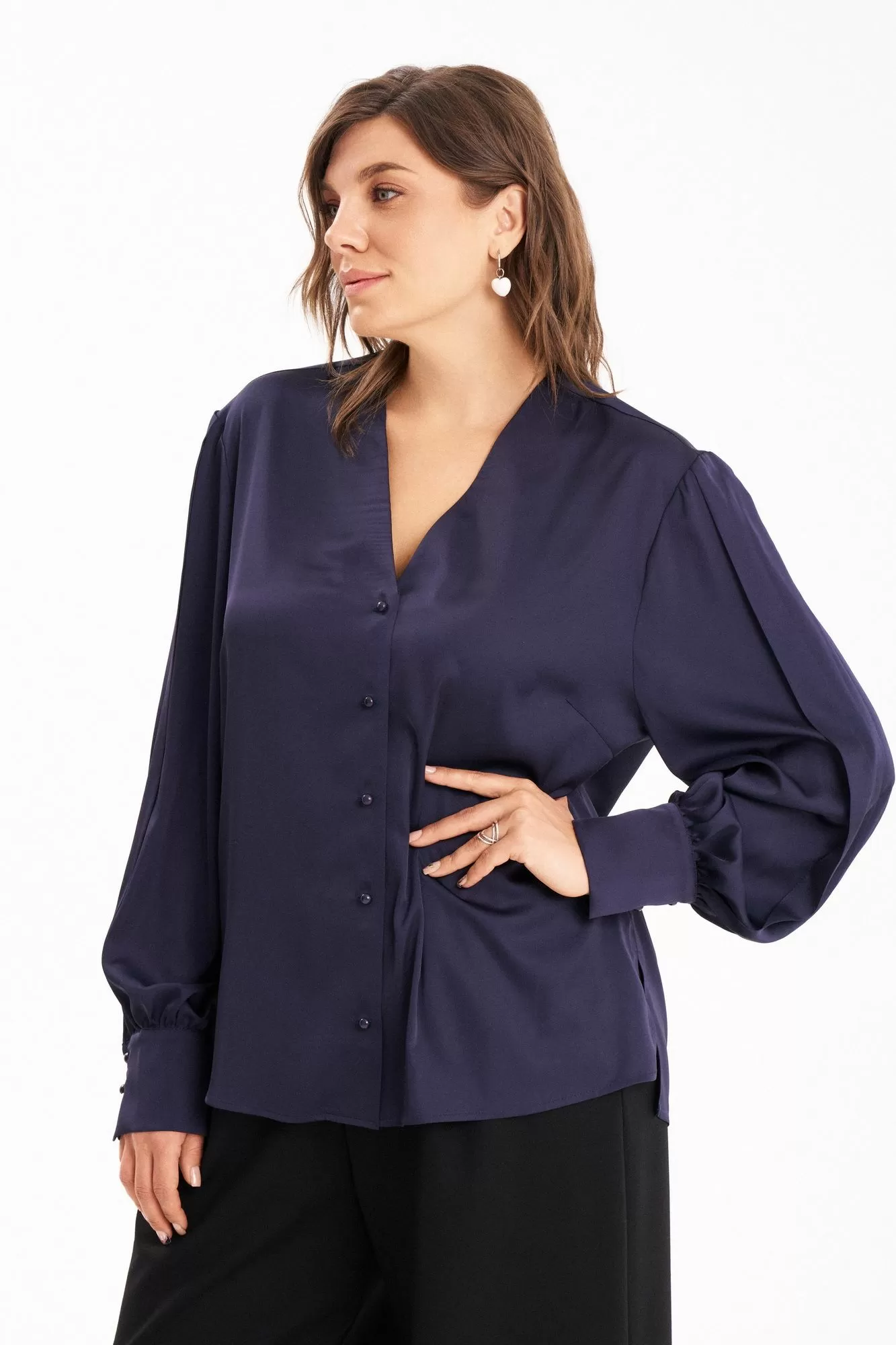 Блузка из струящейся атласной ткани прямого силуэта с V-образной горловиной и застёжкой на пуговицы. Рукав длинный на манжете. Спинка слегка длиннее переда. По бокам разрезы._x000D_