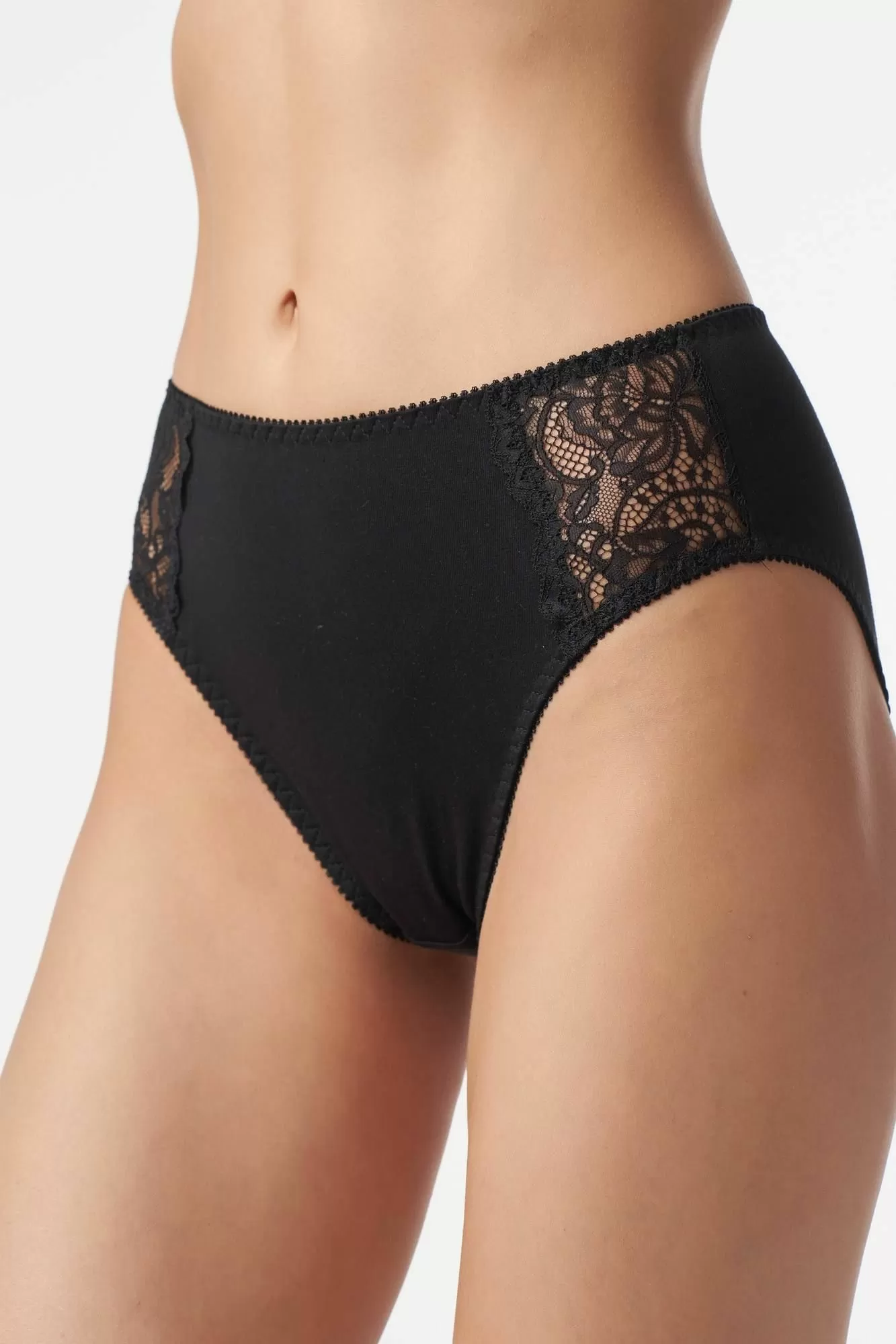 Полноразмерные трусы слипы с высокой линией талии (закрывают пупок), выполненные из хлопка и декорированные вставками из кружева по бокам. Подкладка ластовицы из 100% х/б.