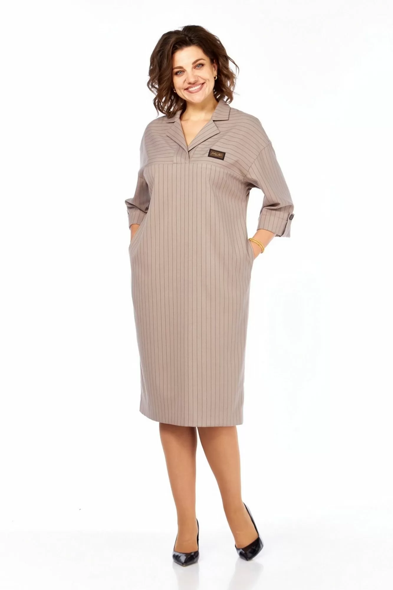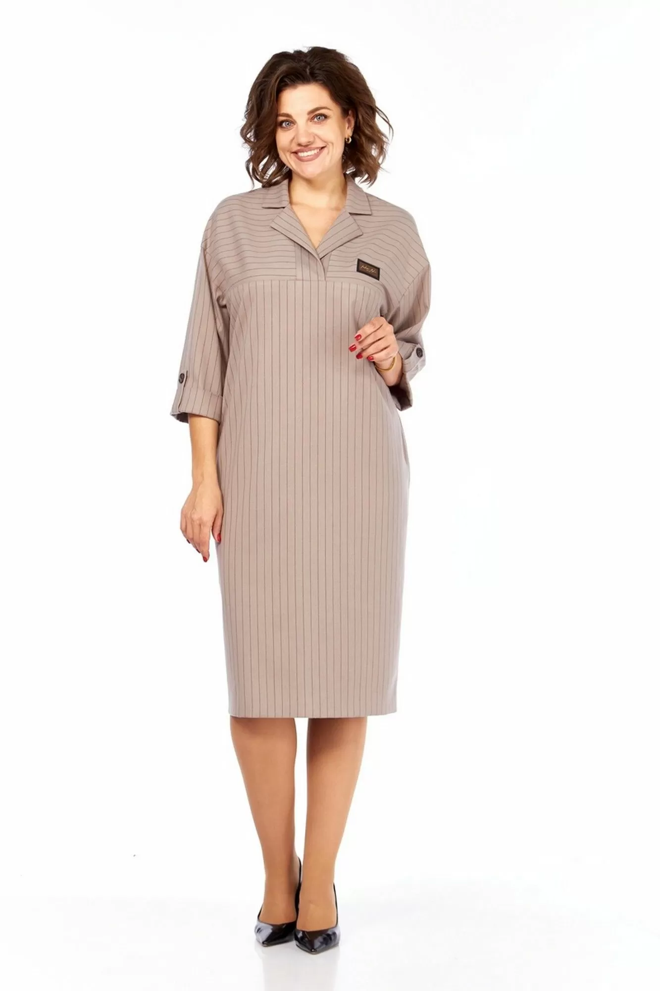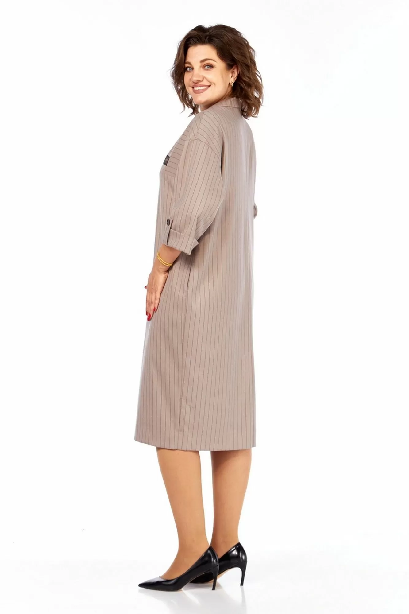 Платье полуприлегающего силуэта, длины миди, без подкладки. На полочке обработана отрезная кокетка, воротник отложной, пиджачного типа. Плечи изделия приспущены, рукава укорочены и заканчиваются манжетой, по низу пришит декоративный элемент (в виде паты), свободный край которого закреплен к рукаву пуговицей. Слева на груди – декоративный пришивной элемент (нашивка). По спинке шов, который заканчивается шлицей, для удобства при ходьбе. В боковых швах обработаны карманы-хулиганы.