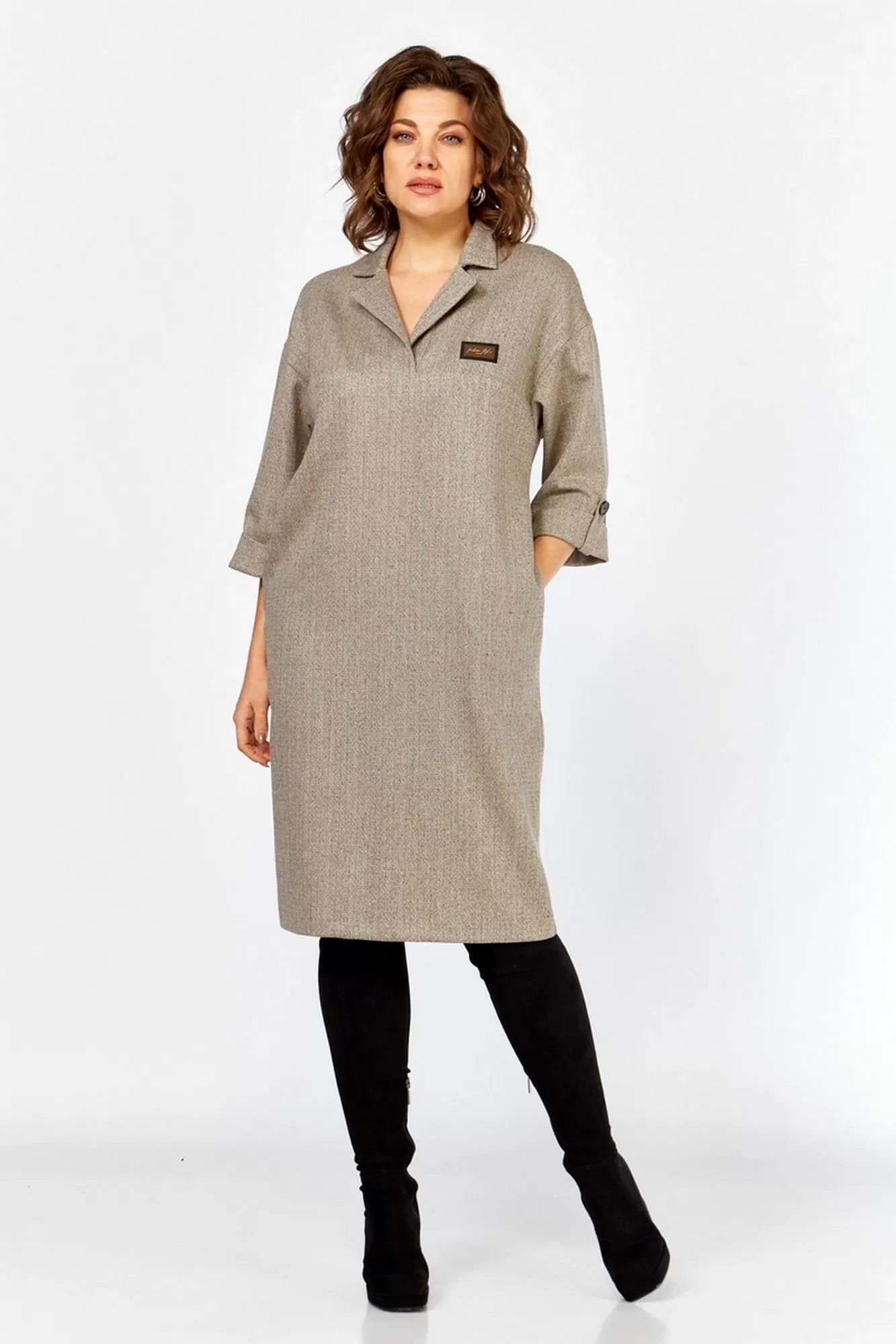 Платье полуприлегающего силуэта, длины миди, без подкладки. На полочке обработана отрезная кокетка, воротник отложной, пиджачного типа. Плечи изделия приспущены, рукава укорочены и заканчиваются манжетой, по низу пришит декоративный элемент (в виде паты), свободный край которого закреплен к рукаву пуговицей. Слева на груди – декоративный пришивной элемент (нашивка). По спинке шов, который заканчивается шлицей, для удобства при ходьбе. В боковых швах обработаны карманы-хулиганы.