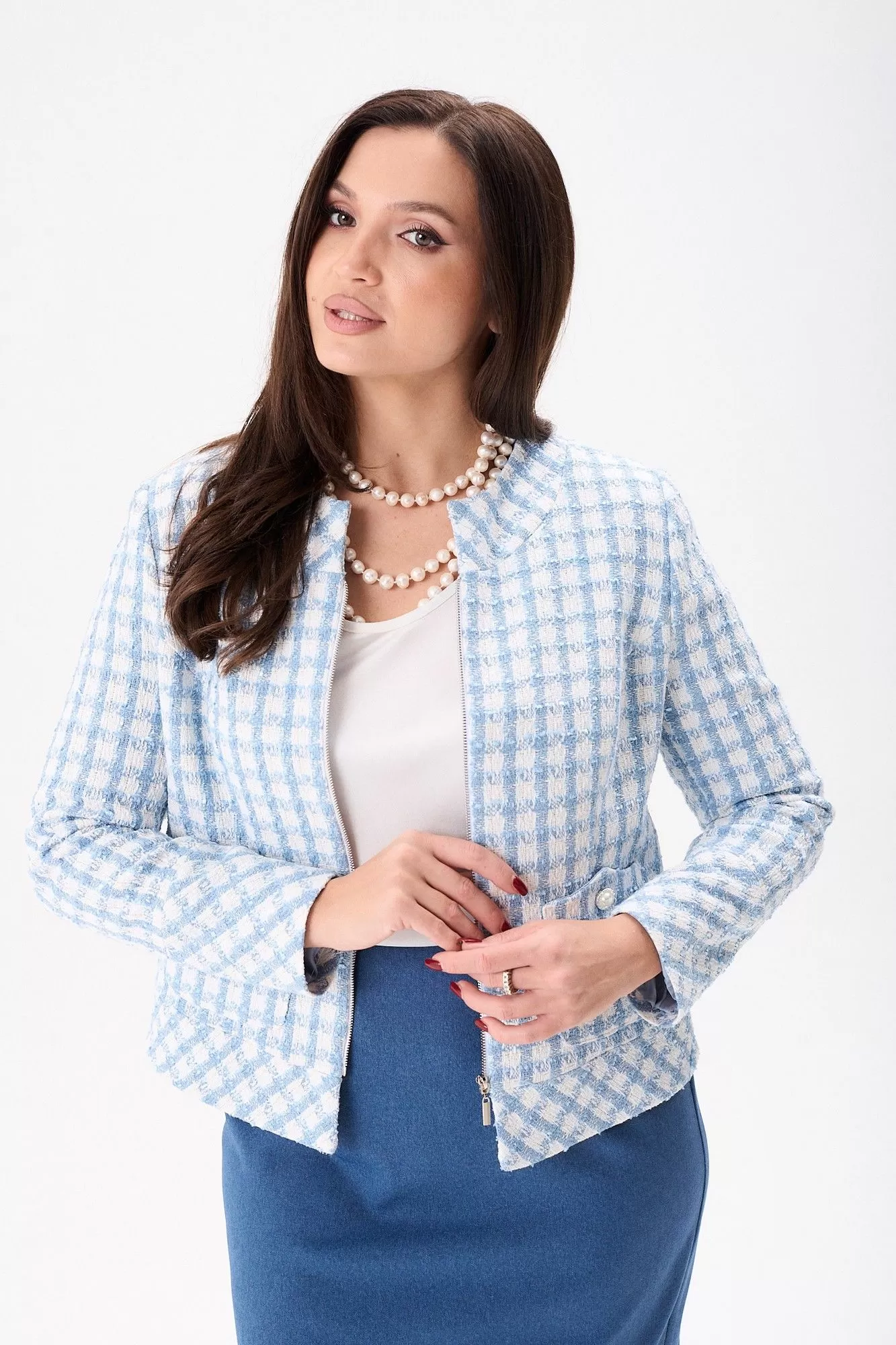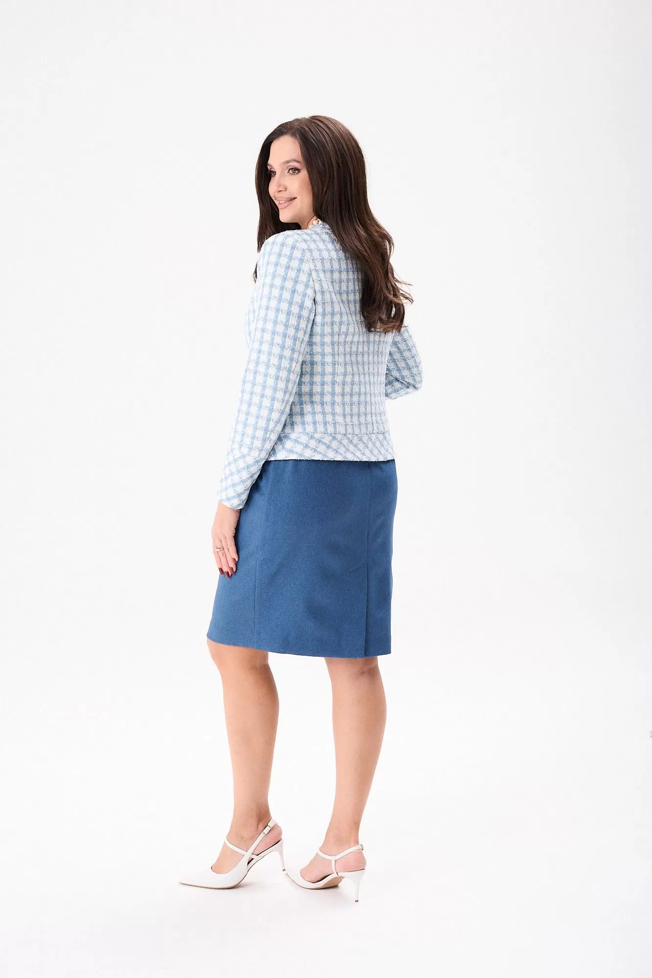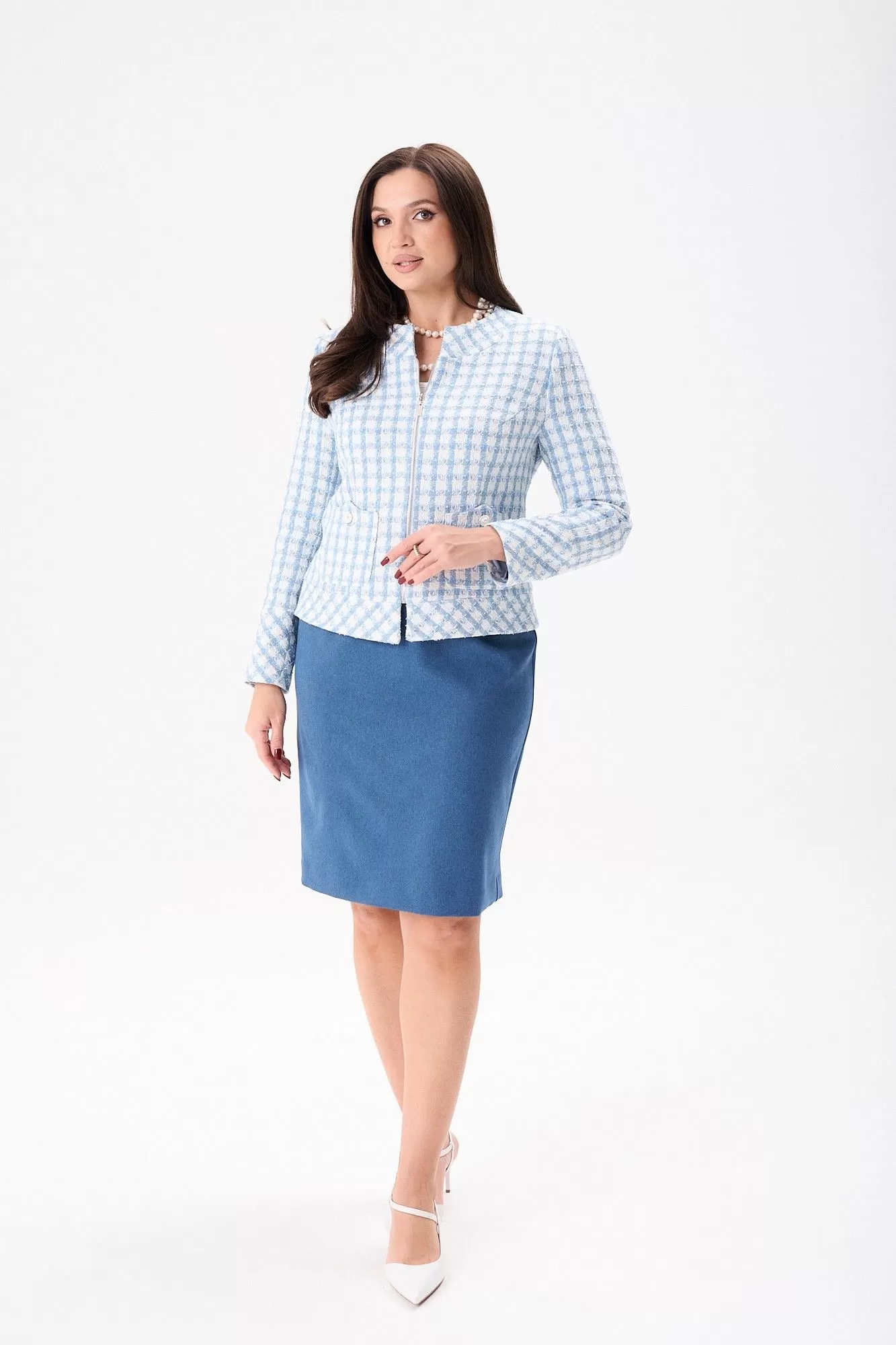 Костюм женский полуприлегающего силуэта состоит из жакета и юбки. Жакет на подкладке. По переду нагрудные вытачки, накладные фигурные карманы, застёжка на тесьму молния. Спинка с талевыми вытачками и центральным швом. По горловине и низу жакета притачная планка. Горловина круглая. Рукава двухшовные втачные на широкой манжете. Юбка, слегка зауженная к низу, без пояса, на обтачке. По переду талевые вытачки. По спинке талевые вытачки. Застёжка потайная тесьма молния расположена в центральном шве спинки. Юбка на подкладке.