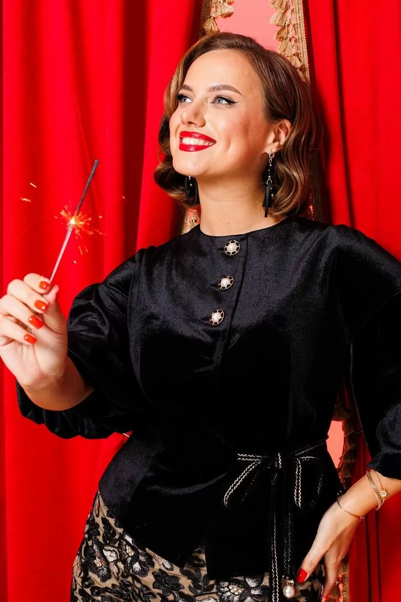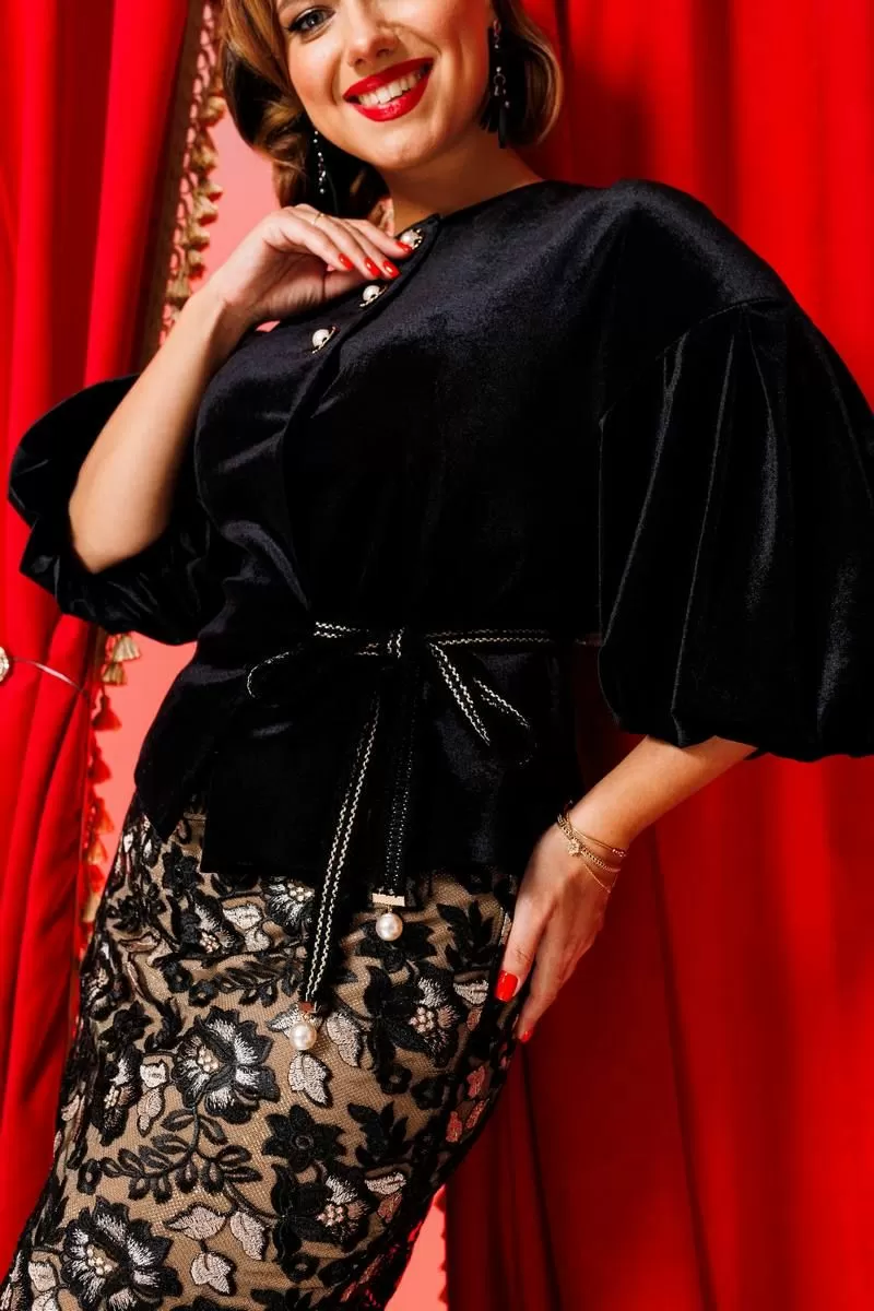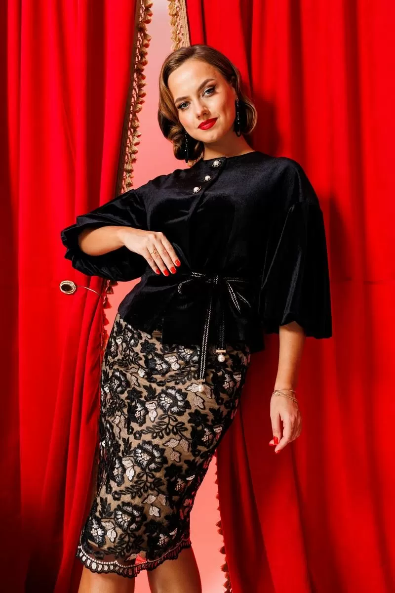 Нарядный комплект, состоящий из жакета и юбки. Комфортный жакет из велюра полуприлегающего силуэта с центральной комбинированной застежкой на 3 пуговицы и 3 потайные кнопки. Спинка со средним швом и талиевыми вытачками. По переду также талиевые вытачки. Горловина округлой формы. Объемные фантазийные рукава со складками смягчают строгий силуэт. Декором выступают декоративные пуговицы и завязка на талии. Юбка двухслойная, заужена к низу. Верхний слой выполнен из кружевного полотна (гипюра). Нижний - из трикотажного эластичного полотна с блестящим напылением. Молния и шлица в среднем шве. По талии кокетки. Костюм на подкладке.