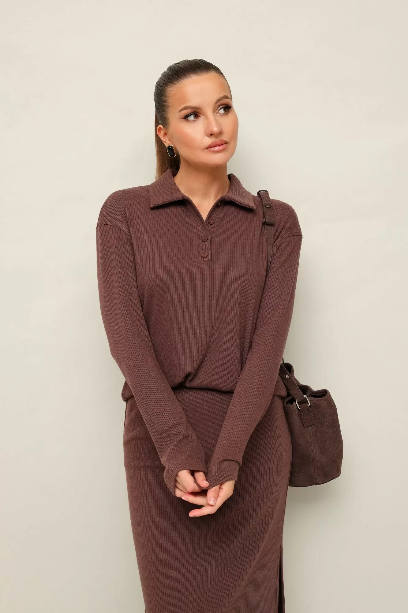 Комфортный трикотажный комплект, состоящий из поло и юбки. Поло с отложным воротником с цельнокроеной стойкой. Вырез горловины обработан притачными планками с застежкой на петли и пуговицы. Спущенная линия втачивания рукава. Юбка прямого кроя, пояс на резинке, в боковых швах обработаны высокие разрезы.