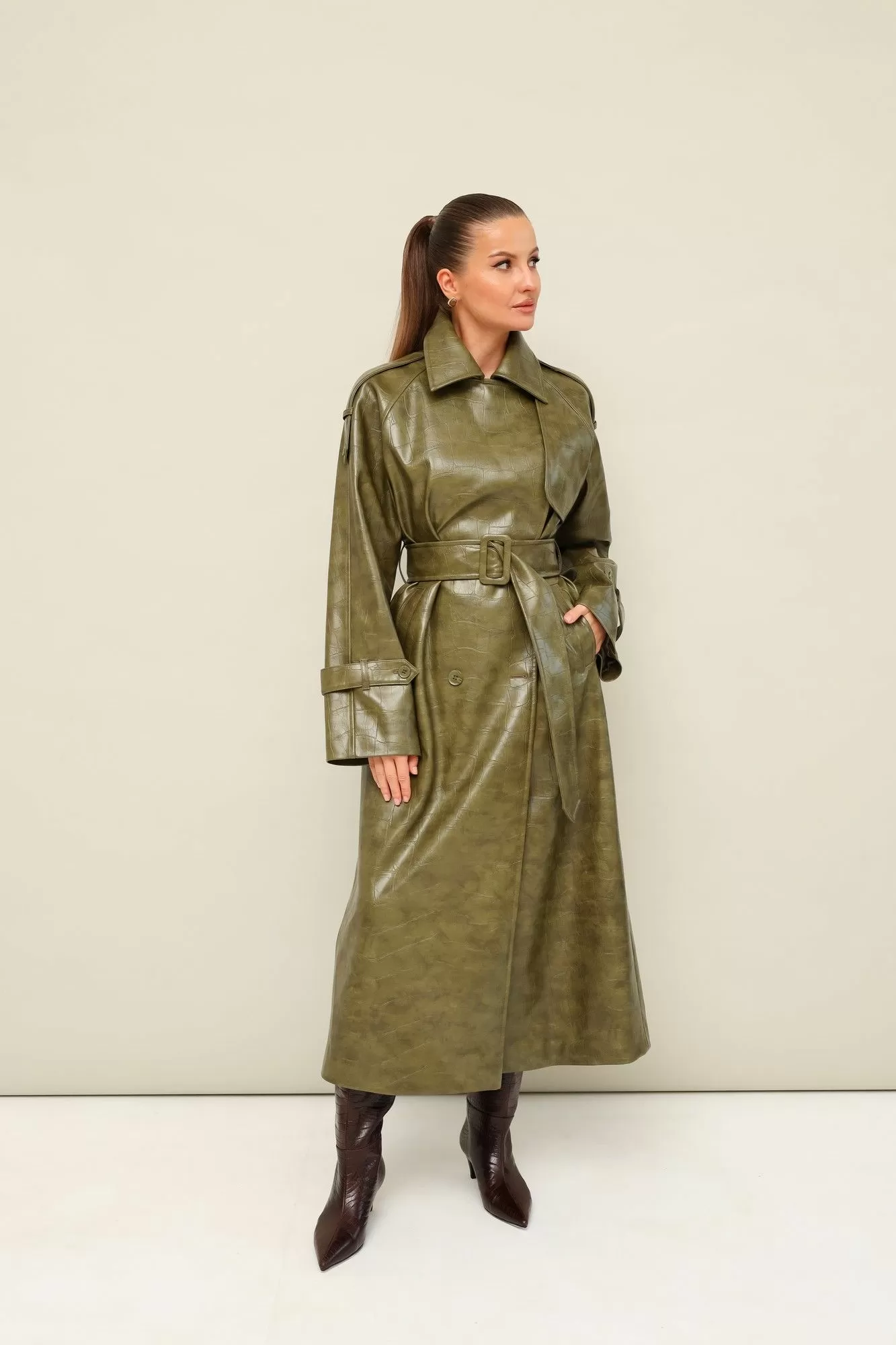 Плащ актуального прямого силуэта, выполнен из плотной экокожи с тиснением. Воротник пиджачного типа с отложными лацканами. Двубортная застёжка на петли и пуговицы. По плечевому шву обработаны погоны. Спереди отлетная кокетка и наклонные карманы с листочкой. Рукава кроя реглан, с патами по низу, с фиксацией на пуговицы. Спинка со средним швом. Для удобства движения сзади обработана шлица. Тренч на подкладке. В комплекте пояс из основной ткани с пряжкой.
