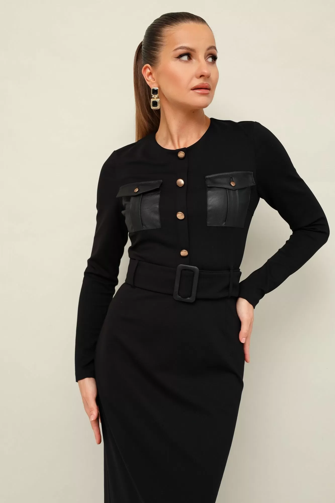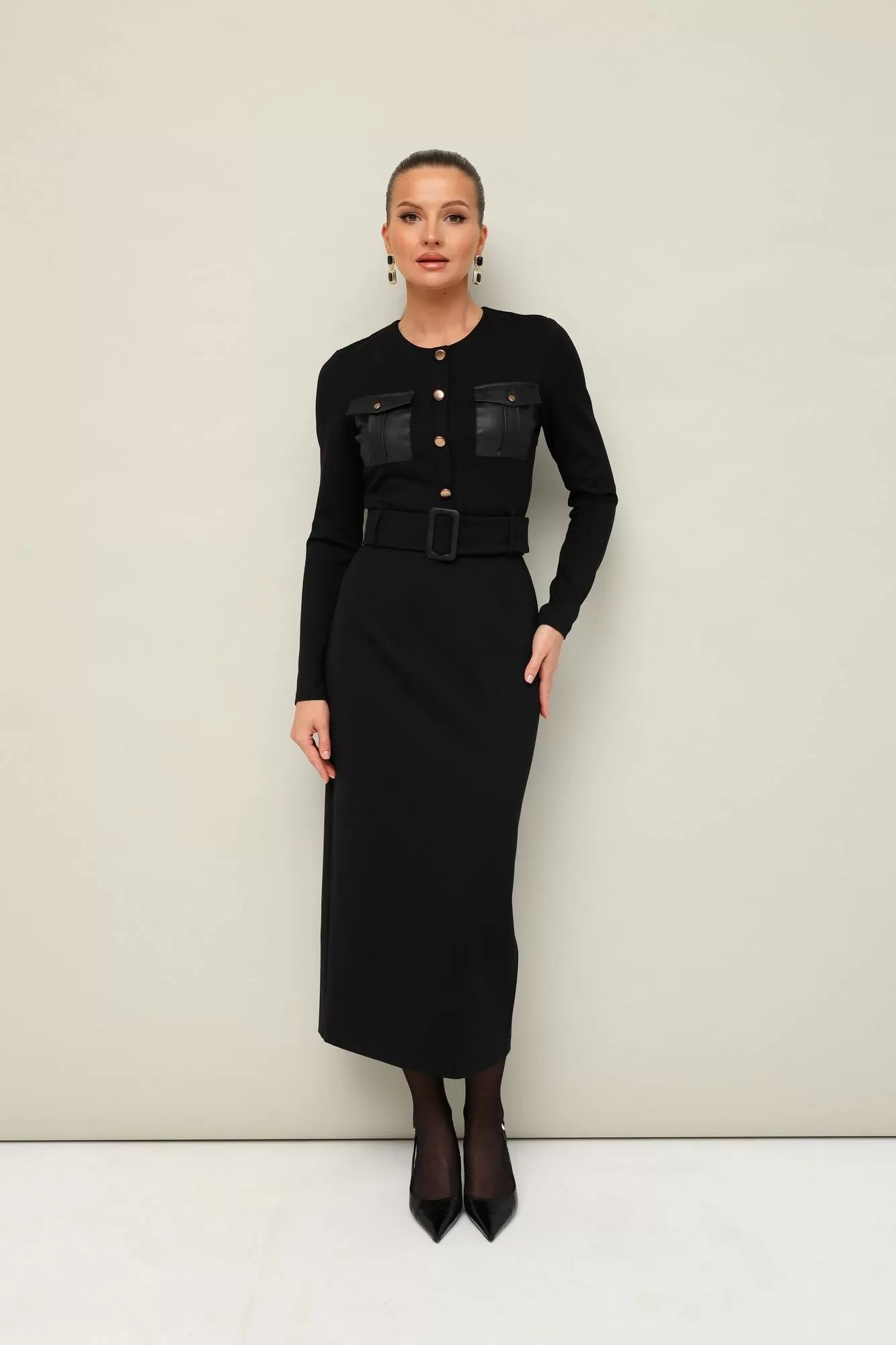 Платье прилегающего силуэта, отрезное по линии талии, выполнено из эластичного трикотажного полотна.