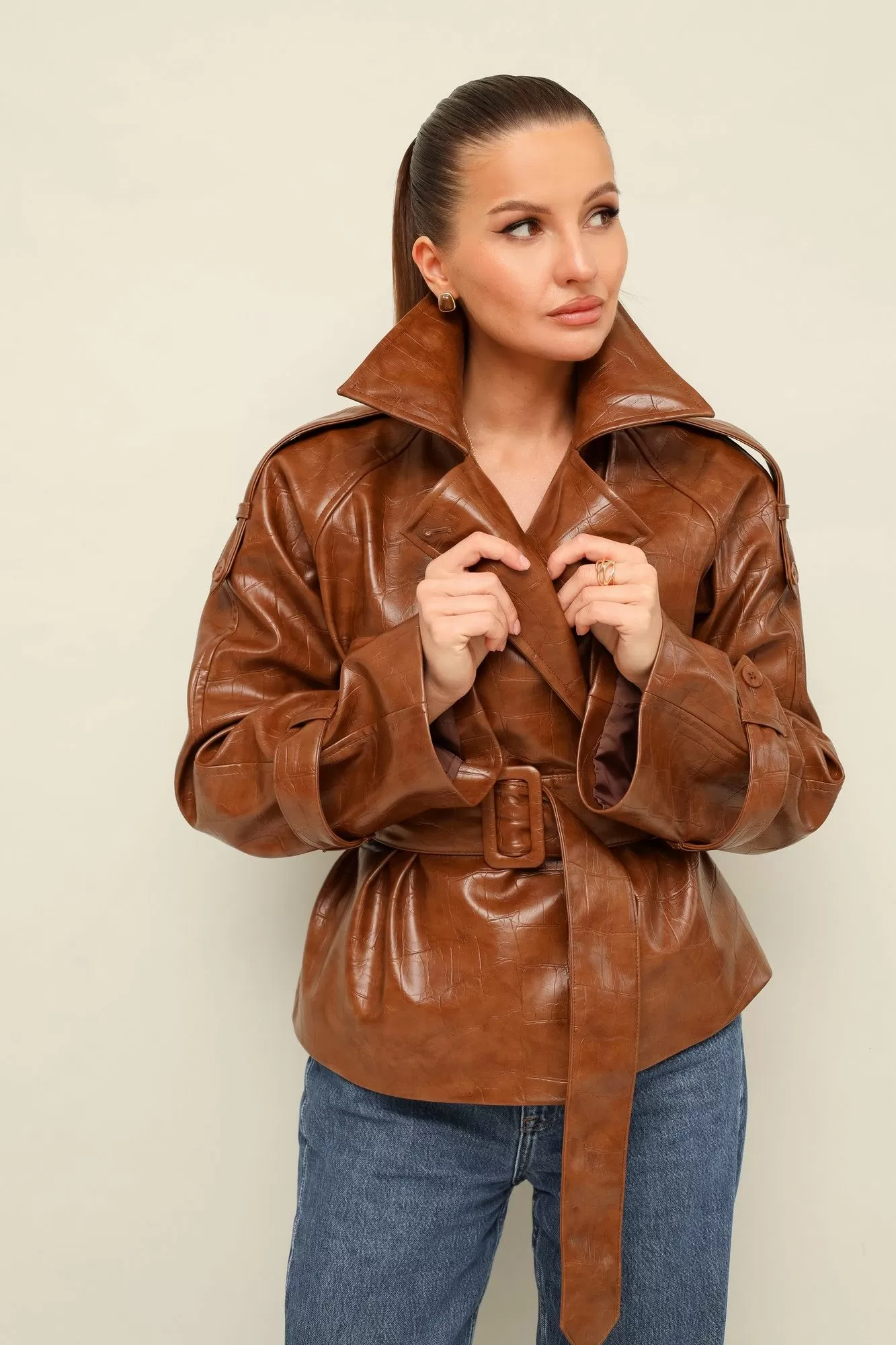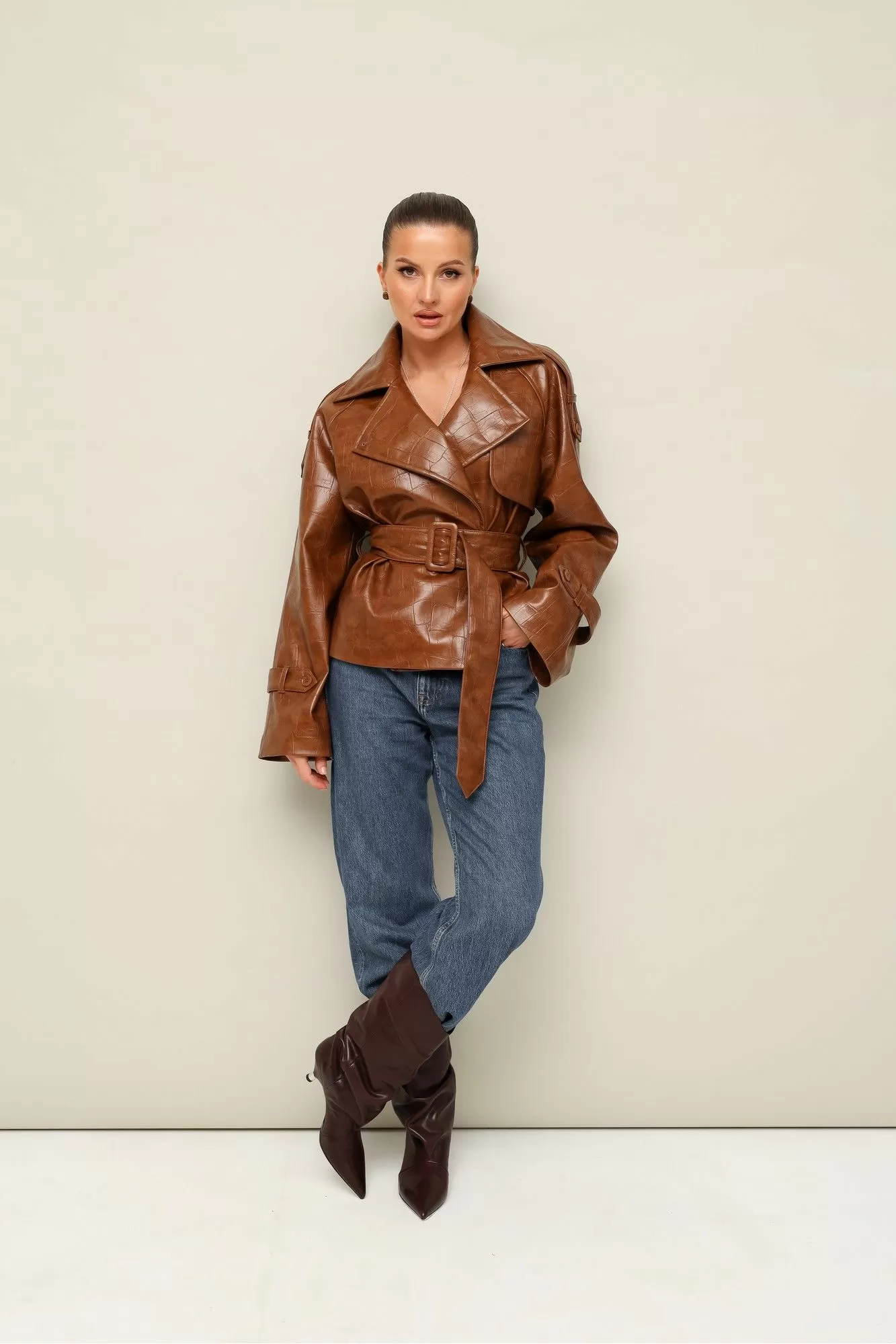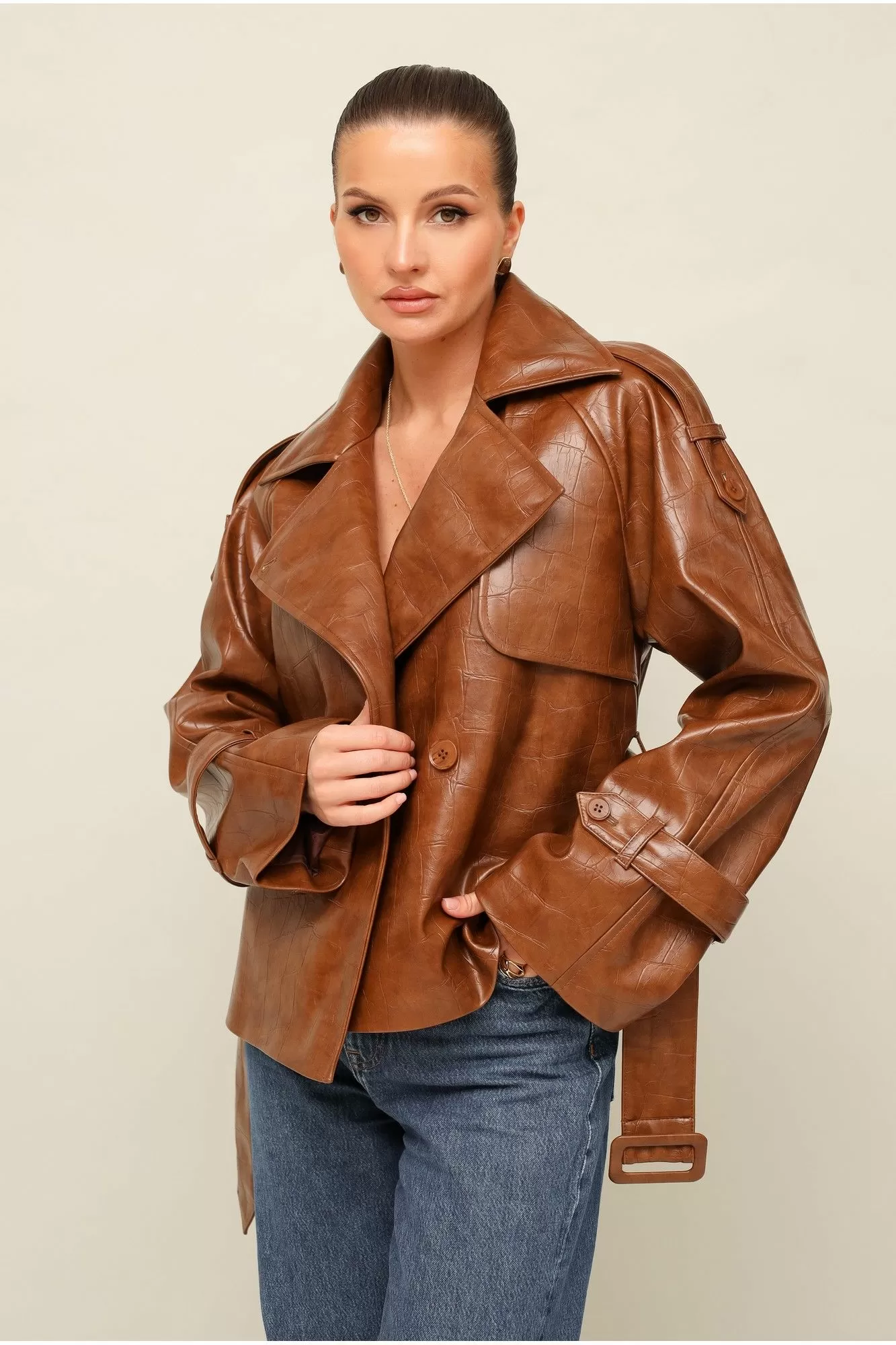Жакет современного прямого силуэта, двубортный с застежкой на петли и пуговицы. По плечевому шву обработаны погоны. Воротник пиджачного типа с отложными лацканами. Спереди отлетная кокетка. Рукава кроя реглан, с патами по низу, с фиксацией на пряжки. Спинка со средним швом. Изделие на подкладке. В комплекте пояс из основной ткани с пряжкой.