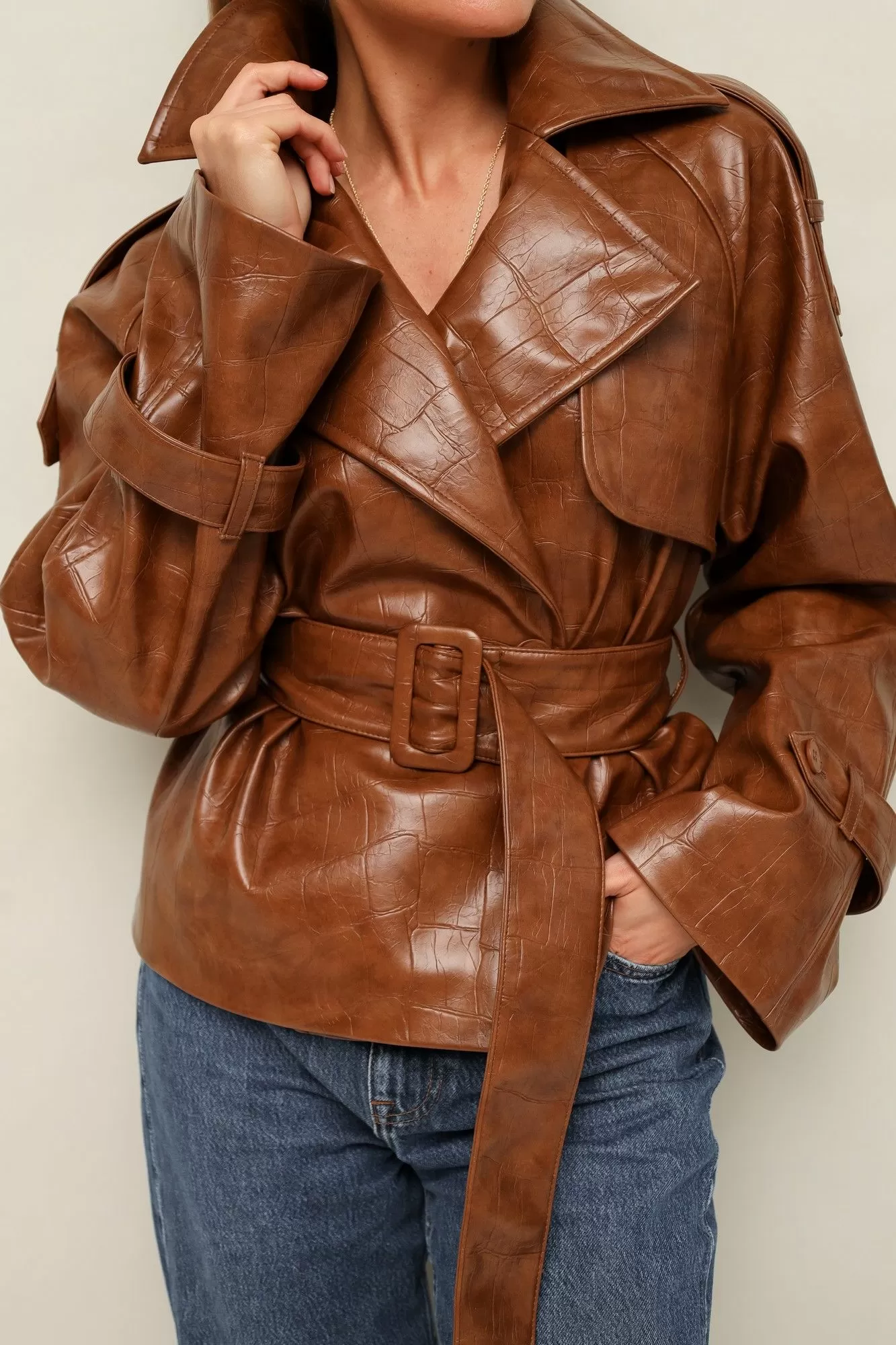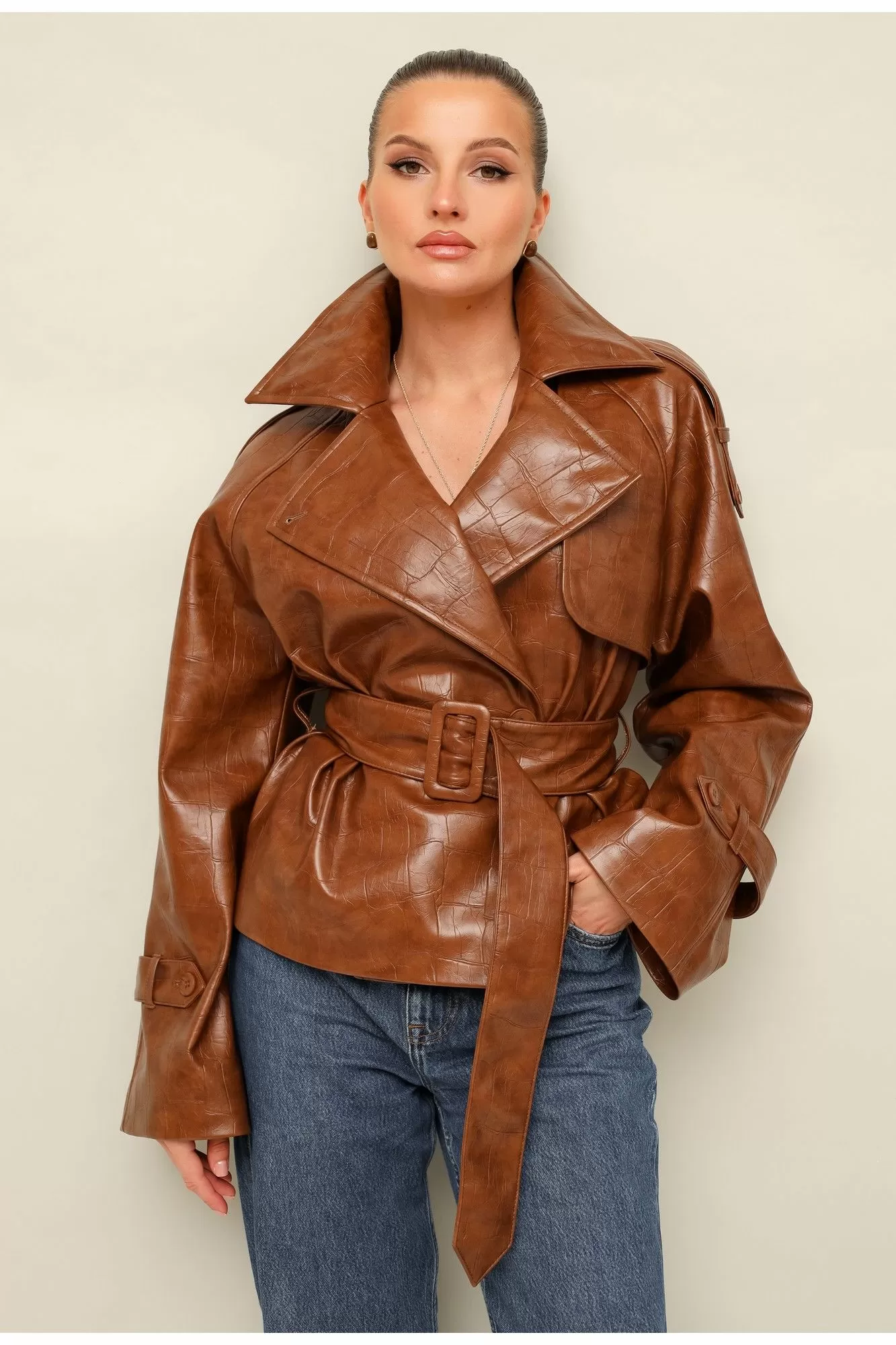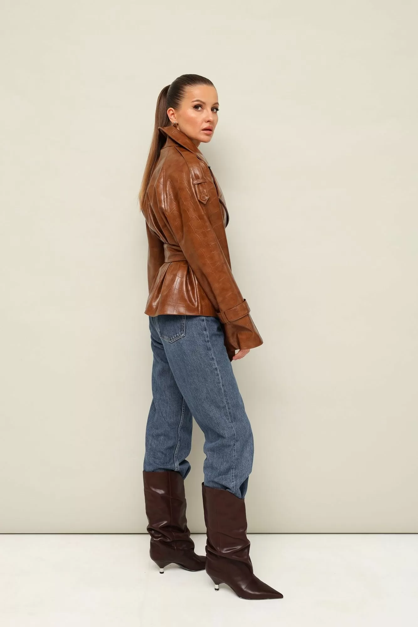 Жакет современного прямого силуэта, двубортный с застежкой на петли и пуговицы. По плечевому шву обработаны погоны. Воротник пиджачного типа с отложными лацканами. Спереди отлетная кокетка. Рукава кроя реглан, с патами по низу, с фиксацией на пряжки. Спинка со средним швом. Изделие на подкладке. В комплекте пояс из основной ткани с пряжкой.