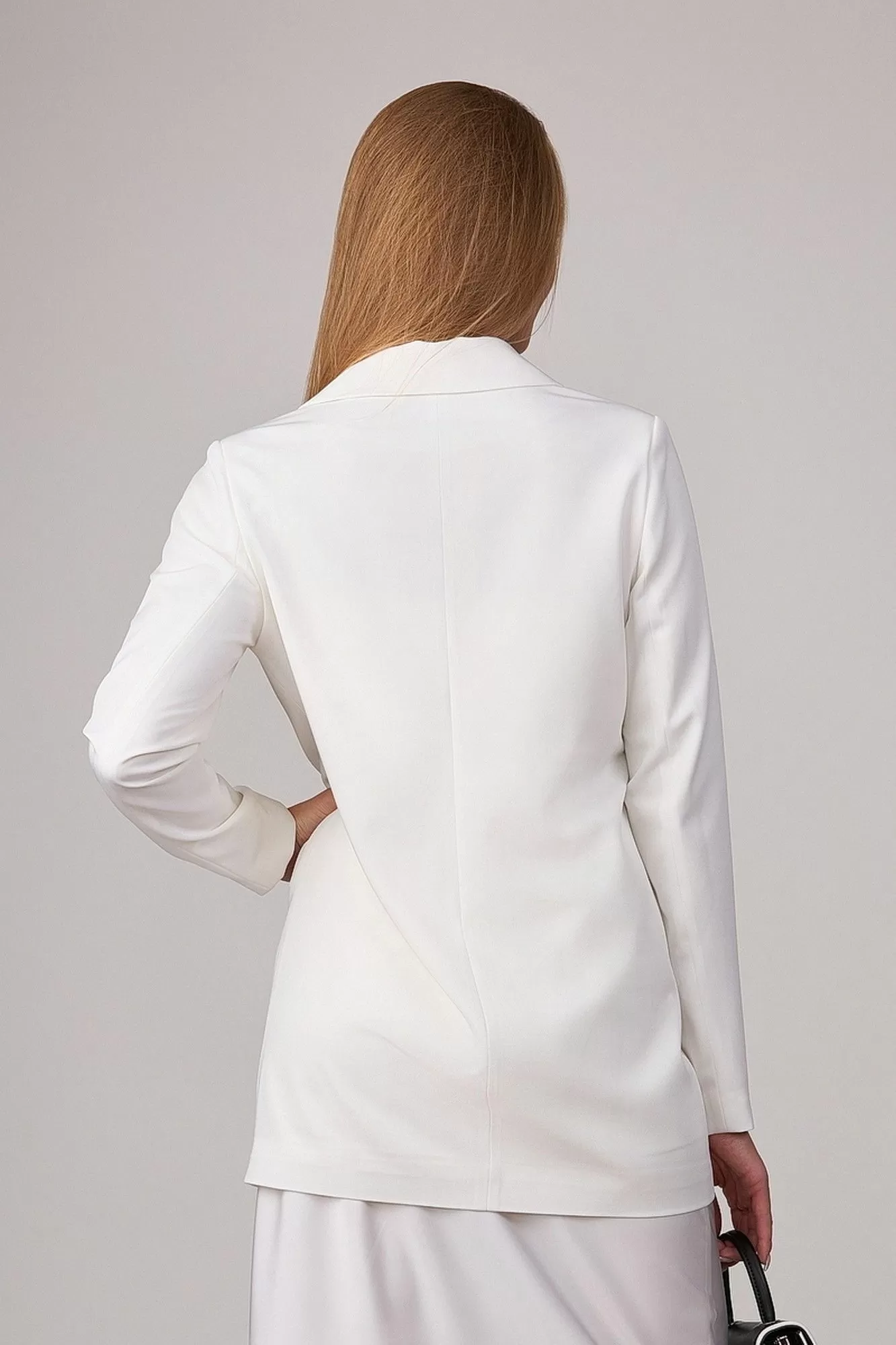 Жакет из костюмной ткани на подкладке. Жакет прямого силуэта с двубортной застежкой на 2 петли и пуговицы ,одну потайную, 4 декоративные пуговицы. По переду- прорезные карманы с клапанами. Воротник-с отложными лацканами пиджачного типа, двухшовные, длинные.