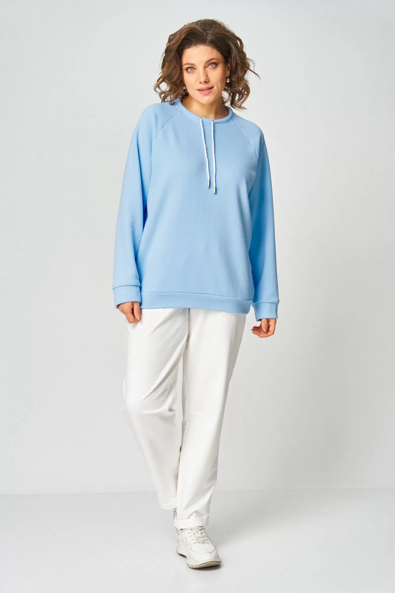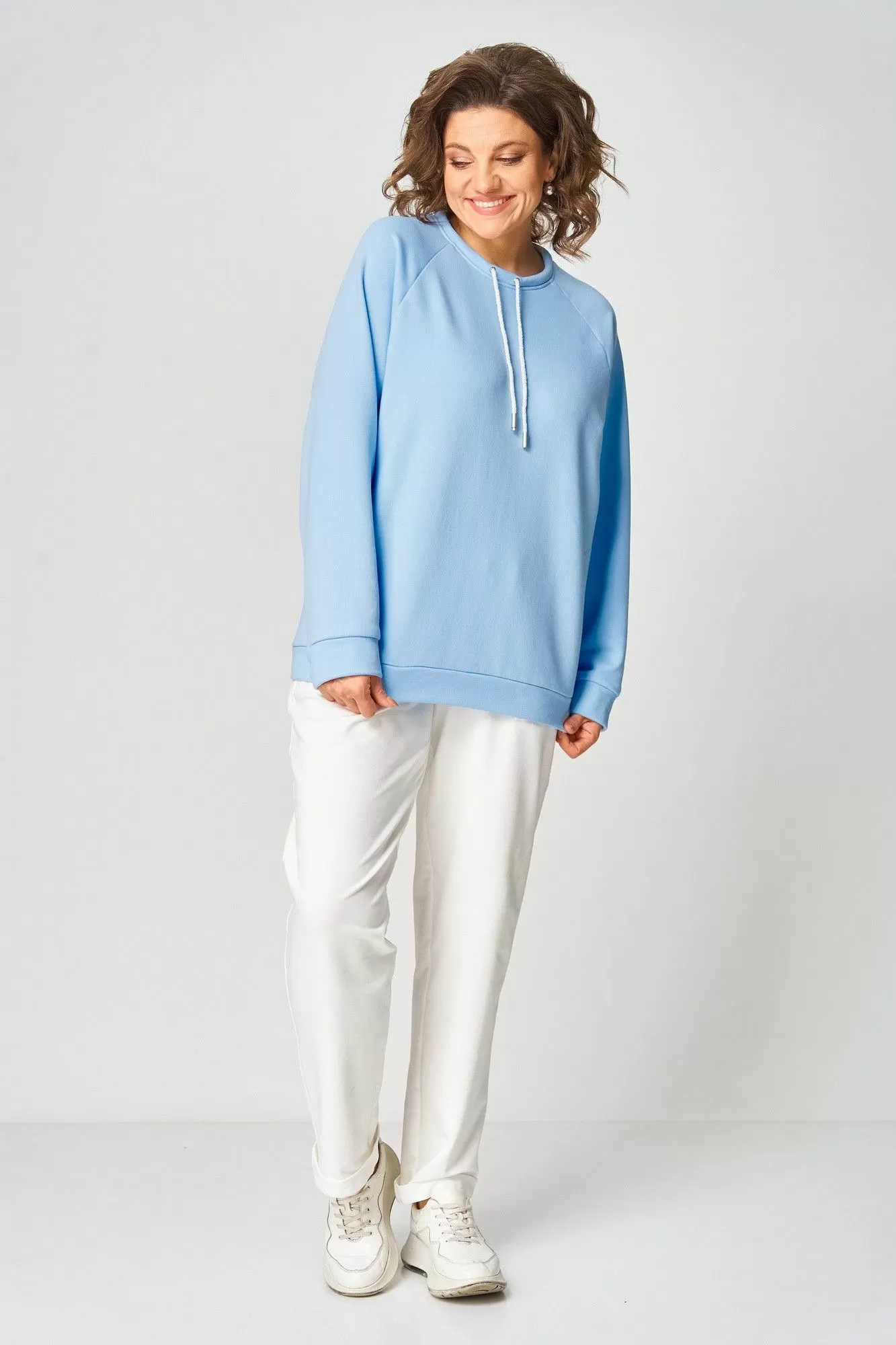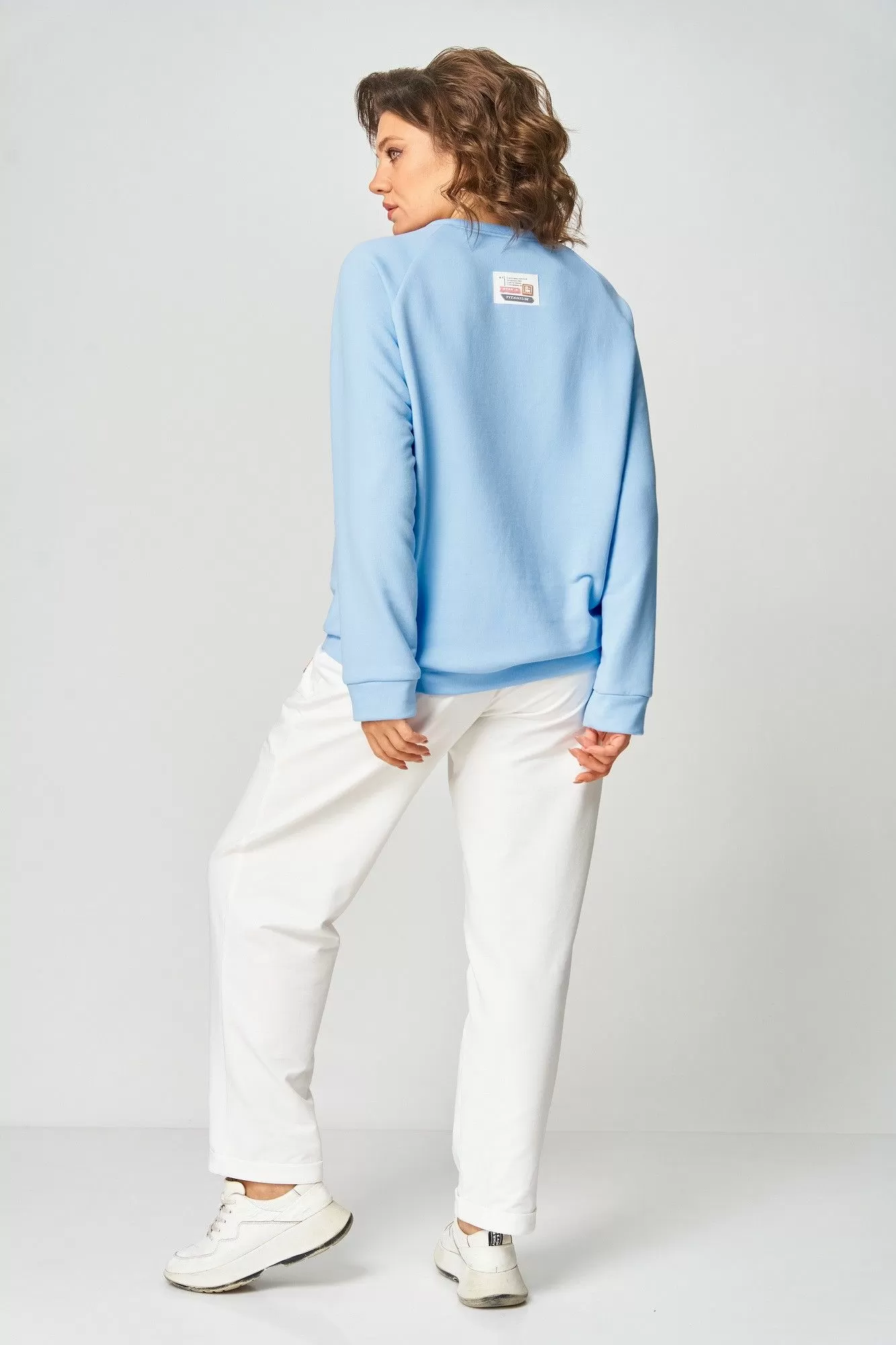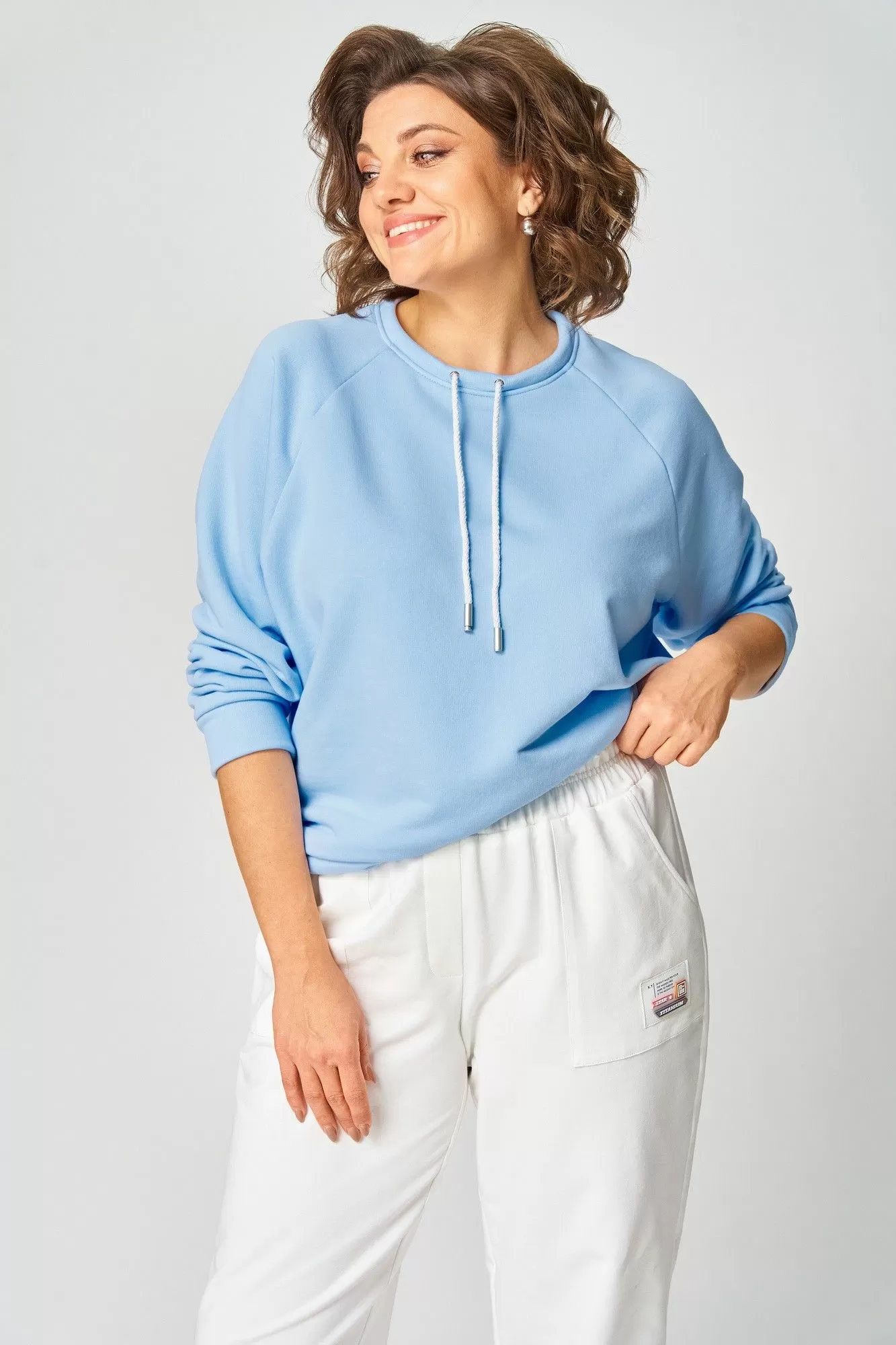 Джемпер женский из трикотажной хлопковой ткани (трехнитка). Рукав реглан. Низ рукава обработан притачной манжетой. Низ изделия оформлен притачным поясом. На спинке настрочен декоративный элемент. Вырез горловины круглый, обработан бейкой со шнуром.