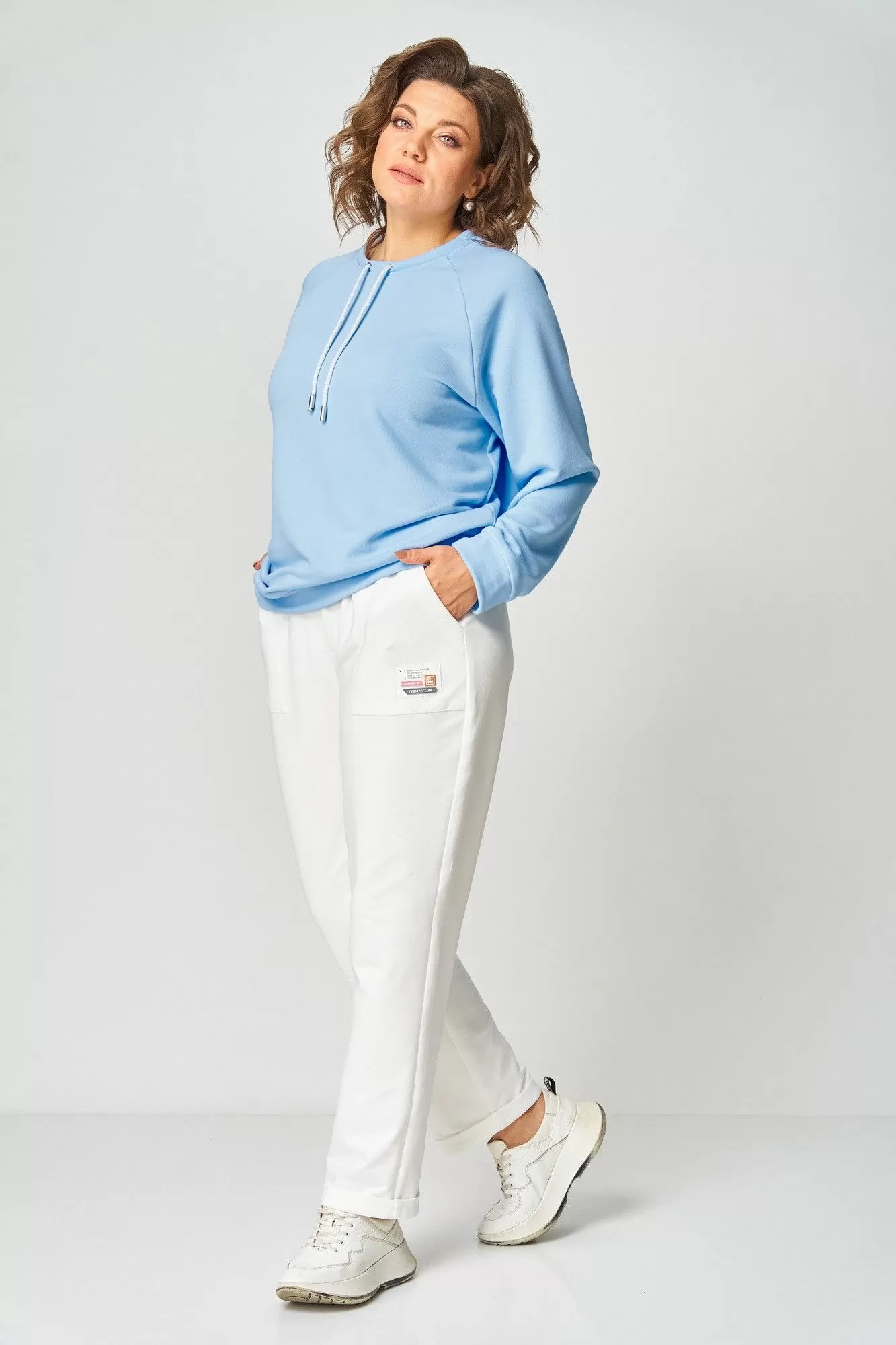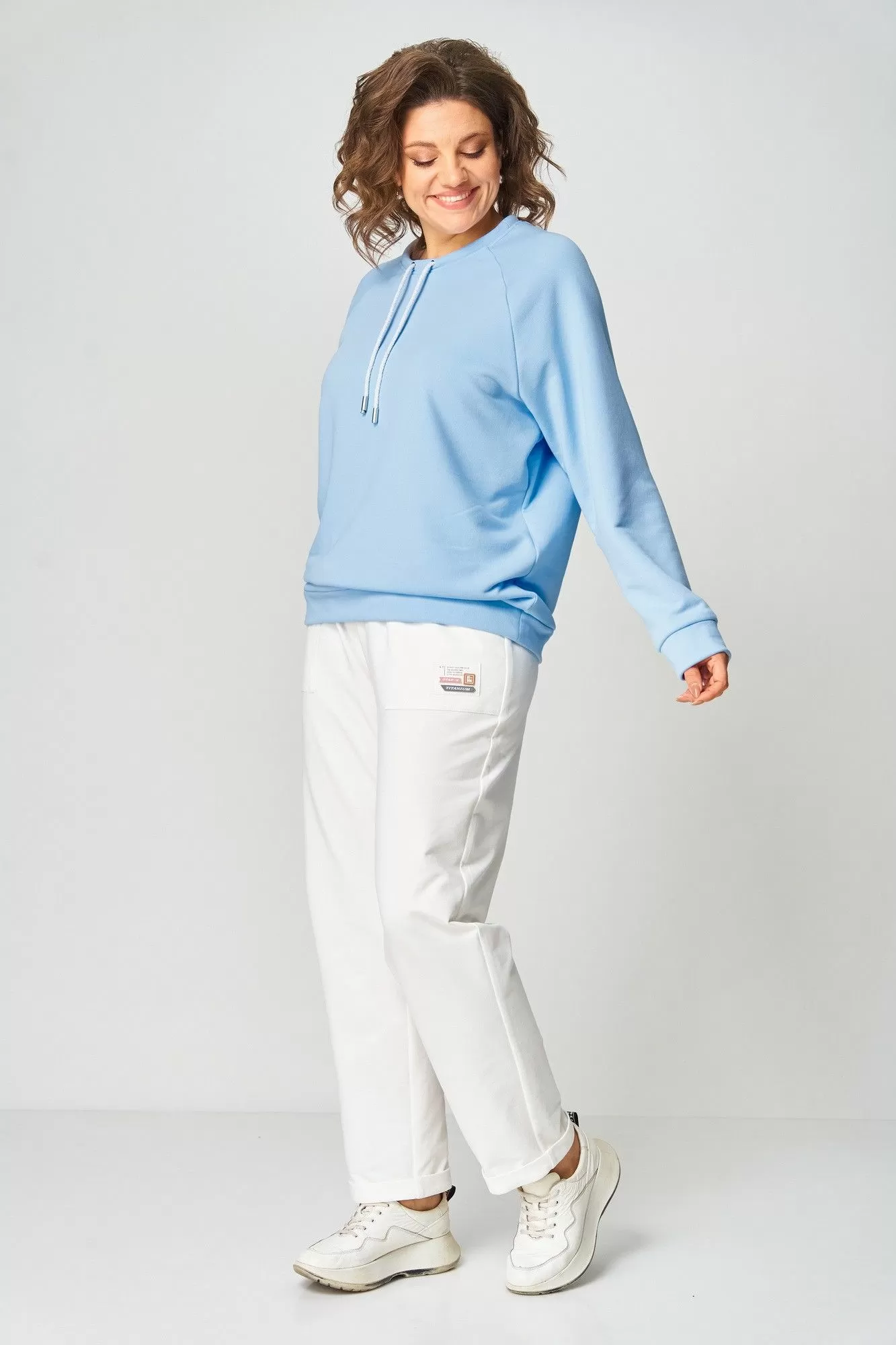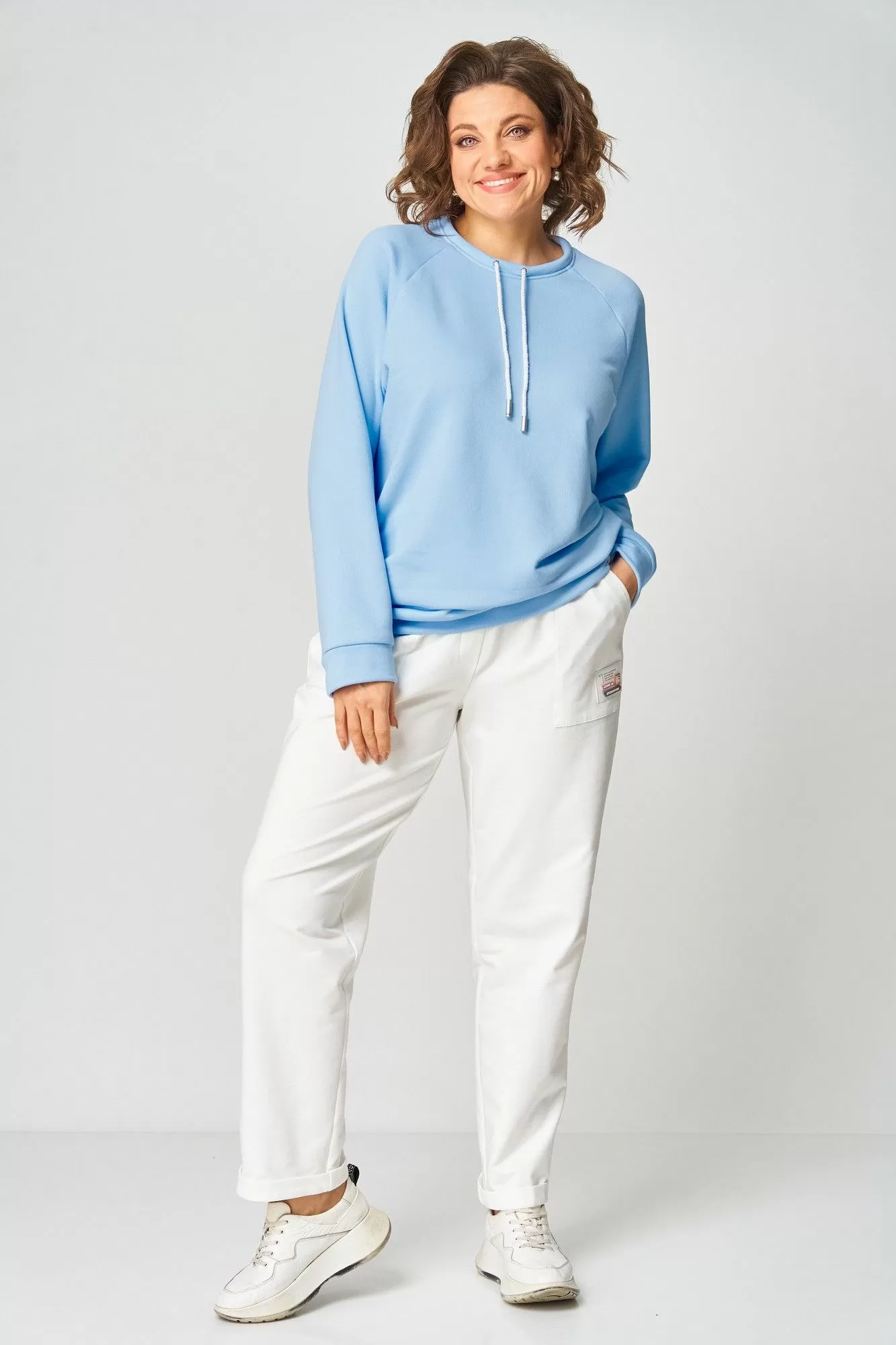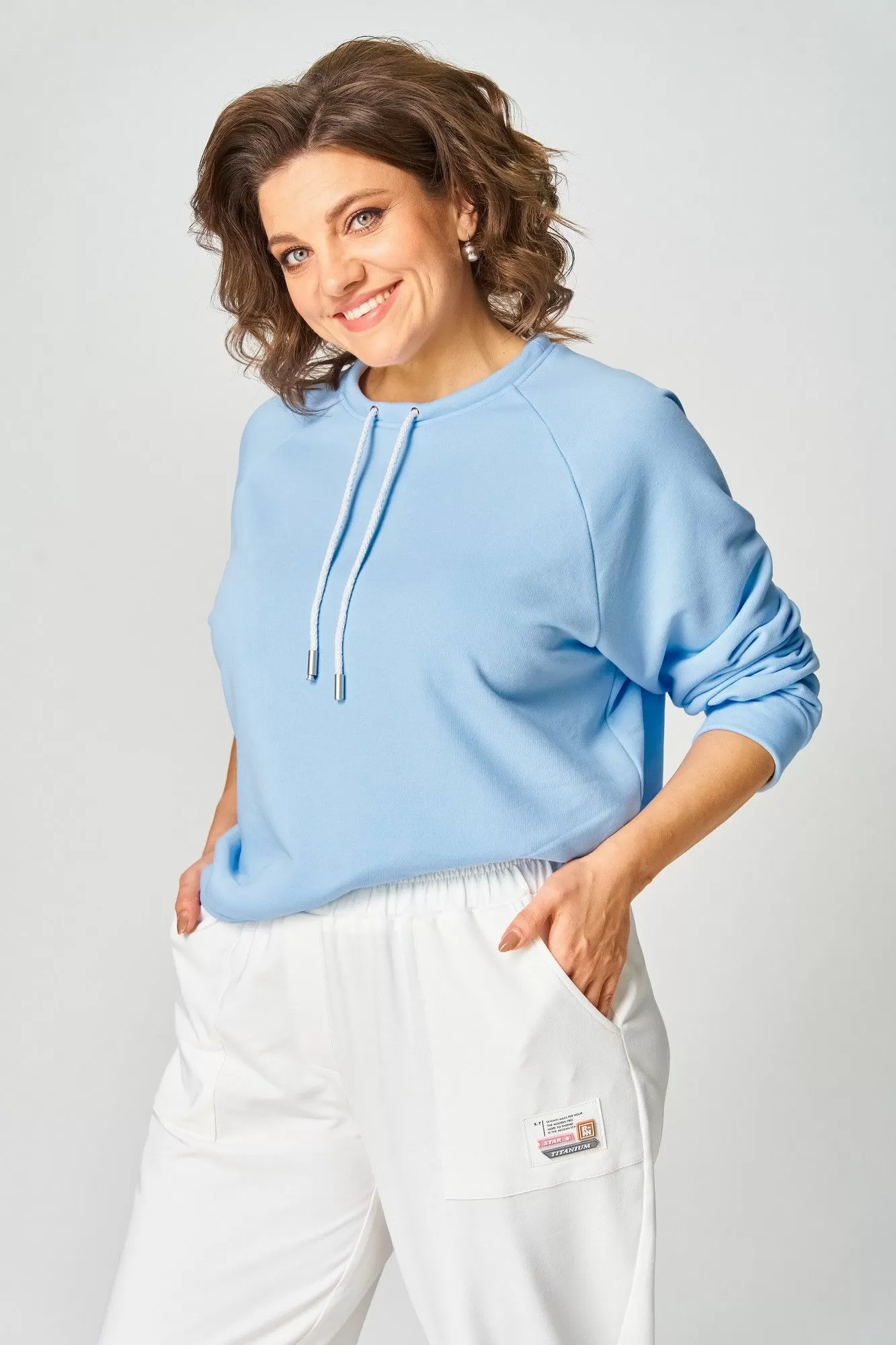 Джемпер женский из трикотажной хлопковой ткани (трехнитка). Рукав реглан. Низ рукава обработан притачной манжетой. Низ изделия оформлен притачным поясом. На спинке настрочен декоративный элемент. Вырез горловины круглый, обработан бейкой со шнуром.