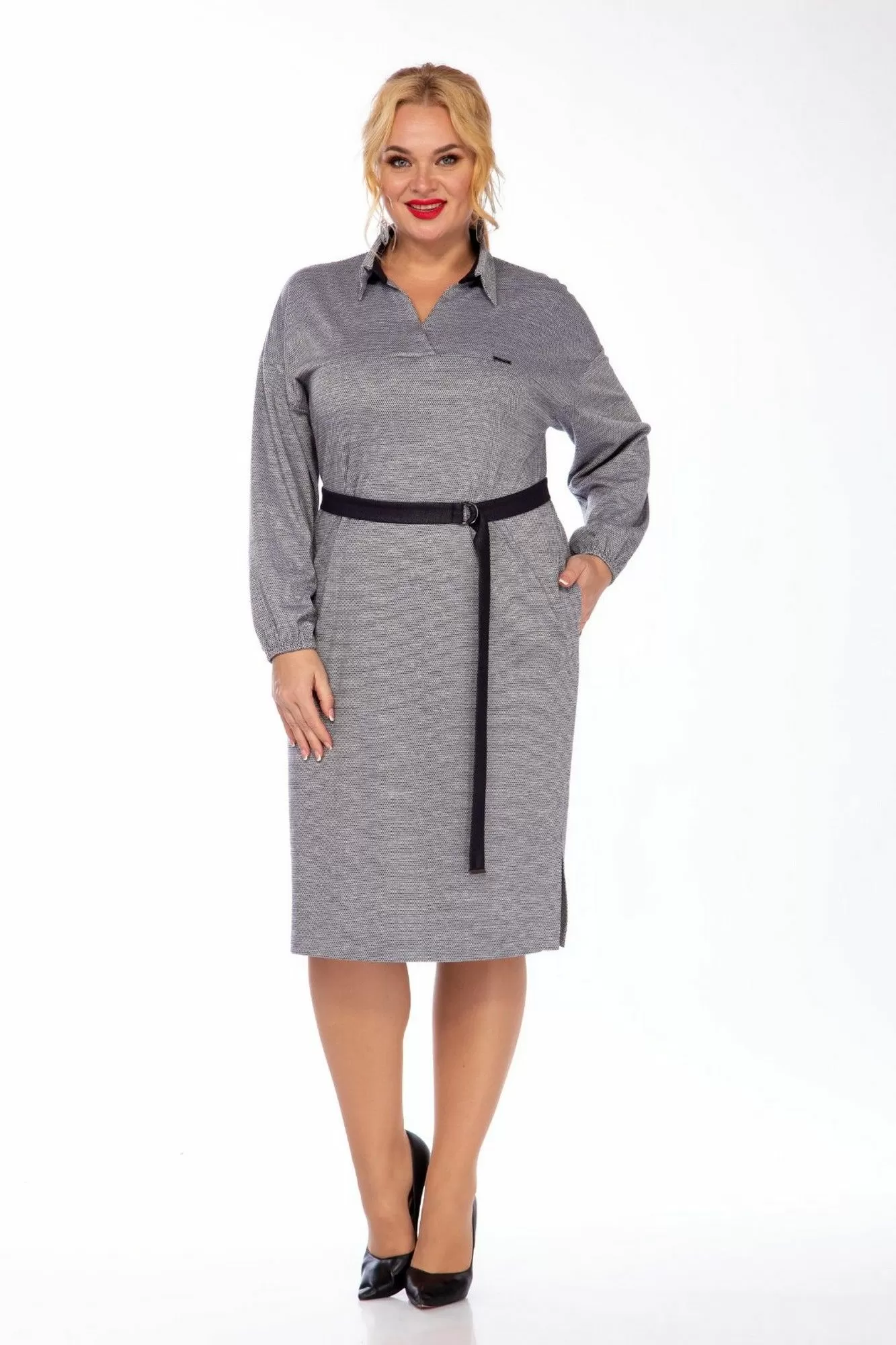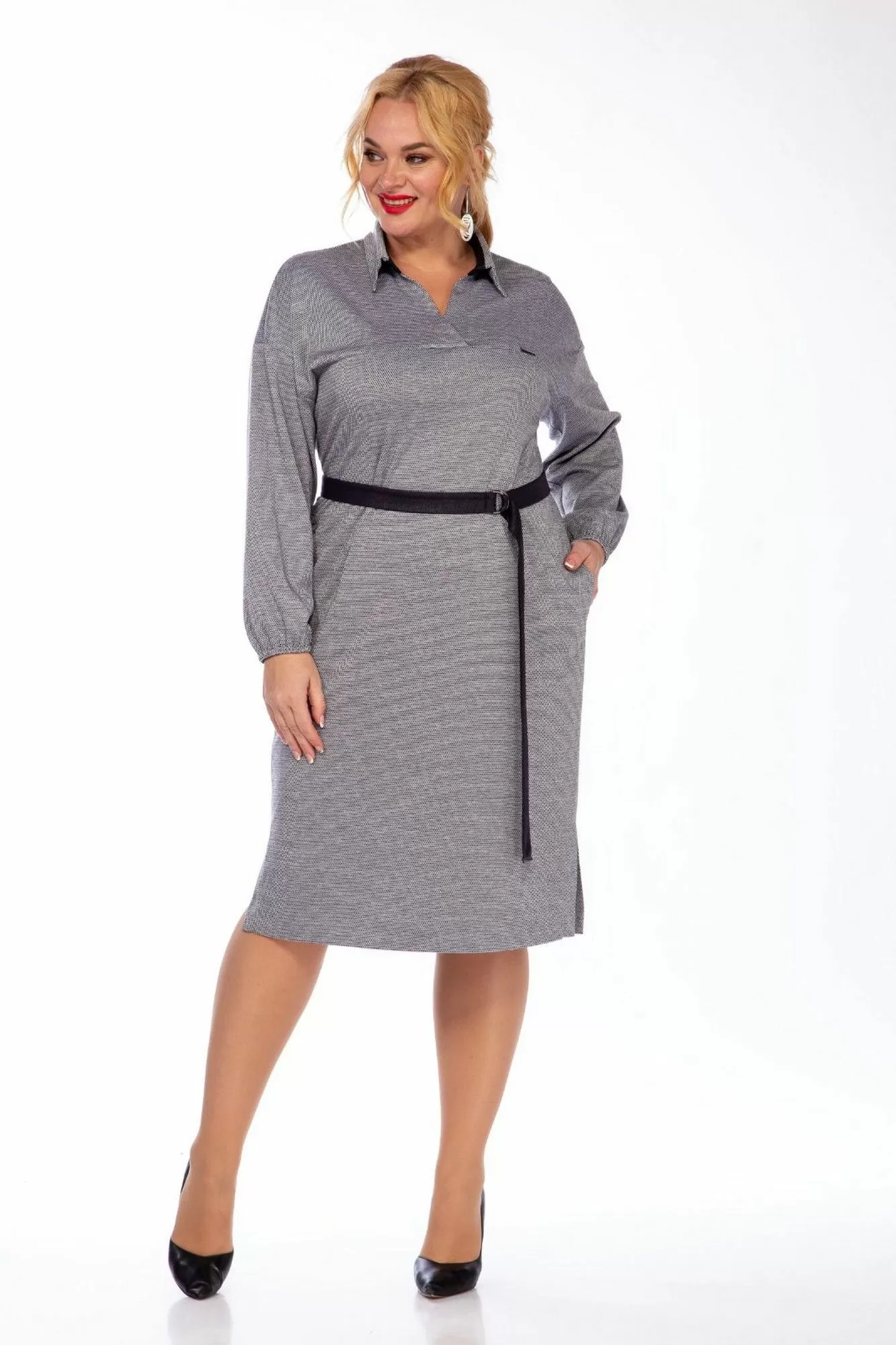 Силуэт полуприлегающий. Рукав со спущенной линией плеча, внизу на манжетах с резинкой, контрастного цвета. Длина рукава от горловины 70 см. Воротник рубашечного типа, на стойке контрастного цвета. Перед с отрезными кокетками, выполненными на запах. Край кокеток по линии горловины отделан кантиком контрастного цвета. На уровне бёдер в боковых швах выполнены потайные карманы. Внизу боковых швов выполнены разрезы. В комплекте к платью идёт пояс с застёжкой на пряжку. Конец пояса украшен металлическим зажимом. Длина платья по спинке 103см. Платье выполнено из трикотажного полотна.