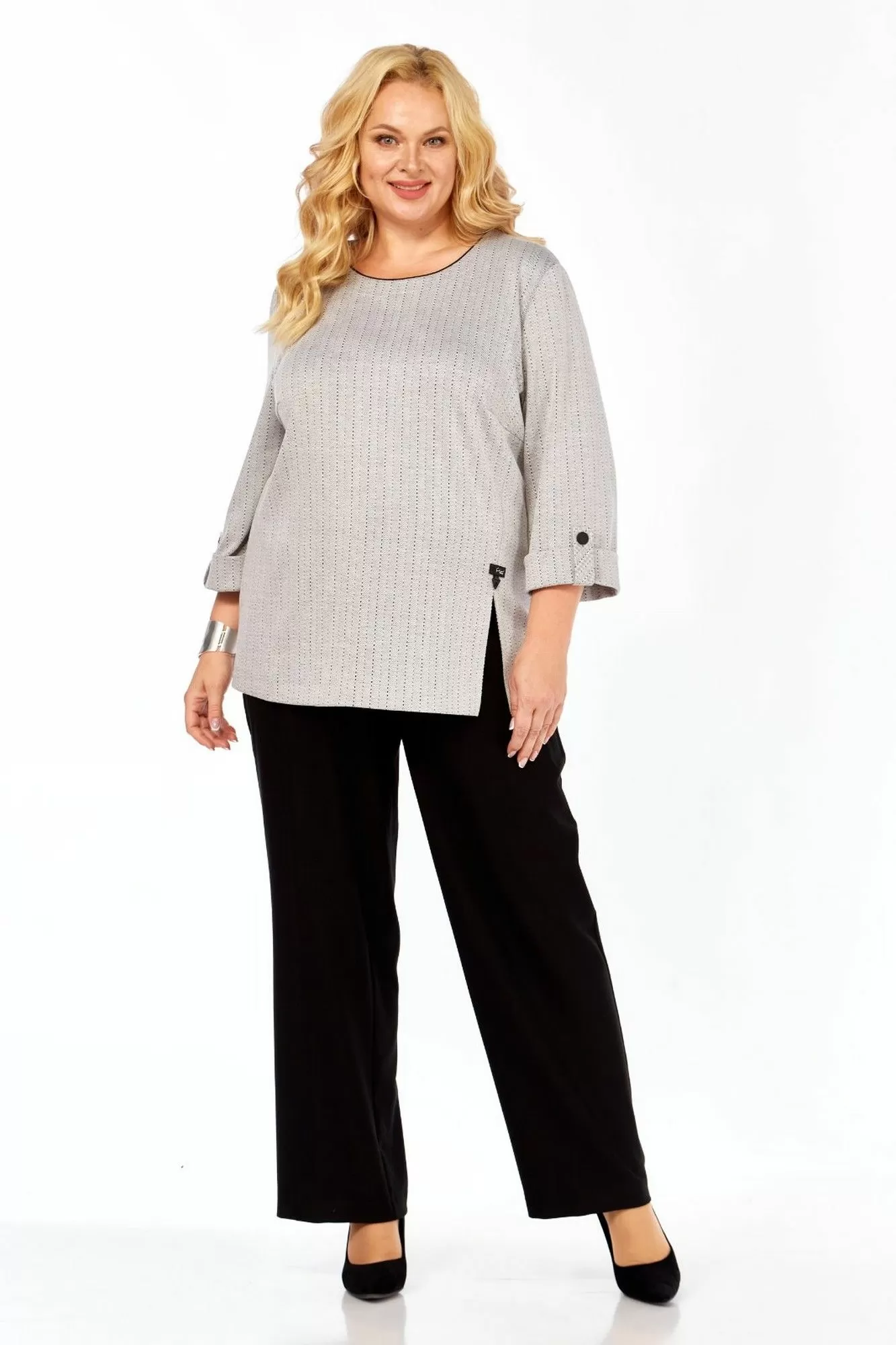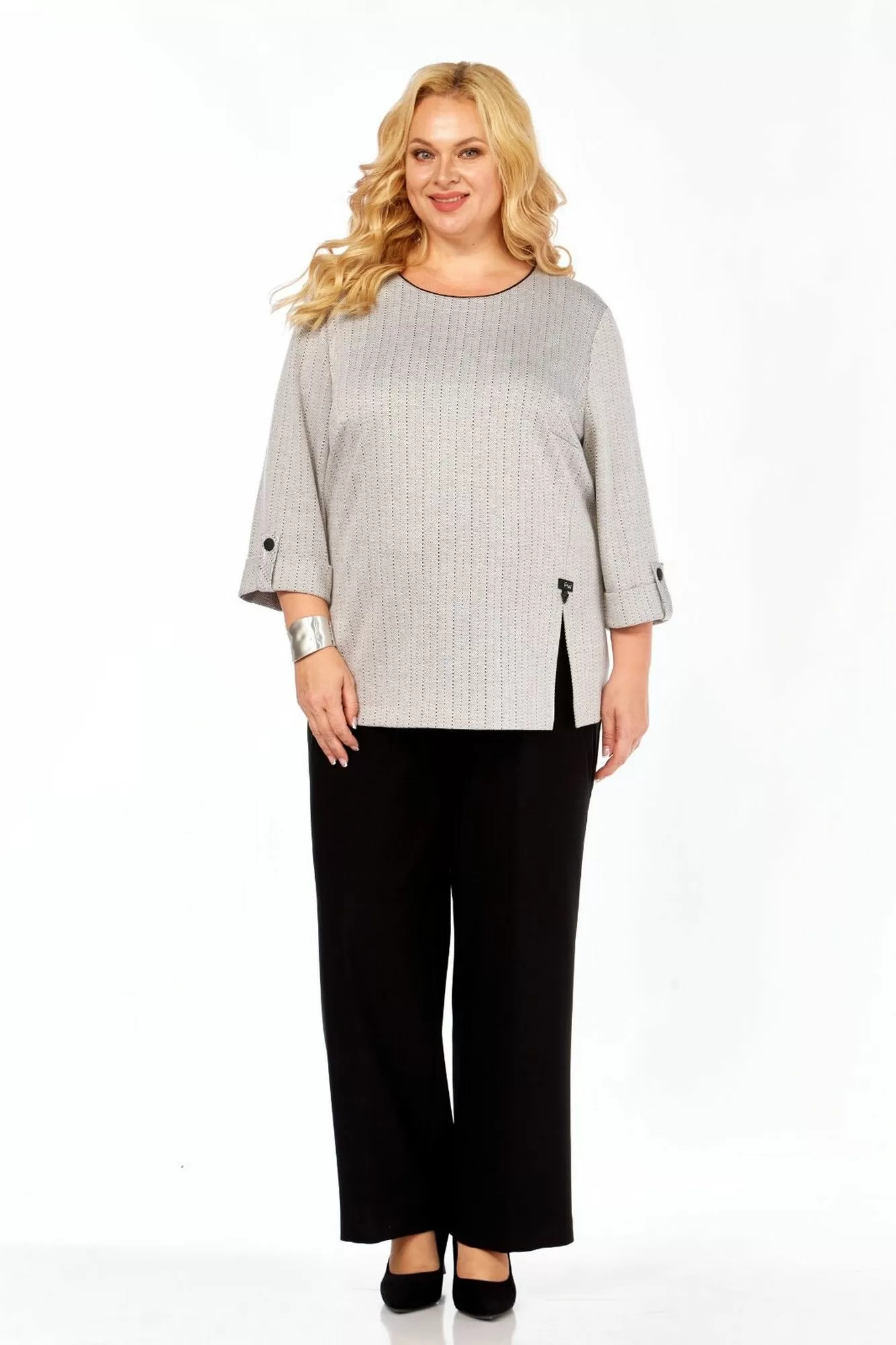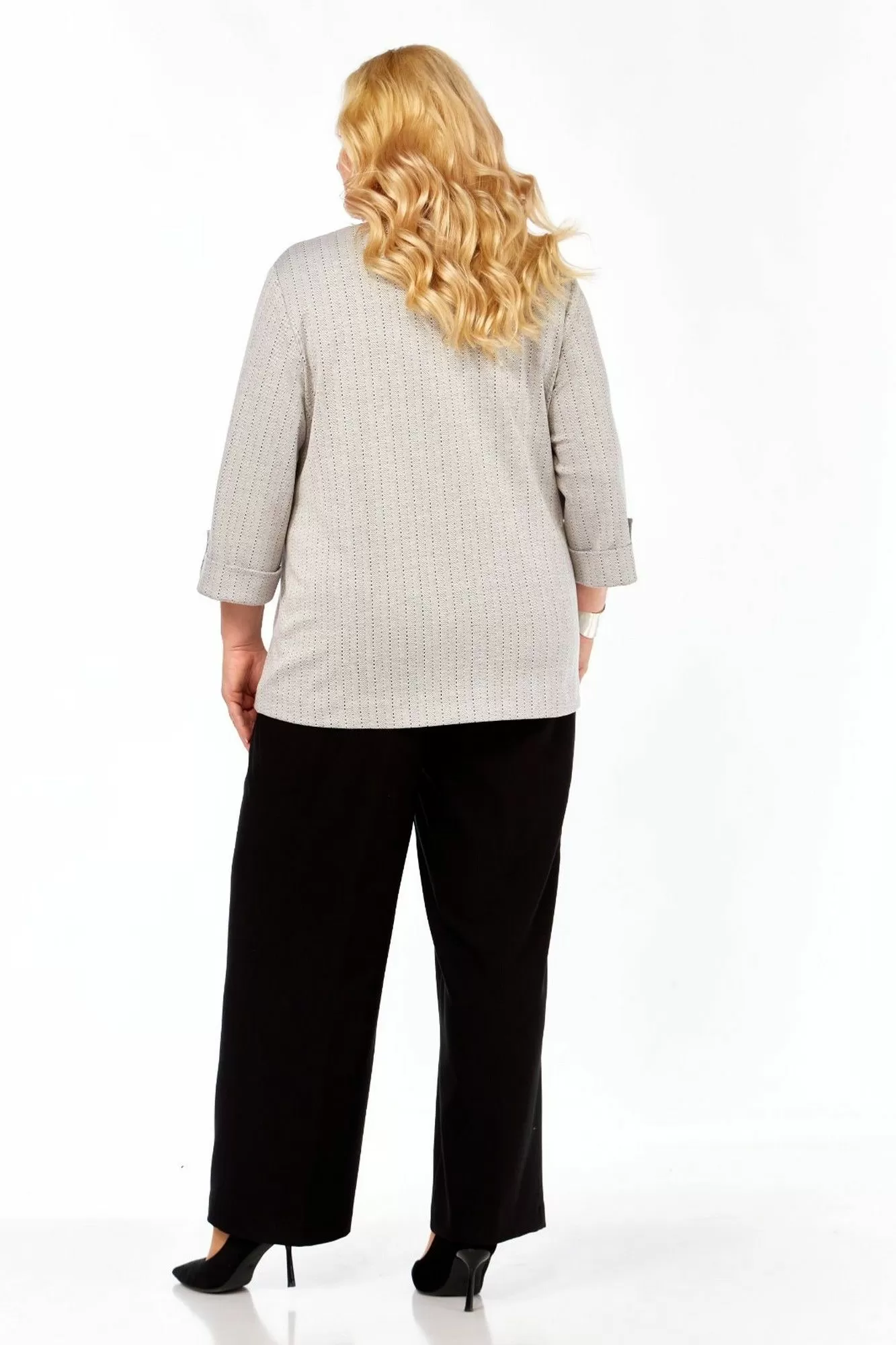 Силуэт полуприлегающий. Рукава втачные, одношовные. Длина рукава 45 см, внизу с отворотами, закреплённые патой с застёжкой на пуговицу. Горловина закруглённая, на обтачке с контрастным кантиком, которая закреплена отделочной строчкой. Перед с нагрудными вытачками. С левой стороны, от вытачки вниз выполнен рельеф с разрезом внизу. Разрез декорирован пришивным элементом. Длина джемпера 70 см. Джемпер выполнен из трикотажного полотна.