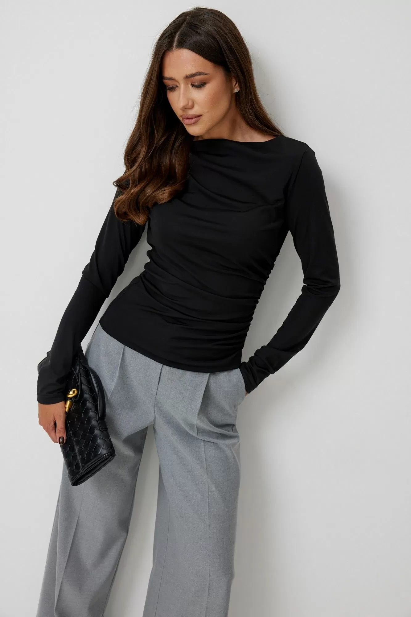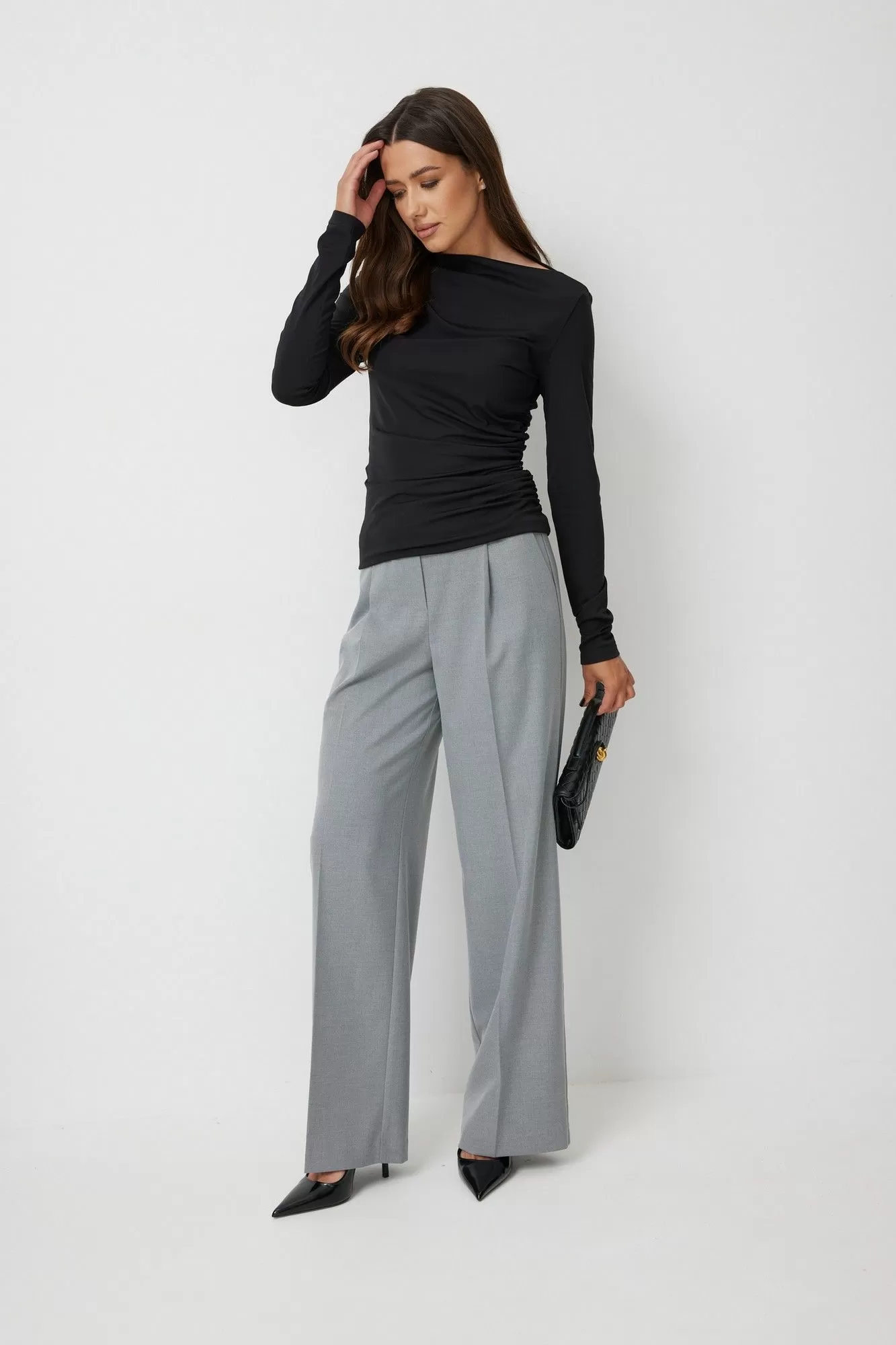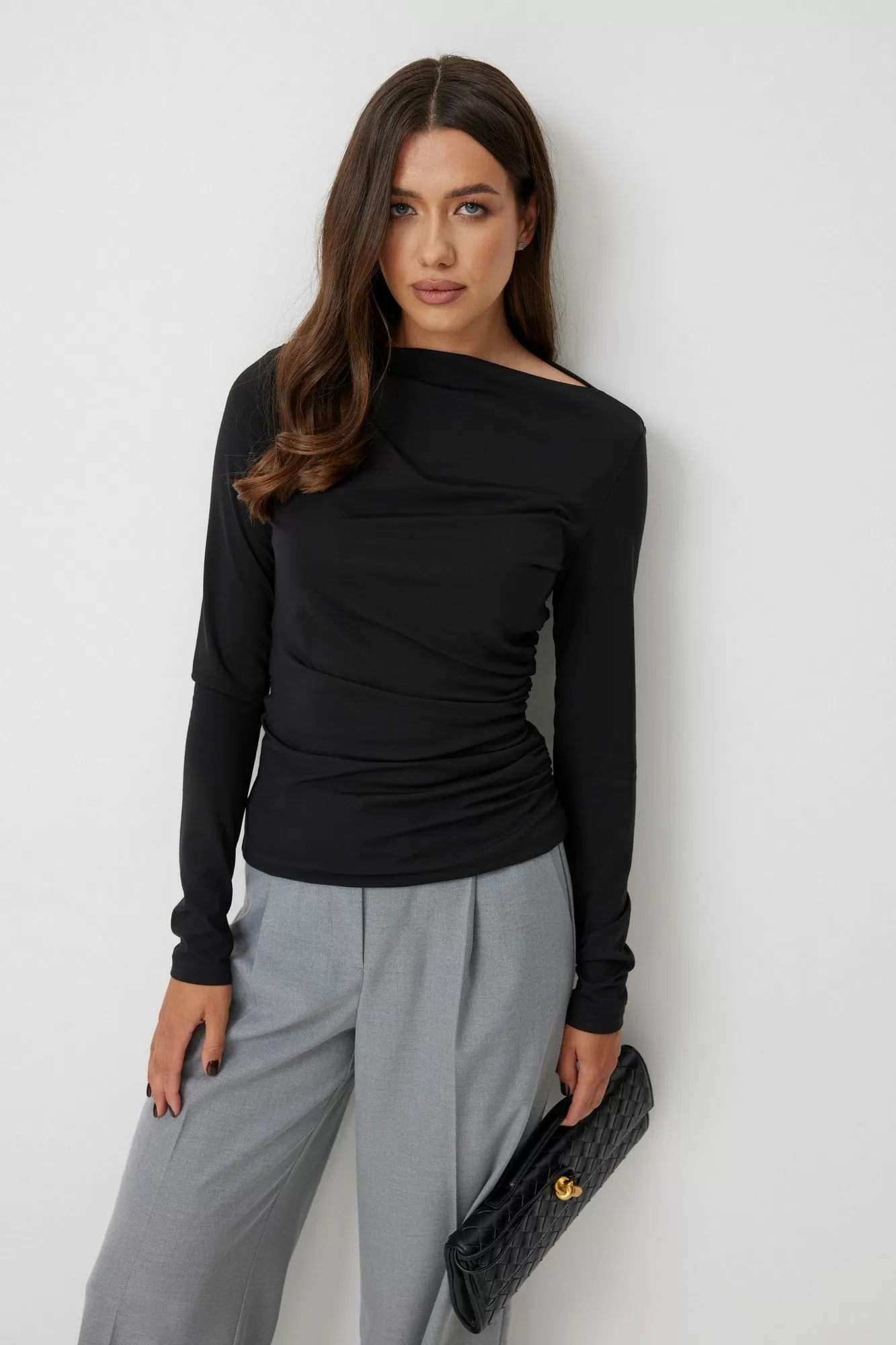 Джемпер женский прилегающего силуэта, выполнен из тонкого трикотажного полотна. По левому боковому шву джемпер присборен. Вырез горловины лодочкой. Рукава длинные, втачные одношовные. Спинка без среднего шва. Длина изделия по спинке 70 см, длина рукава 70 см.