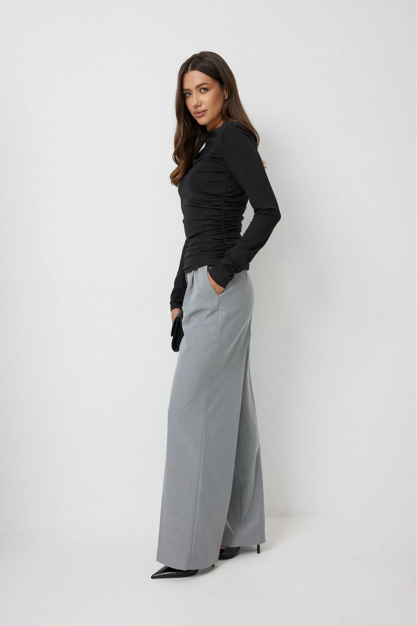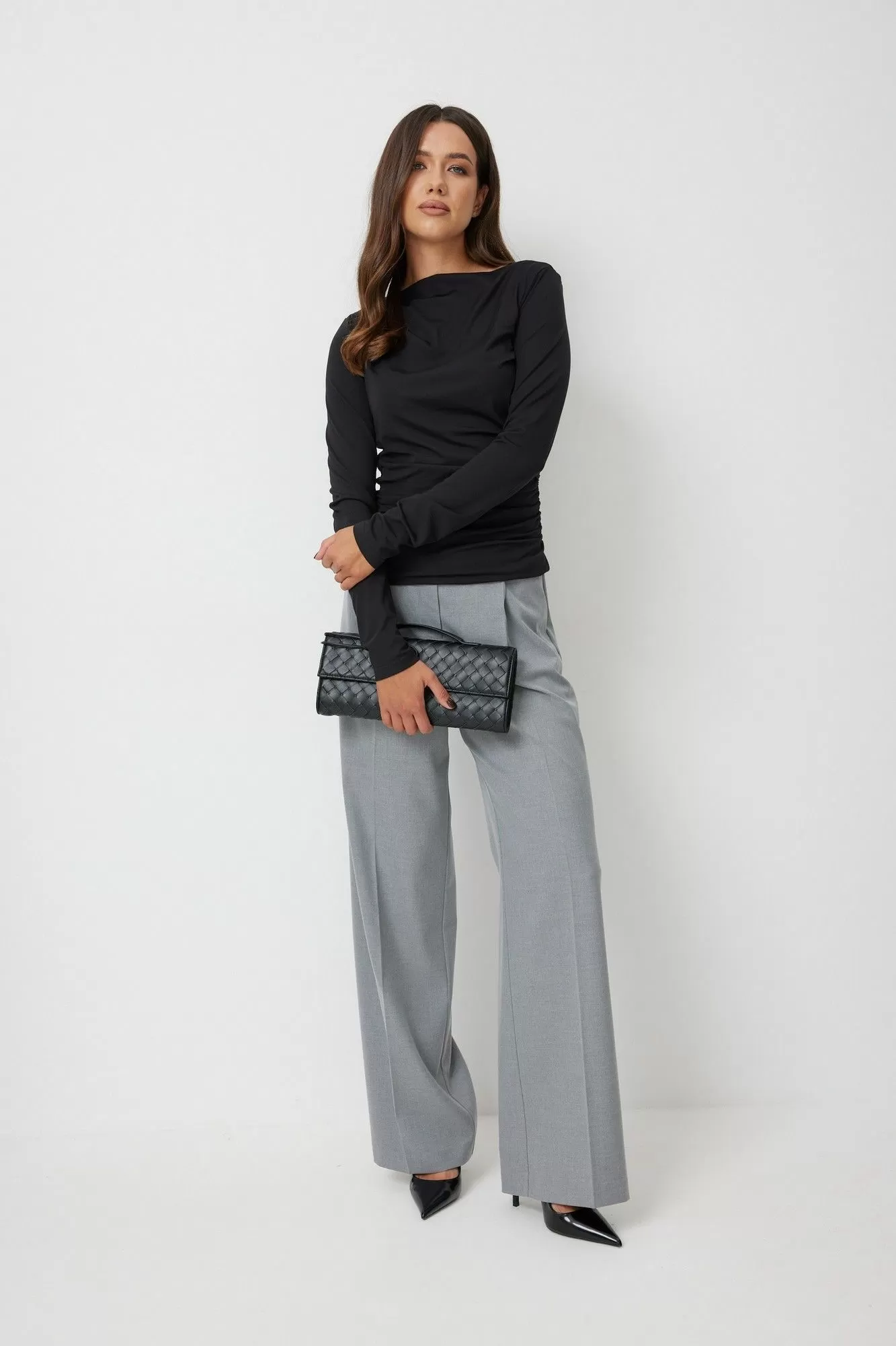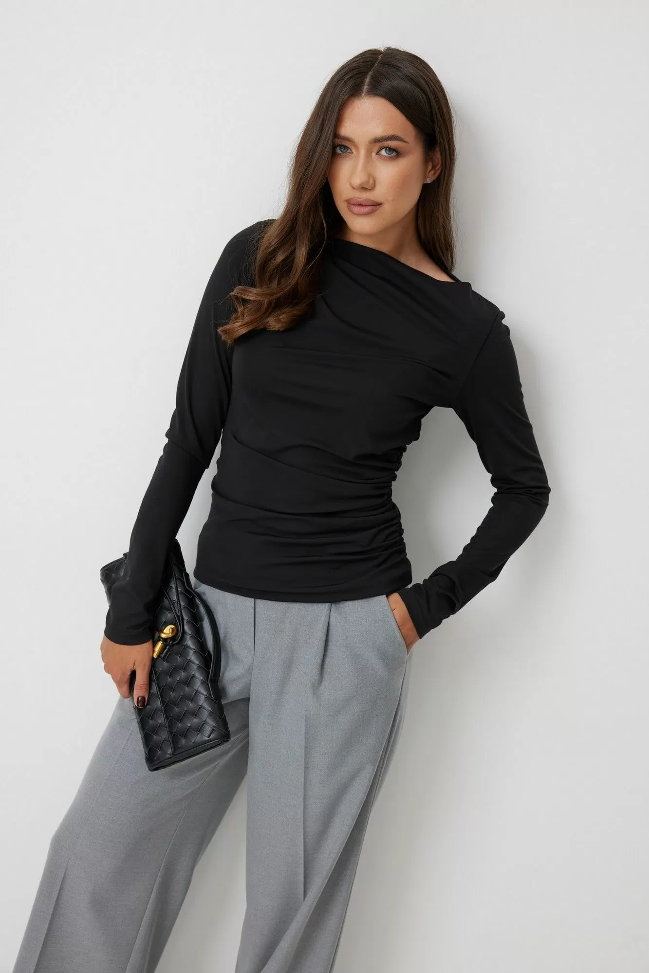 Джемпер женский прилегающего силуэта, выполнен из тонкого трикотажного полотна. По левому боковому шву джемпер присборен. Вырез горловины лодочкой. Рукава длинные, втачные одношовные. Спинка без среднего шва. Длина изделия по спинке 70 см, длина рукава 70 см.