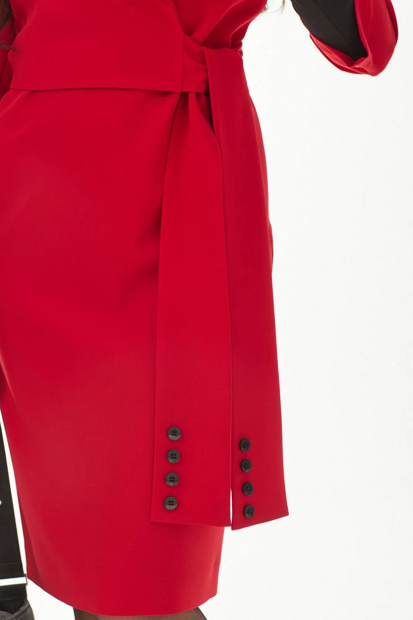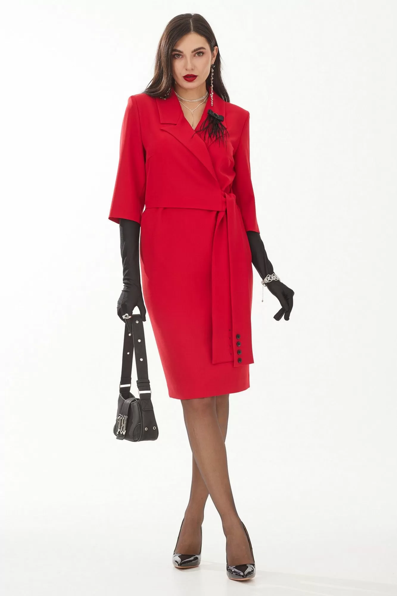 Платье полуприлегающего силуэта, выполненное из плательно-костюмной ткани, длиной миди. Одна из деталей лифа - отлетная, имитирующая образ комплекта "жакет и платье". Перед платья с нагрудными вытачками. Верхняя, жакетная часть платья завязывается на фигурный пояс, декорированный пуговицами. Спинка со средним швом и талиевыми вытачками. В нижней части среднего шва спинки обработана шлица. В левом боковом шве расположена потайная молния. Рукав втачной, двухшовный. Горловина платья оформлена воротником жакетного типа. Брошь в комплект не входит.