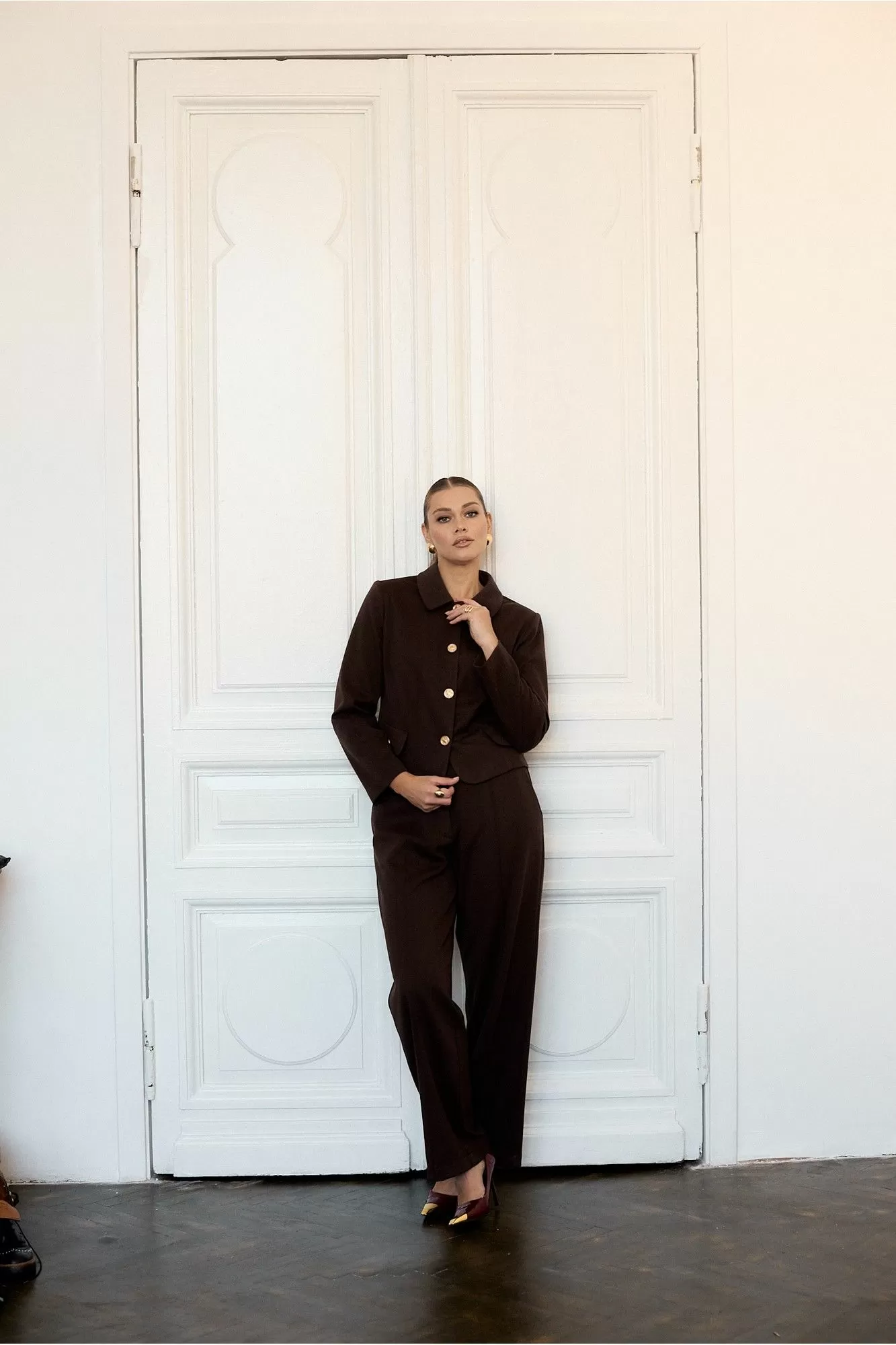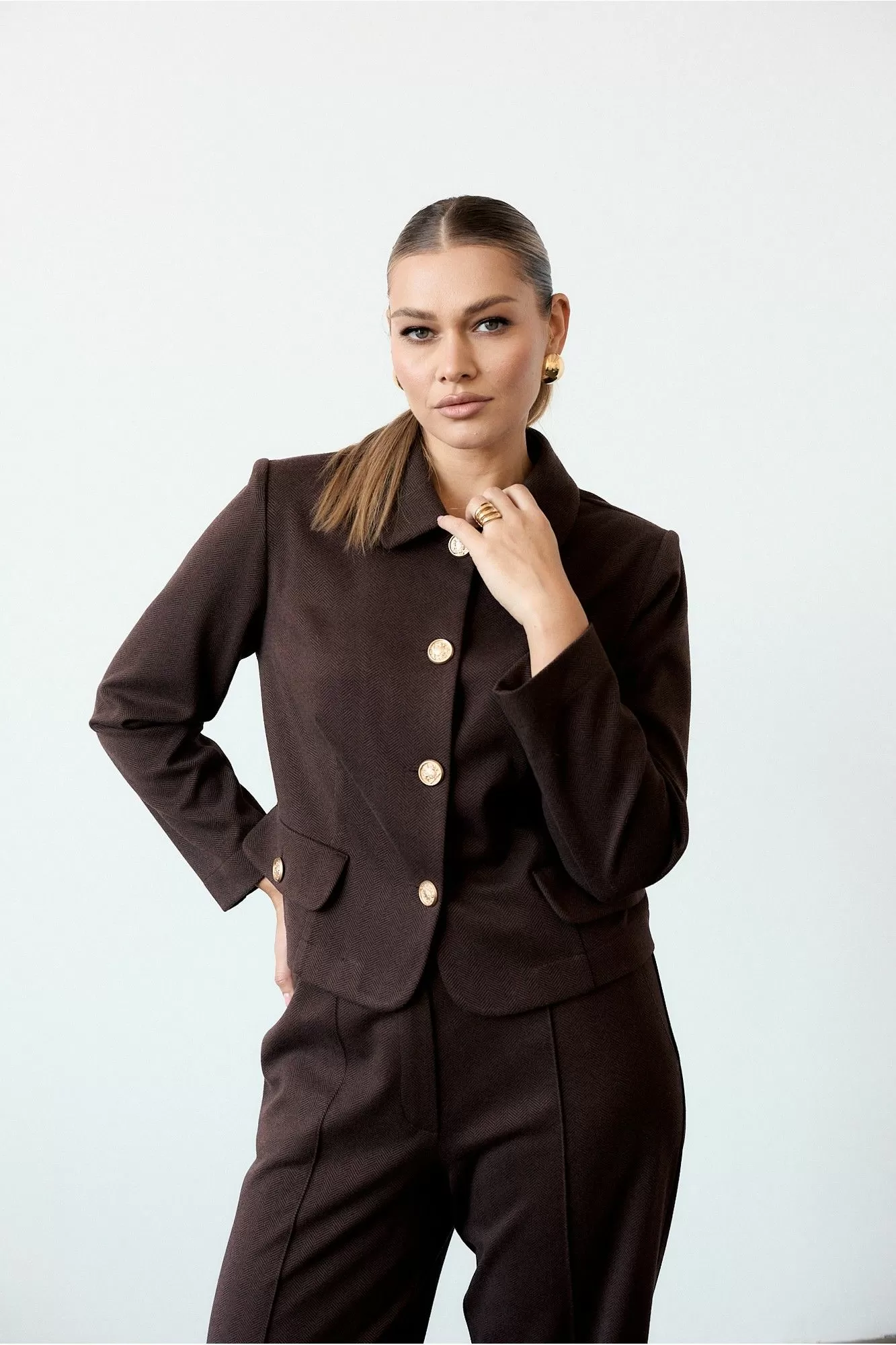 Жакет полуприлегающего силуэта, без подкладки с застёжкой на петли пуговицы. По переду декоративные клапаны. Воротник на отрезной стойке. Рукав втачной.